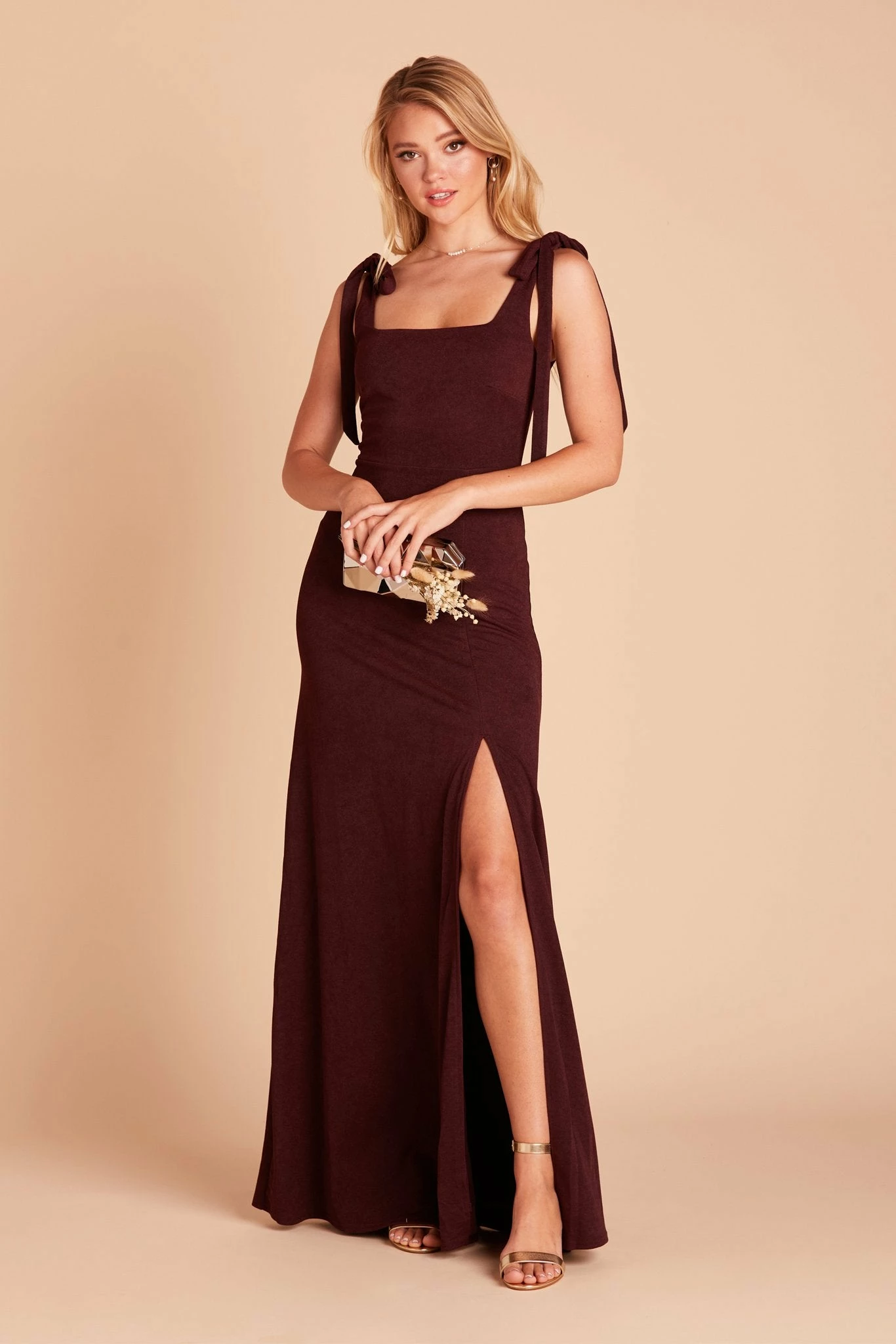 Our very first convertible crepe bridesmaid dress is equal parts modern and sweet. The square neckline is super flattering as it frames your collarbone and gives the illusion of being long and lean. The best part is that it comes with two extra straps that you can tie into a bow on each shoulder, instantly transforming this modern bridesmaid dress into a sweet look. Bows on or off, this is a dress for all the occasions.