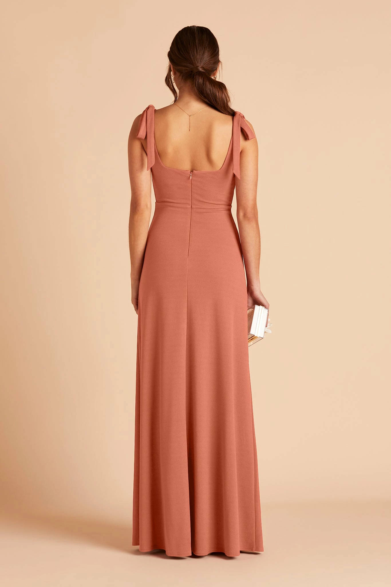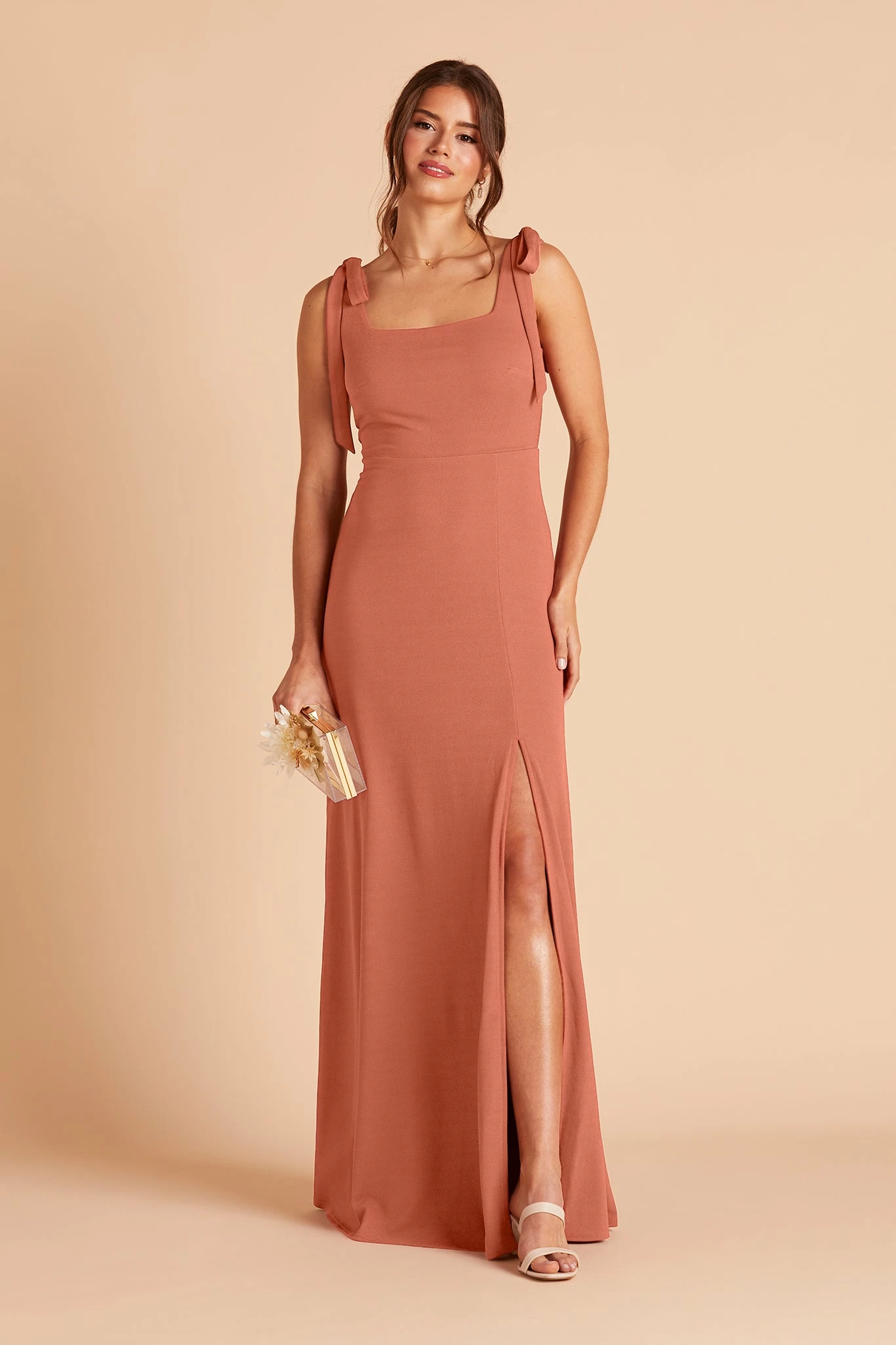 Our very first convertible crepe bridesmaid dress is equal parts modern and sweet. The square neckline is super flattering as it frames your collarbone and gives the illusion of being long and lean. The best part is that it comes with two extra straps that you can tie into a bow on each shoulder, instantly transforming this modern bridesmaid dress into a sweet look. Bows on or off, this is a dress for all the occasions.