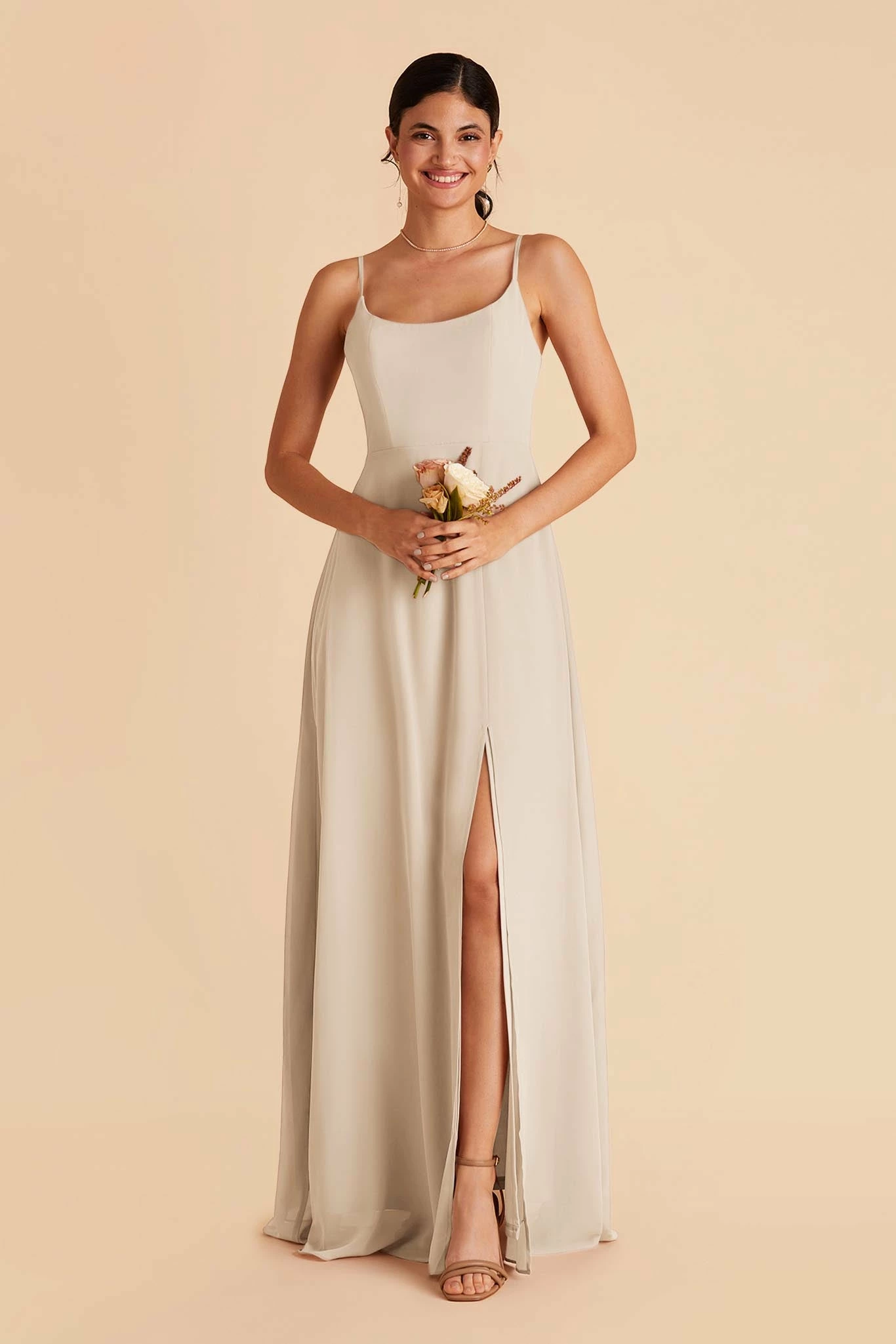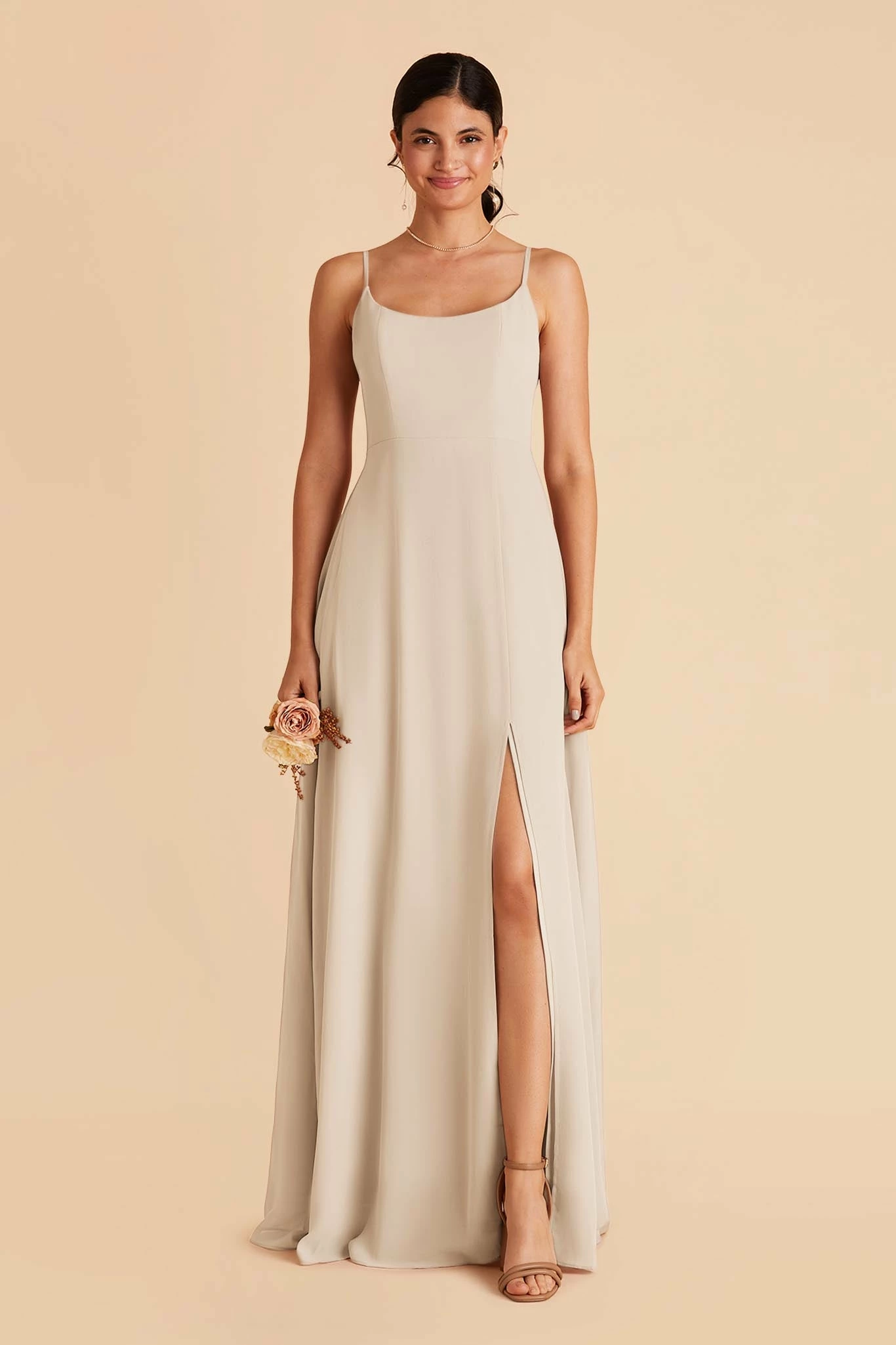 Amy features a wide scoop-neck design with dainty spaghetti straps. This dress also has our updated, slimmer skirt design, perfect for the no-fuss bridesmaid looking for a more modern touch. This versatile silhouette is perfect for any wedding, from a black-tie ceremony to a laid-back beach celebration.