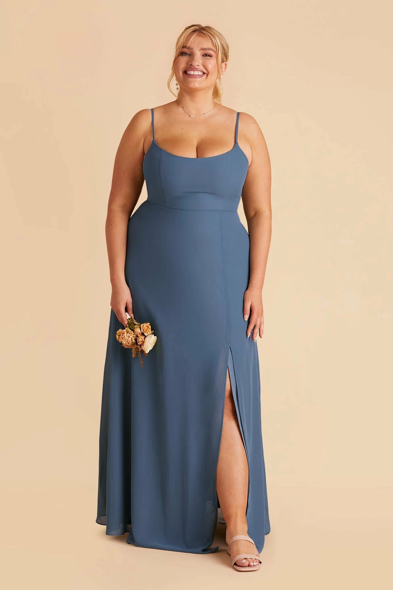 Amy features a wide scoop-neck design with dainty spaghetti straps. This dress also has our updated, slimmer skirt design, perfect for the no-fuss bridesmaid looking for a more modern touch. This versatile silhouette is perfect for any wedding, from a black-tie ceremony to a laid-back beach celebration.