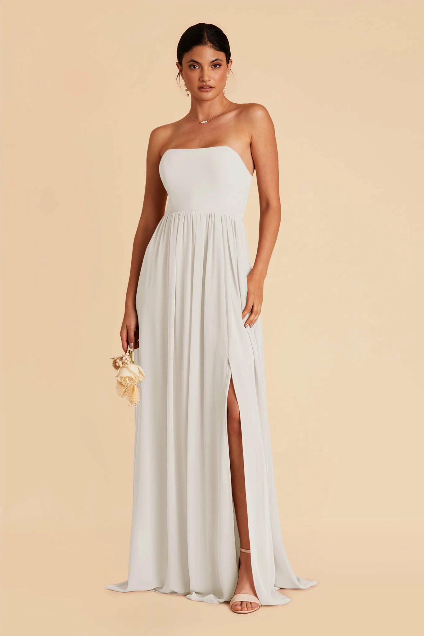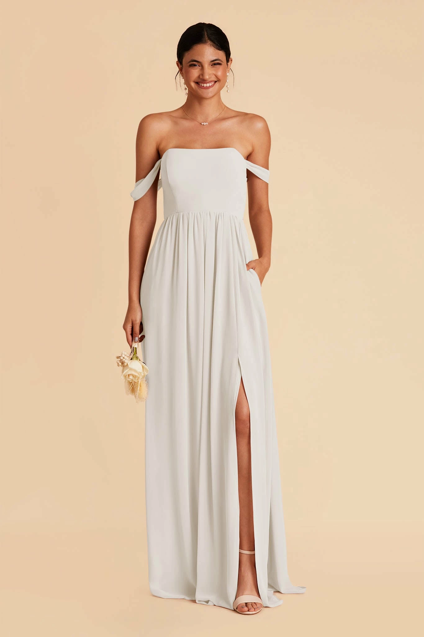 Less is absolutely more with this ultra-simple convertible dress. August features a straight neckline with removable straps. The bodice has boning for added structure and support. You can keep the straps on, remove it completely, or attach draped sleeves for an off-the-shoulder look.