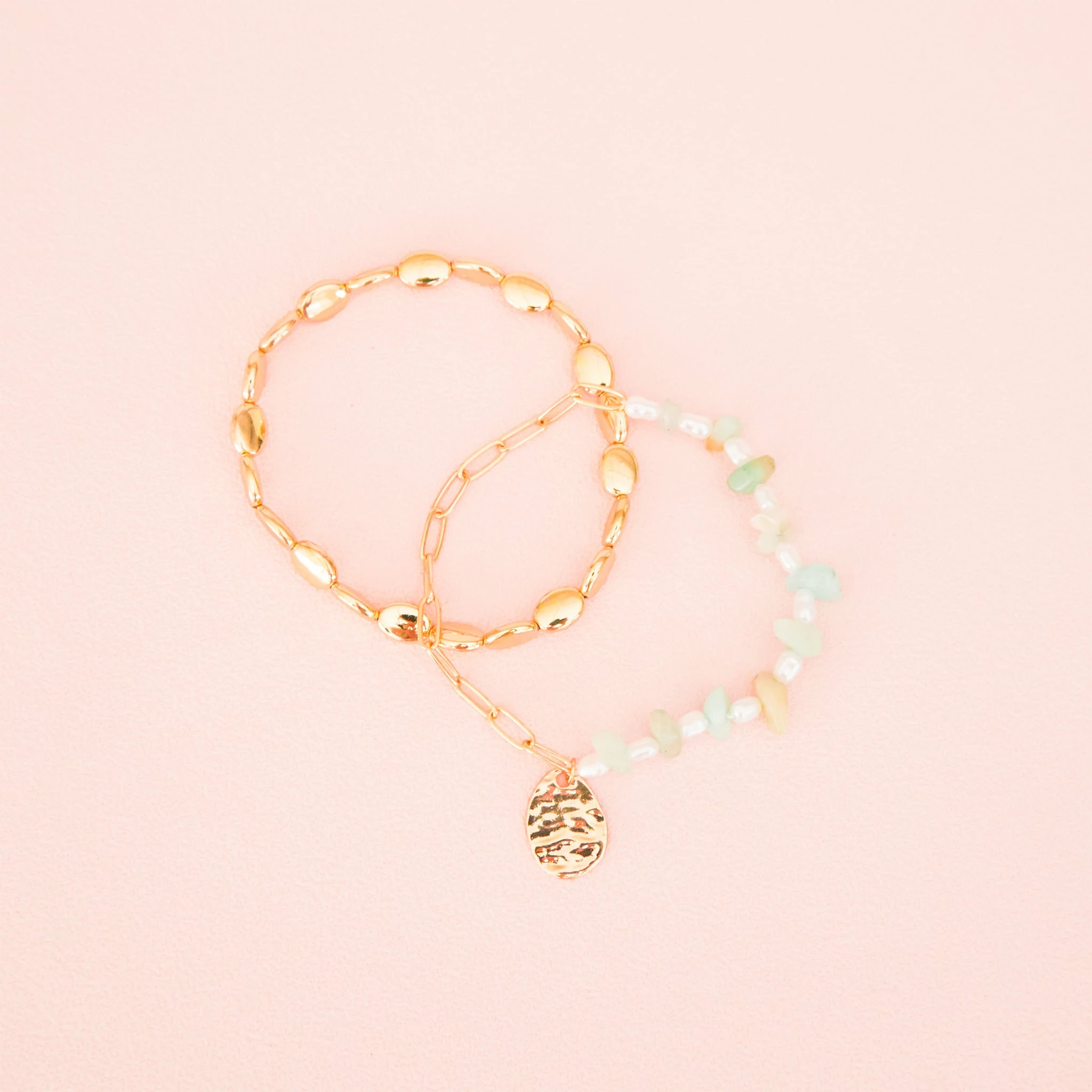 More is more with these stacking bracelets. This duo features one gold-chain bracelet and a second bracelet with alternated beachy stones and pearls. You’ll feel like a mermaid goddess anytime you slip them on your wrist.