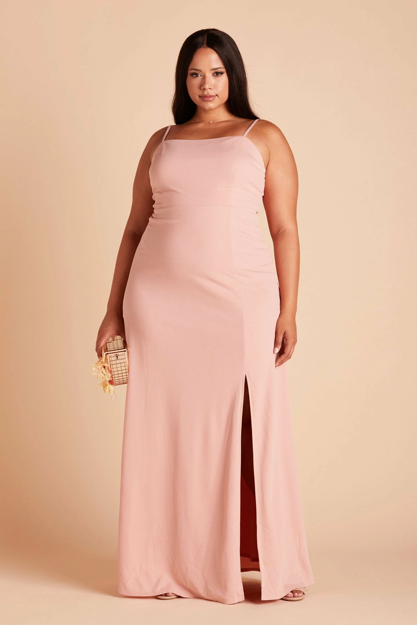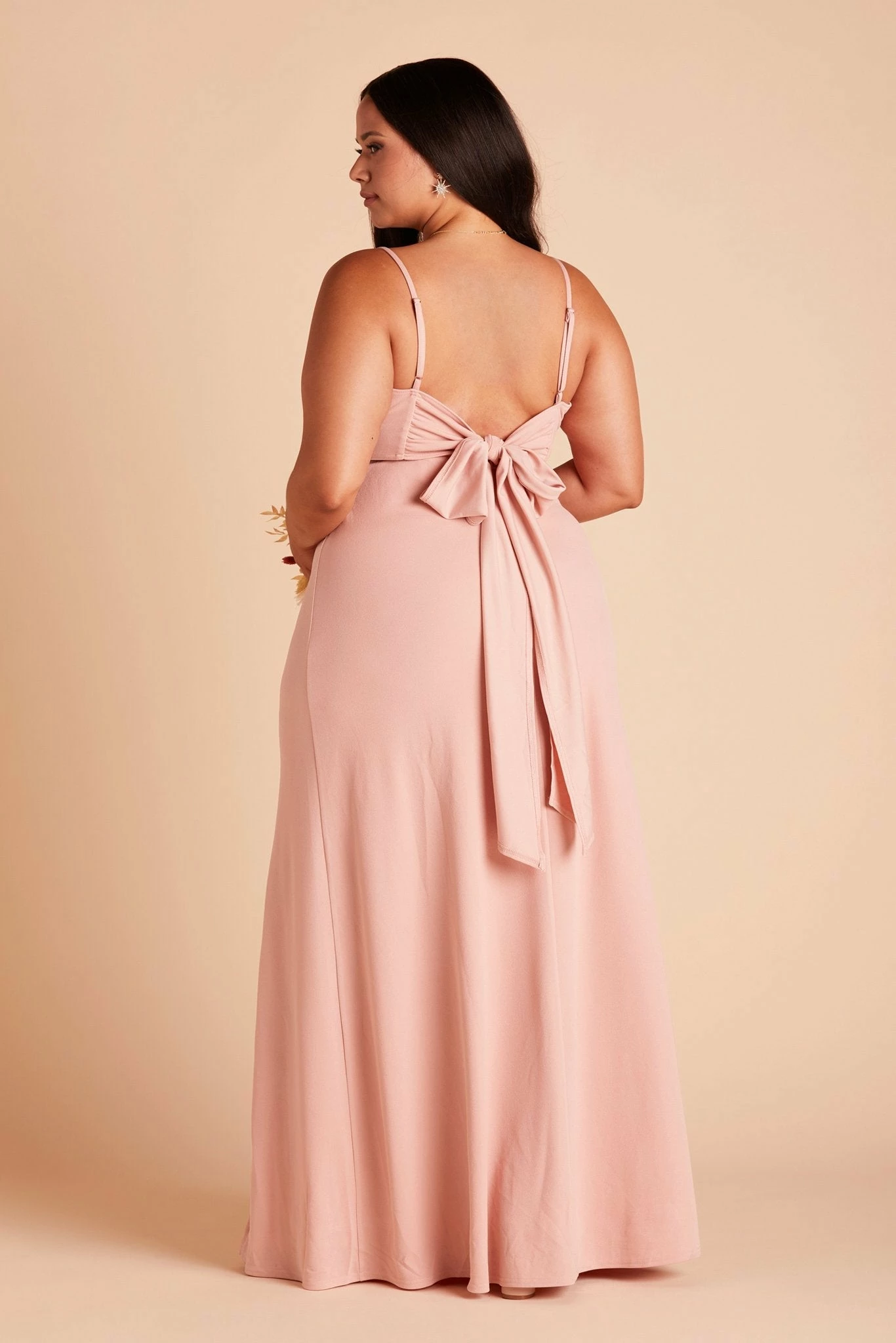 We put a bow on it. *wink* This simple spaghetti strap bridesmaid dress is perfectly body-skimming thanks to our stretchy knit crepe (read: super comfy) but our favorite detail is the bow in the back. Two long streamers make up this little accent, which you can tie on yourself or have a fellow bridesmaid help you out. We also love the flash of leg you get with a slit in the front.
