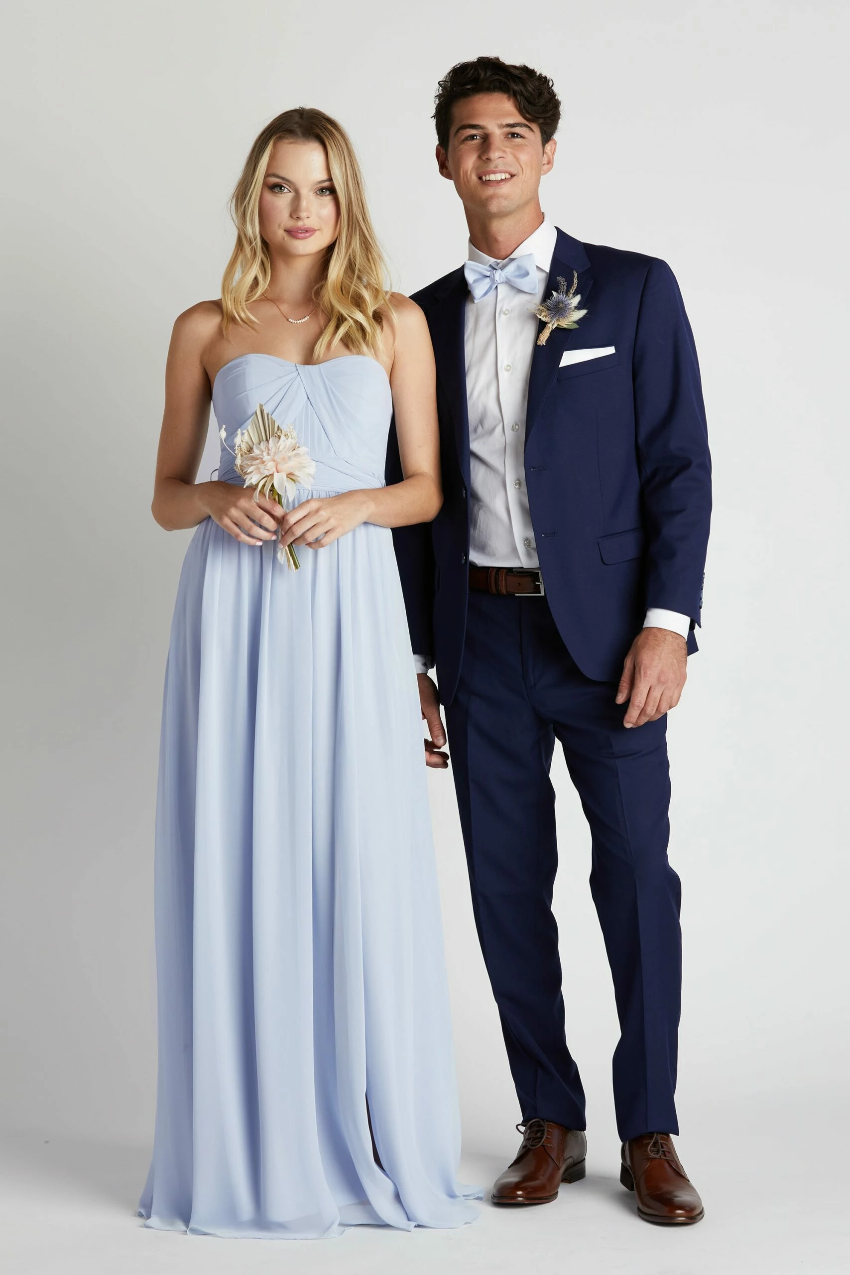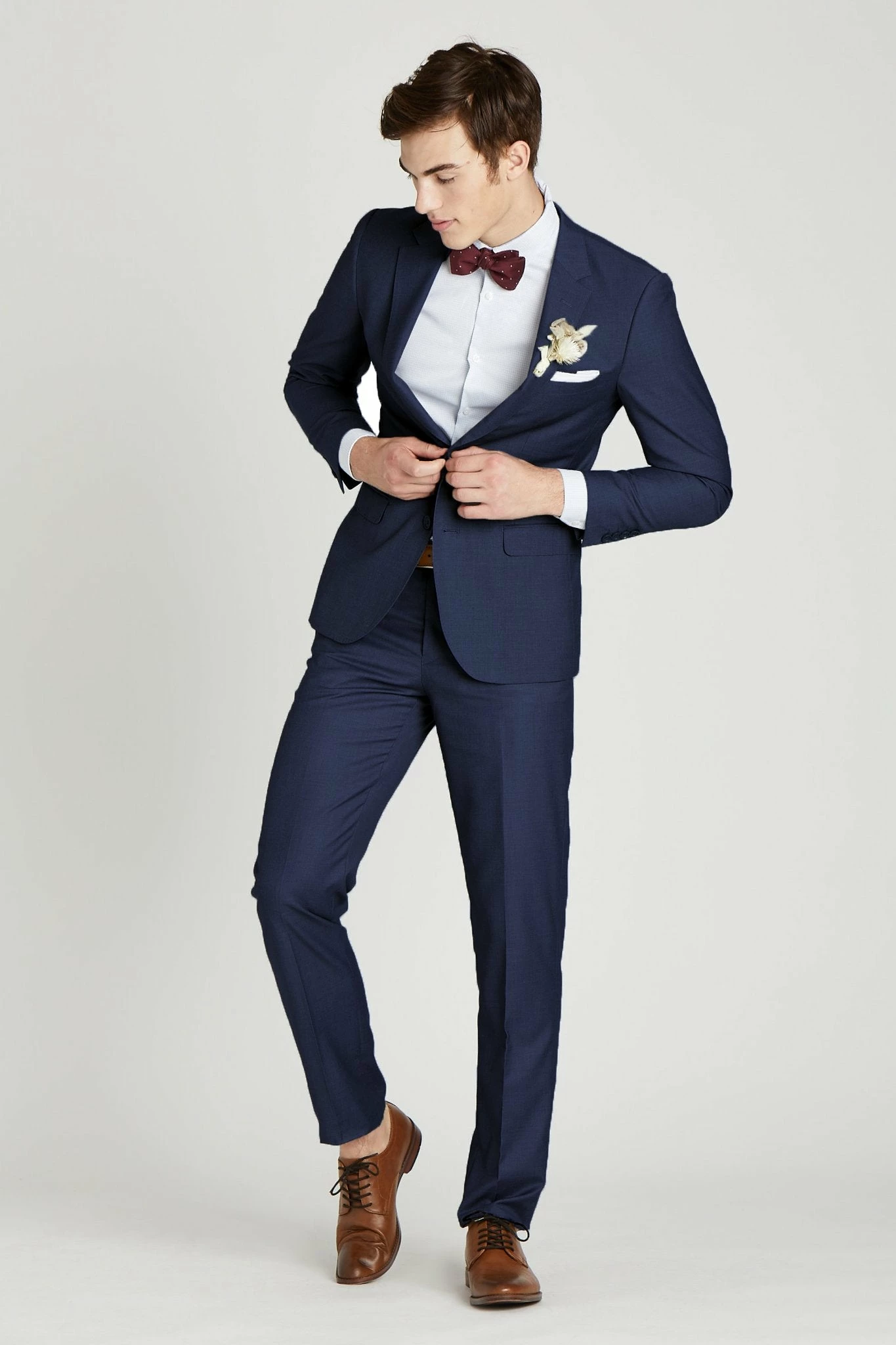Dapper is your middle name. This groomsmen suit from SuitShop is here to make a statement. Its rich blue color is meant to pop in photos because hey, why should bridesmaids get to have all the fun? *wink* The fully lined jacket has a notch lapel, flap pockets and a two-button closure, while the pants come with an unfinished hem and split waist construction for easy alteration and slant front pockets. Don’t forget to pair it with one of our skinny neck ties or bow ties for an even more polished look! *Fulfilled by our friends at SuitShop