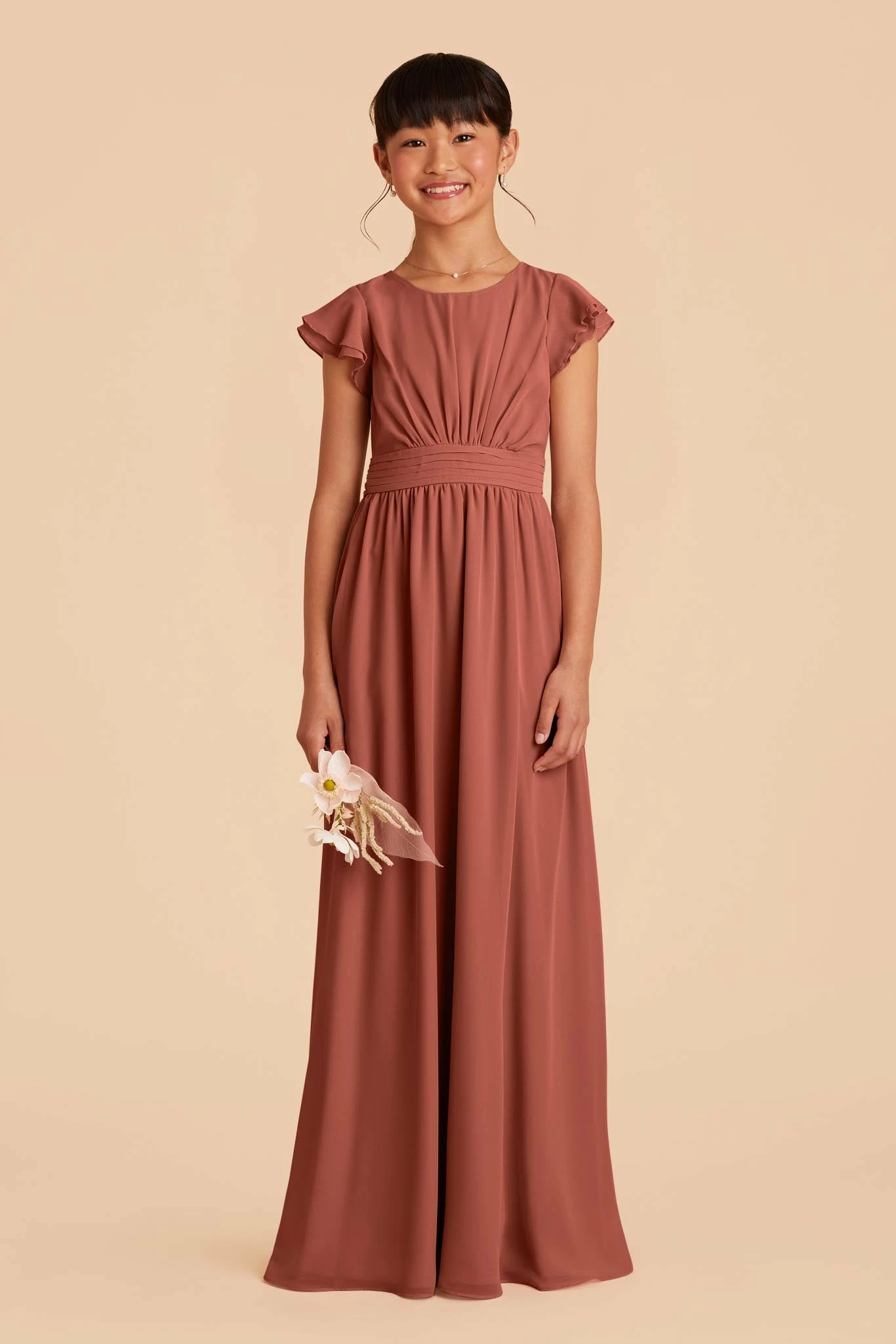 This sweet ruffle-sleeved dress is a dream for a junior bridesmaid. This design features a waistband tie in back for juniors who are between sizes.