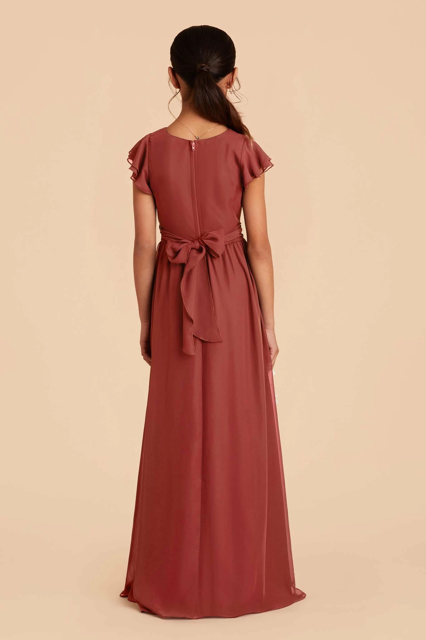 This sweet ruffle-sleeved dress is a dream for a junior bridesmaid. This design features a waistband tie in back for juniors who are between sizes.