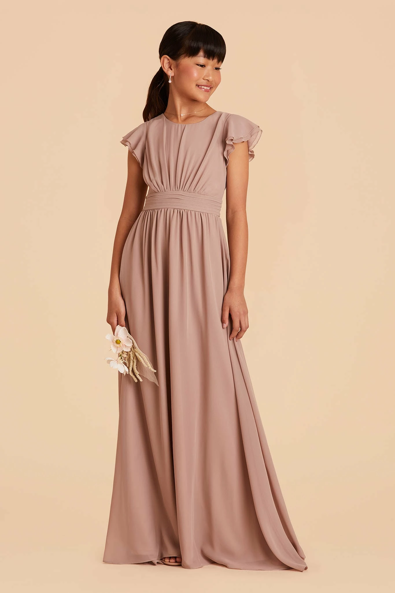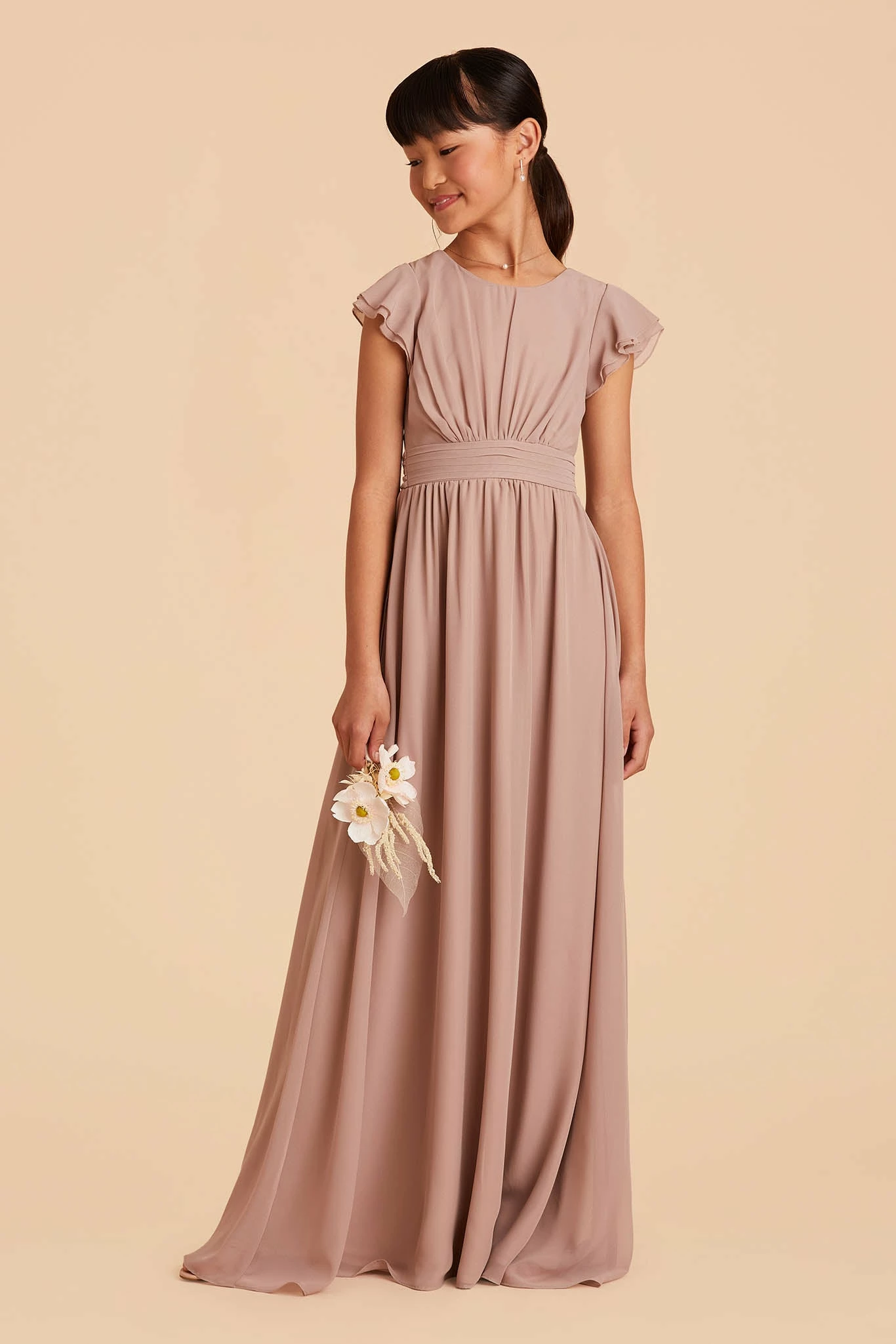 This sweet ruffle-sleeved dress is a dream for a junior bridesmaid. This design features a waistband tie in back for juniors who are between sizes.