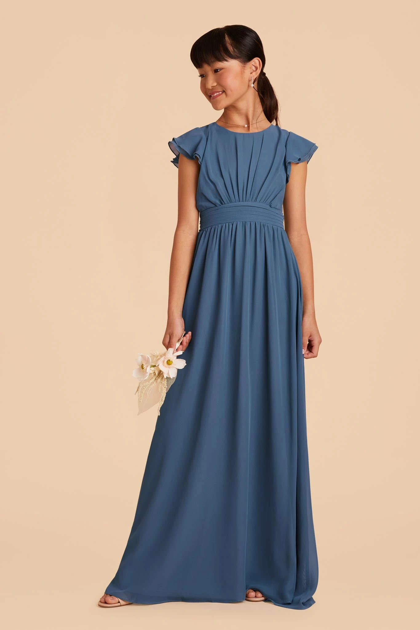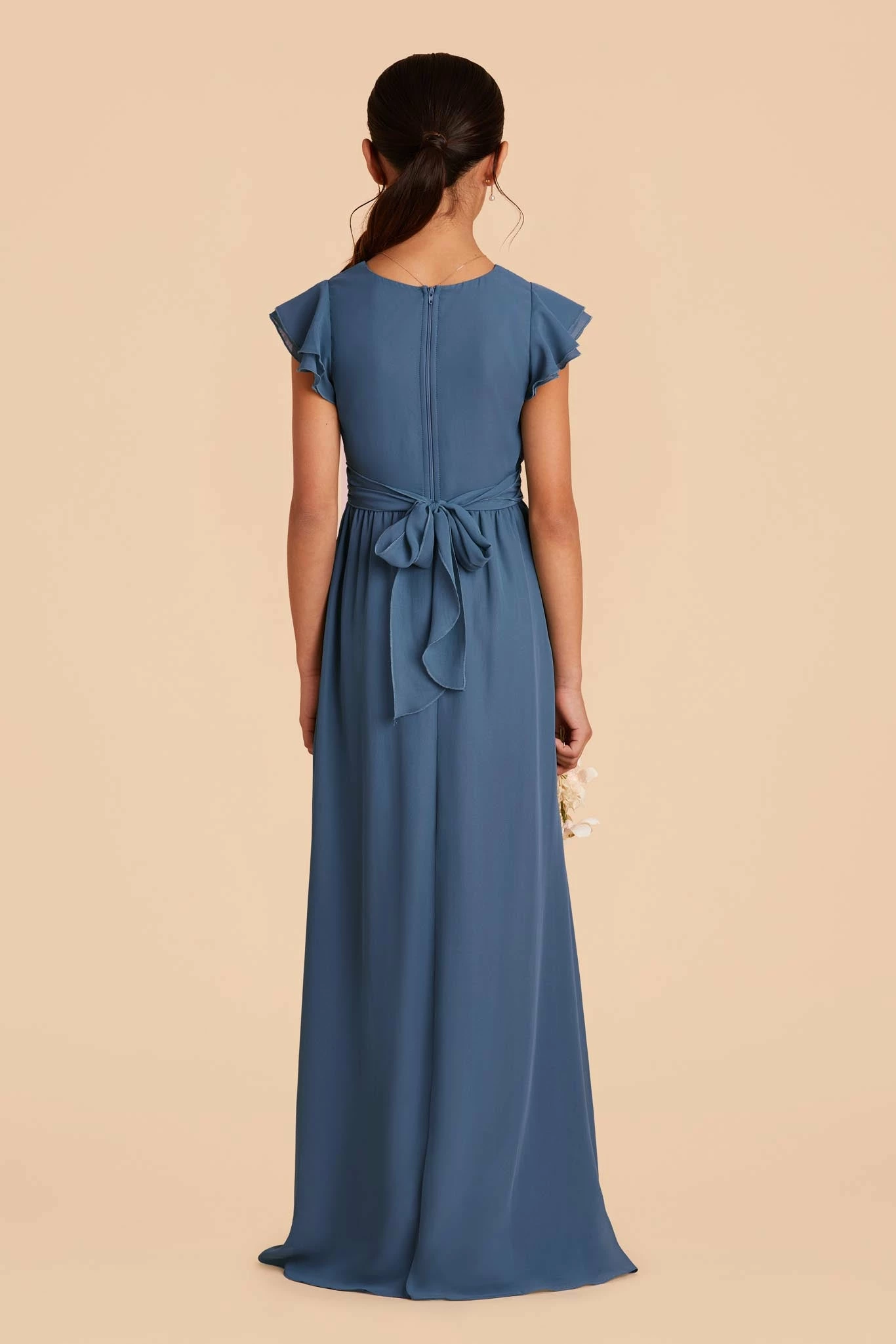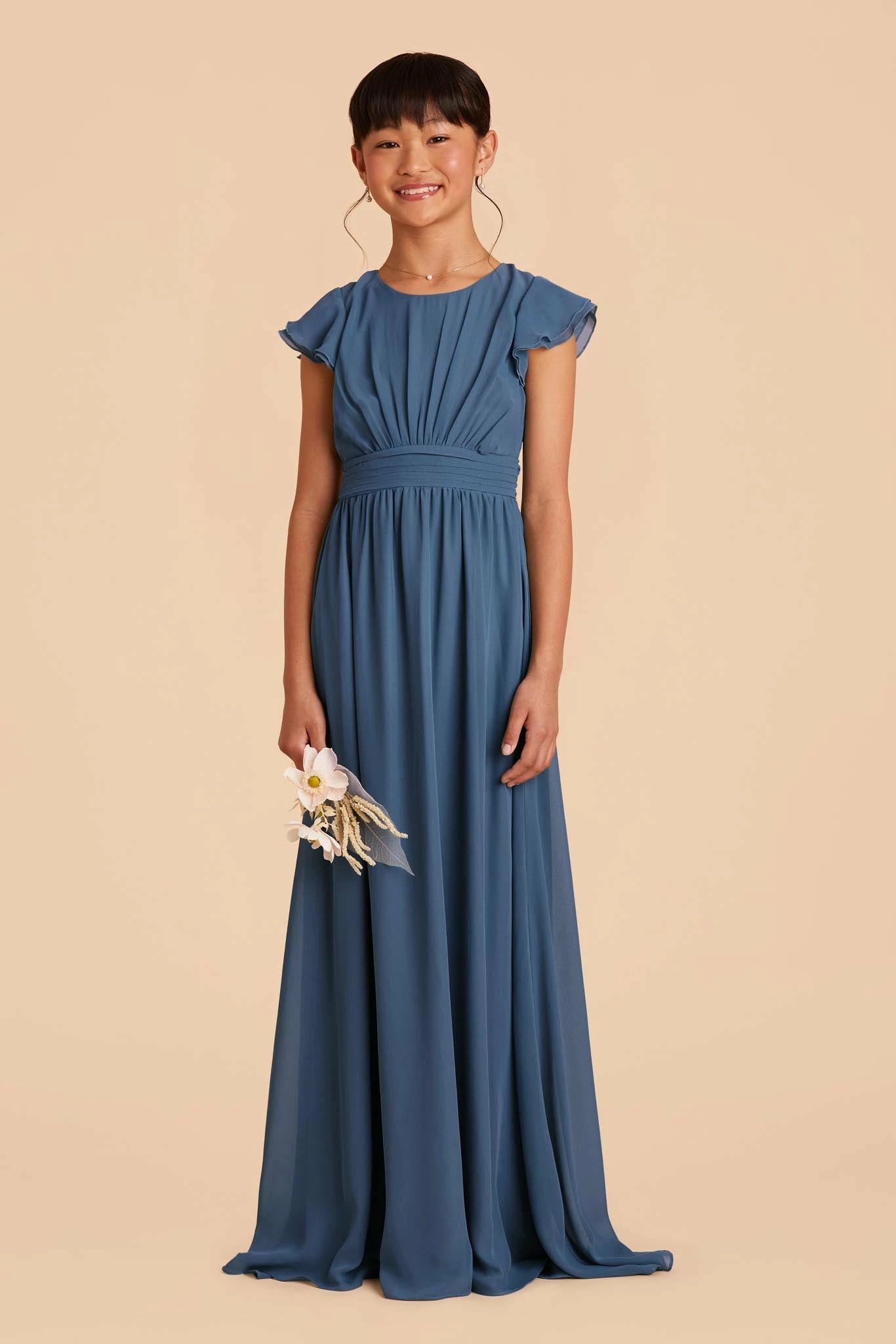 This sweet ruffle-sleeved dress is a dream for a junior bridesmaid. This design features a waistband tie in back for juniors who are between sizes.