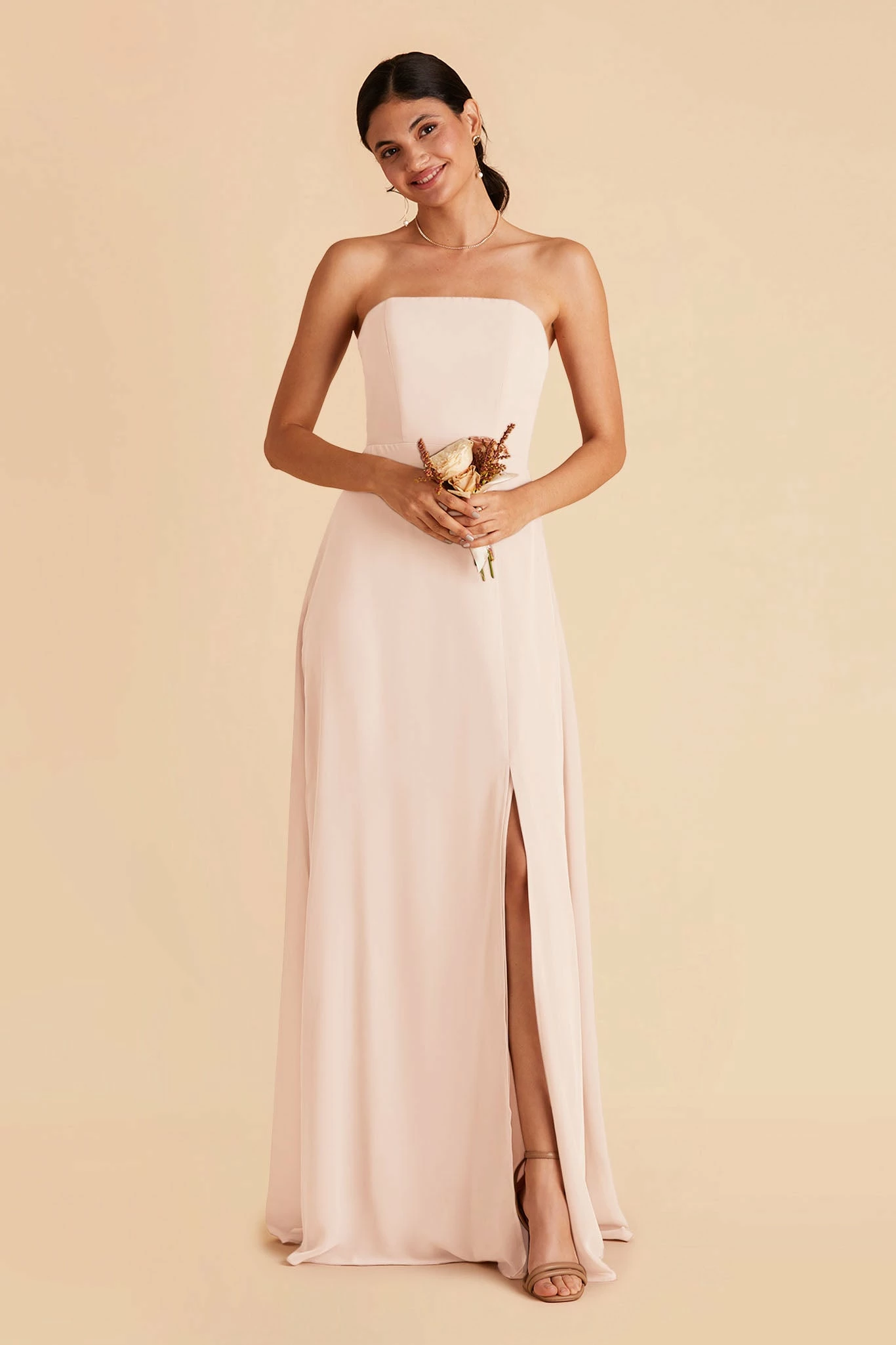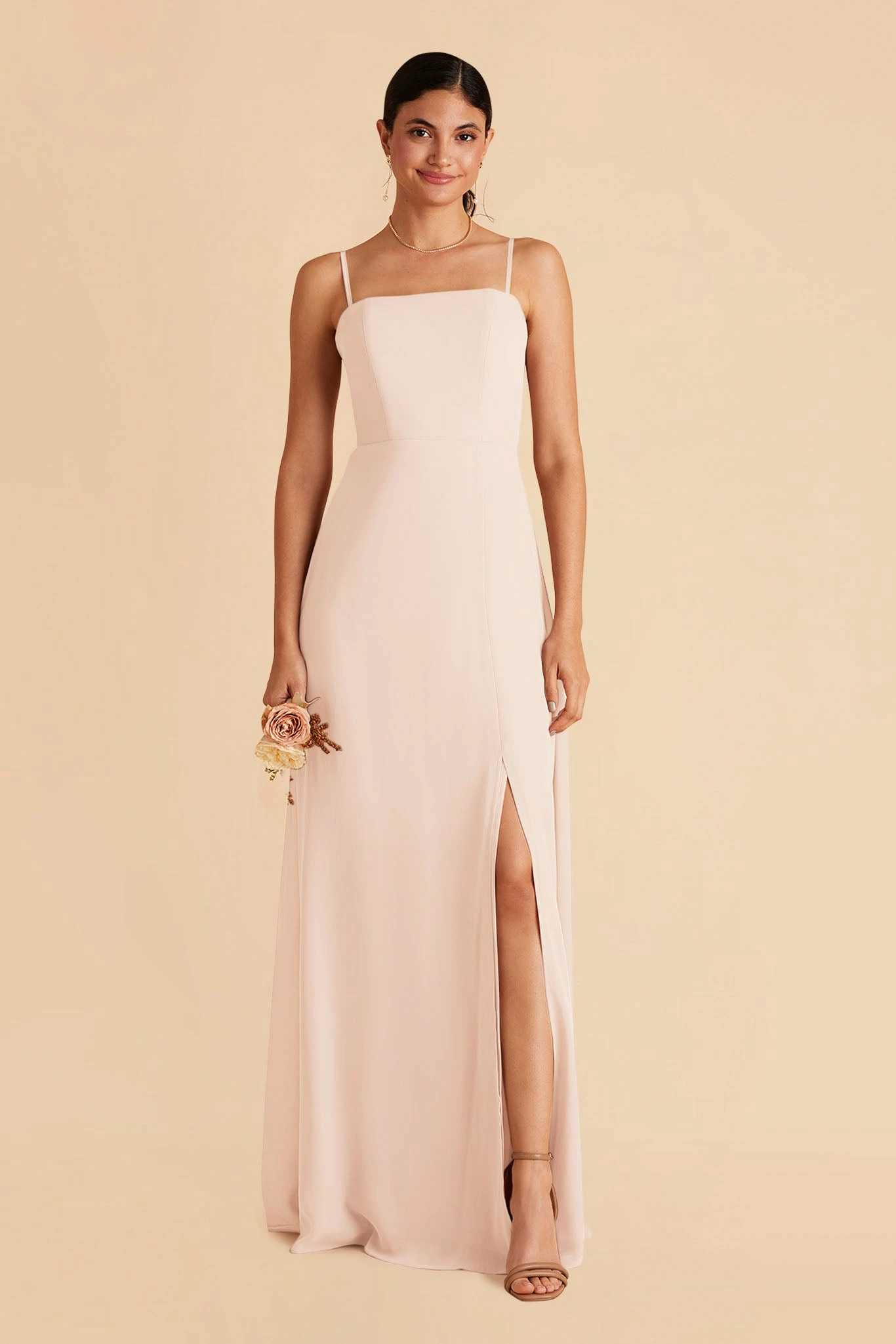 It doesn’t get any simpler than this! Our Chris convertible dress is a straight-neck gown that can be worn with spaghetti straps or with no straps at all. It features a more fitted top, with boning sewn in, for added support when wearing without the straps. Pair this ultra-low-key gown with a statement necklace or dangly earrings.