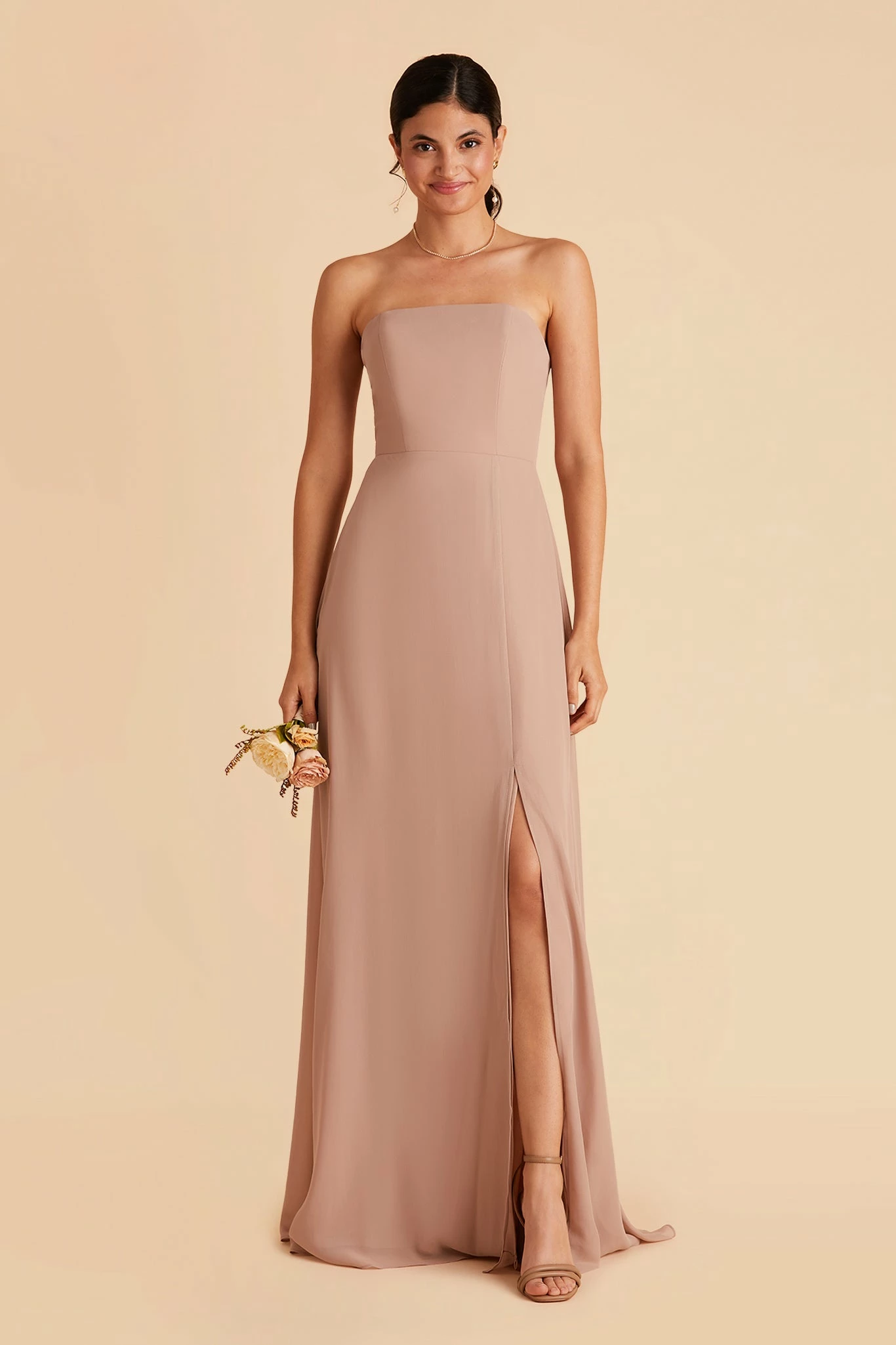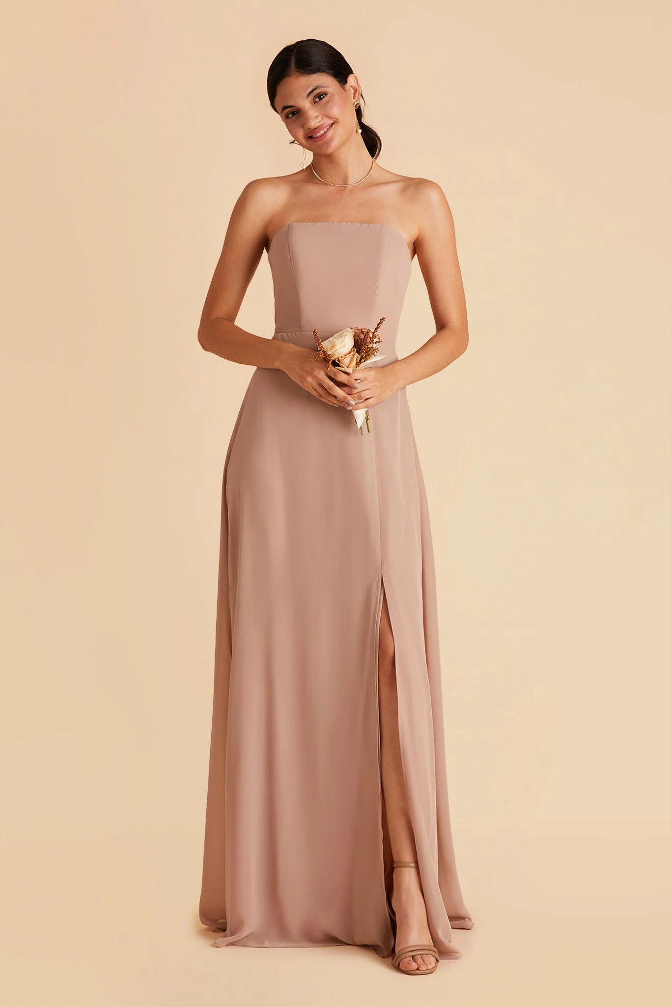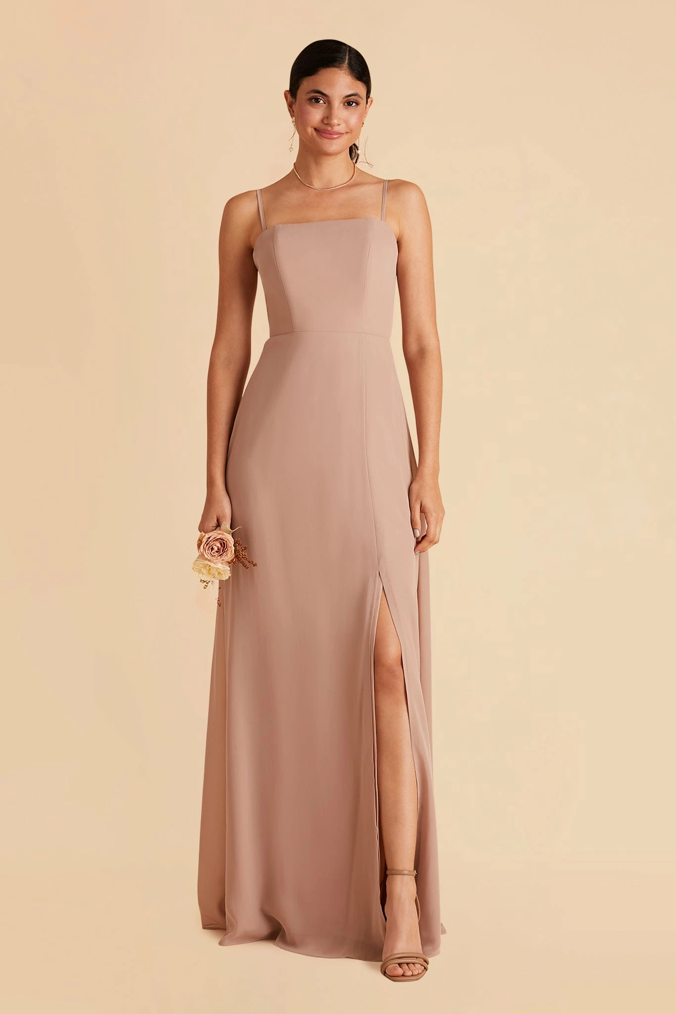 It doesn’t get any simpler than this! Our Chris convertible dress is a straight-neck gown that can be worn with spaghetti straps or with no straps at all. It features a more fitted top, with boning sewn in, for added support when wearing without the straps. Pair this ultra-low-key gown with a statement necklace or dangly earrings.