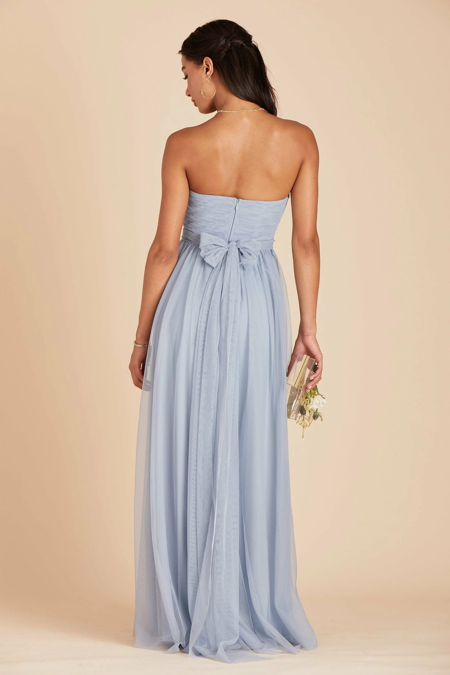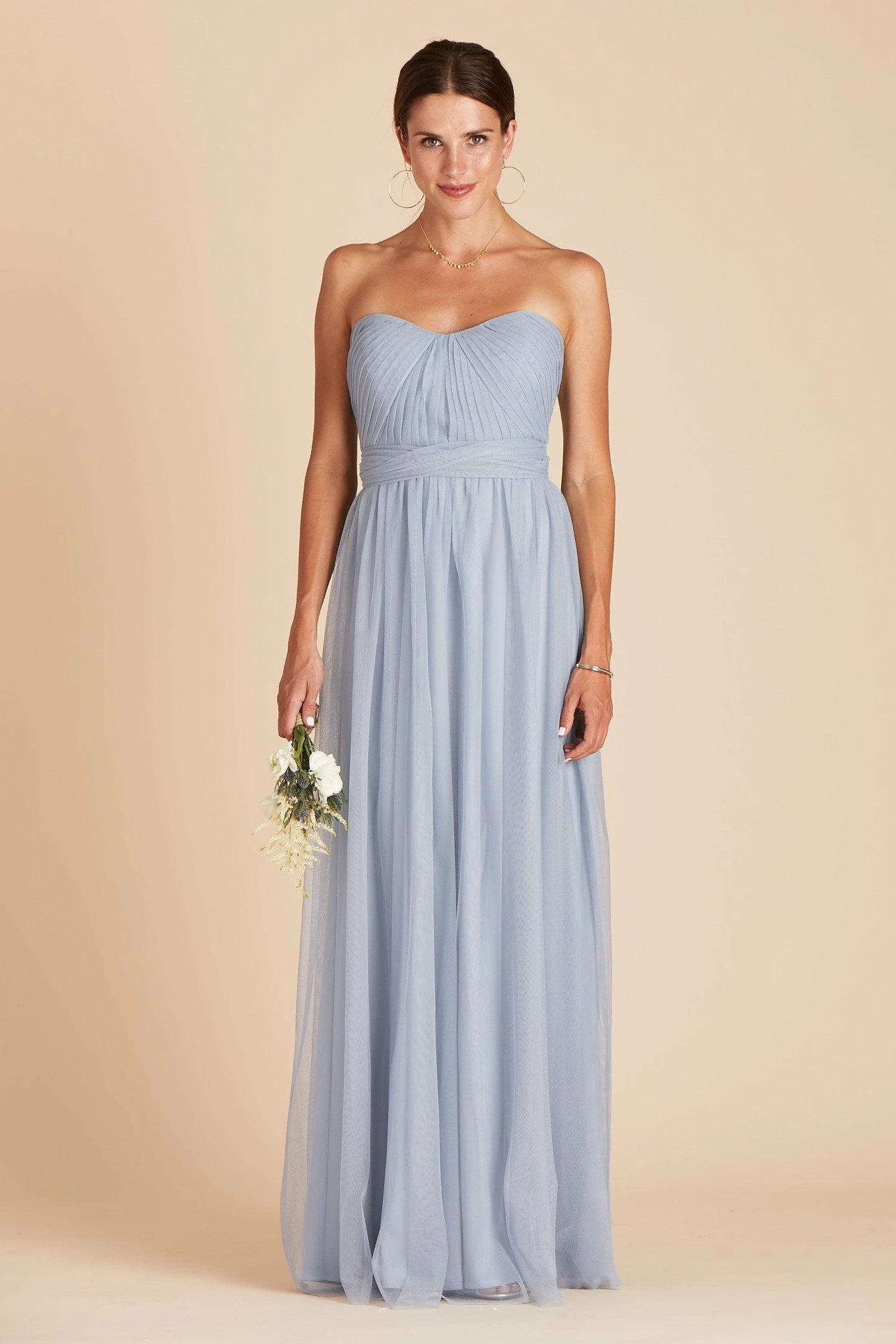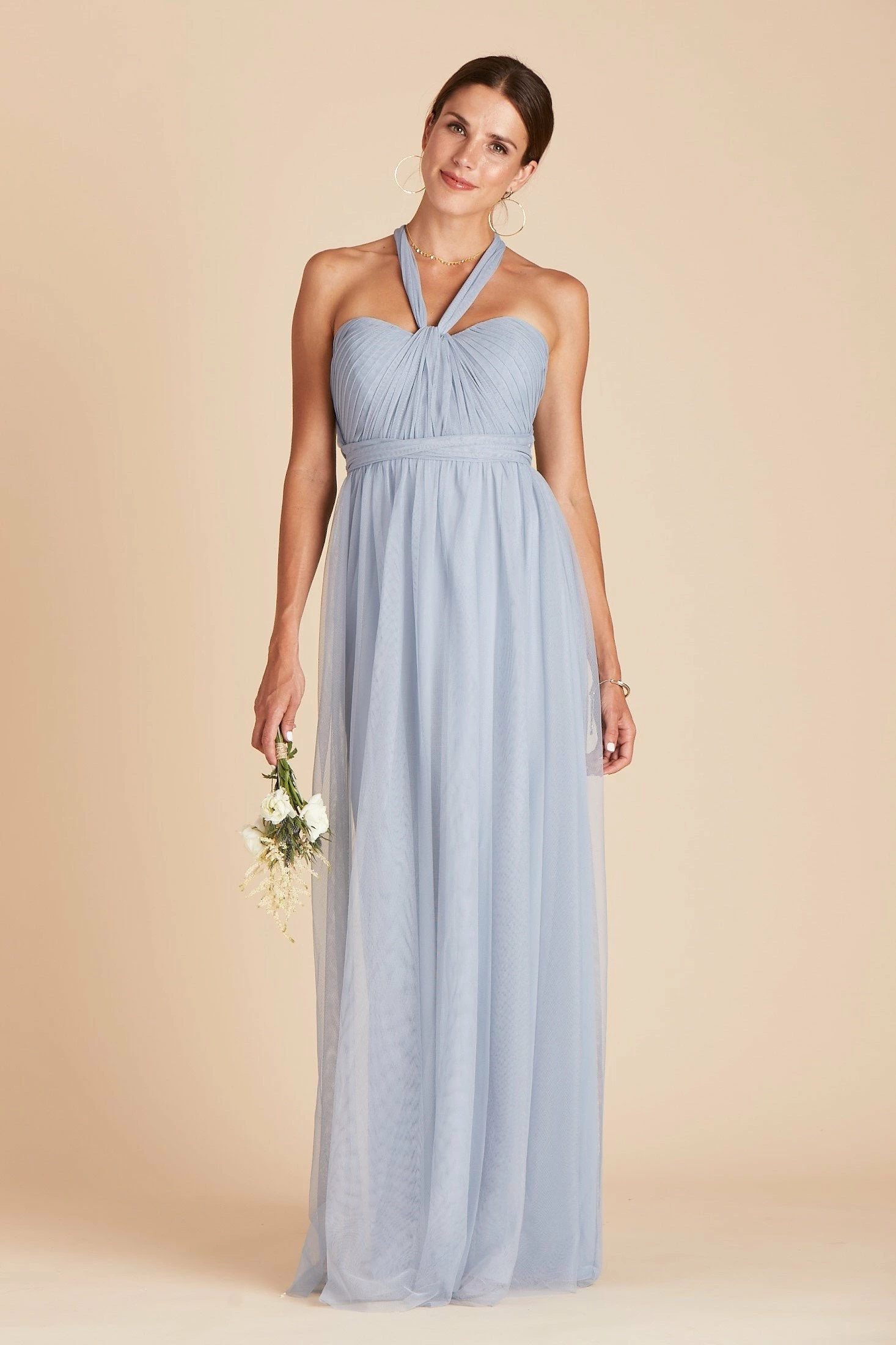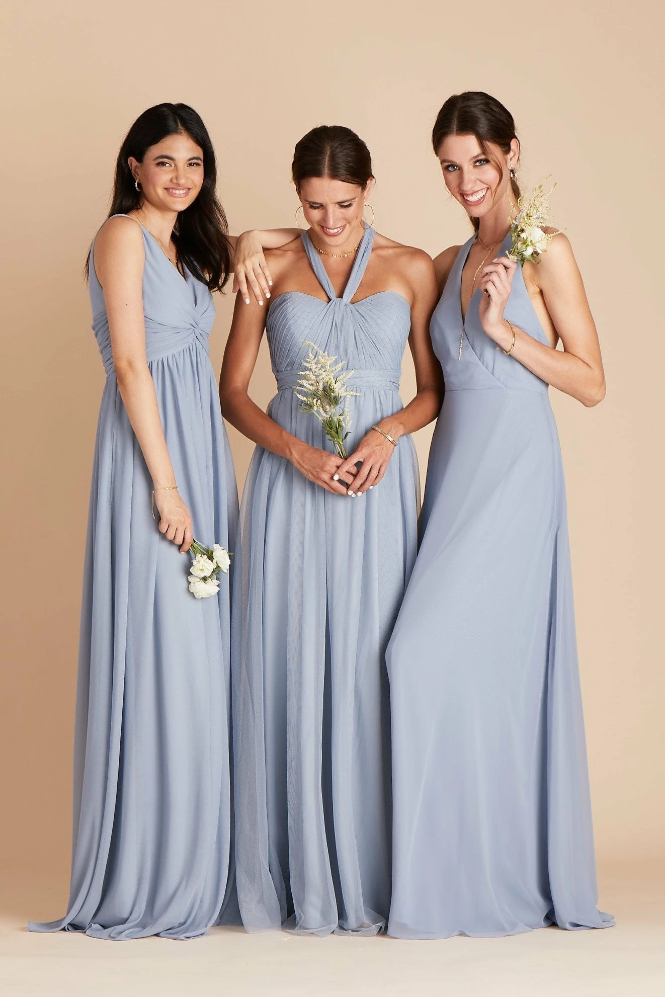 She’s pretty and versatile. This convertible dress is spun of airy tulle and flaunts a gorgeous pleated bodice with a sweetheart neckline that flatters your body and a soft, sweeping column skirt that trails your every move. The two extra-long front streamers at the waist can be tied in a multitude of ways (too many to count, tbh!) to create everything from cap sleeves to one shoulder, or simply tied in a bow in the back for a romantic strapless look. This convertible bridesmaid dress is your one-and-done solution to dressing your entire #girlgang while giving them exactly what they want.
