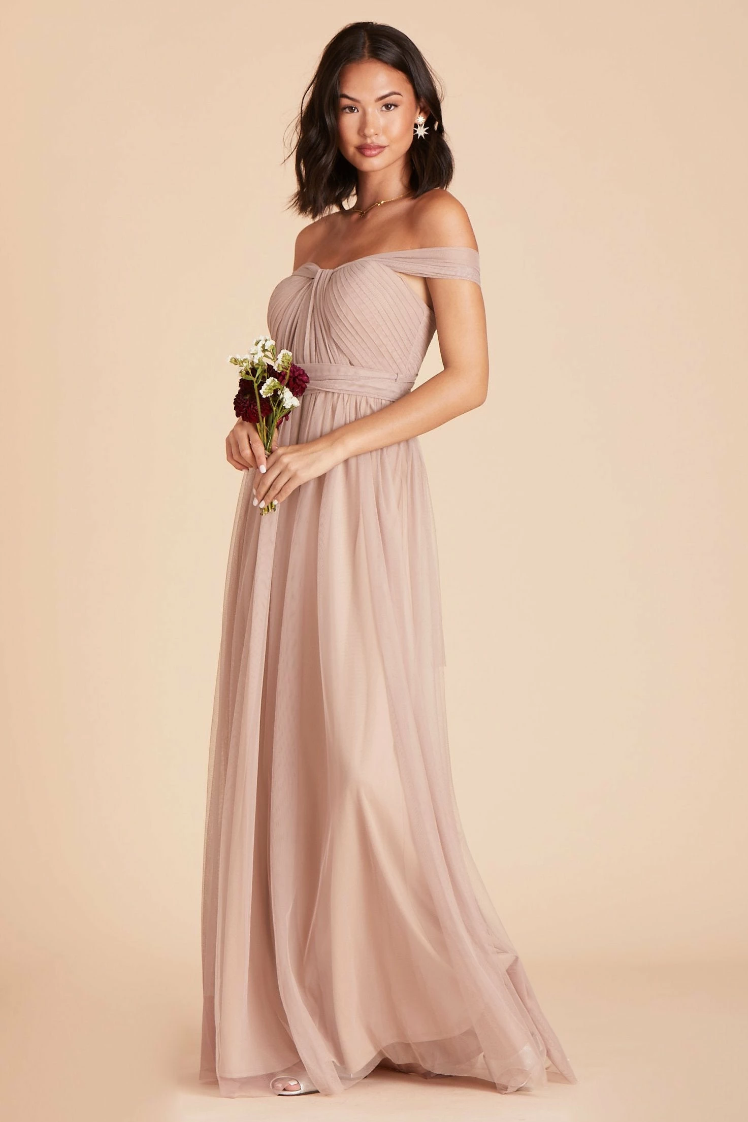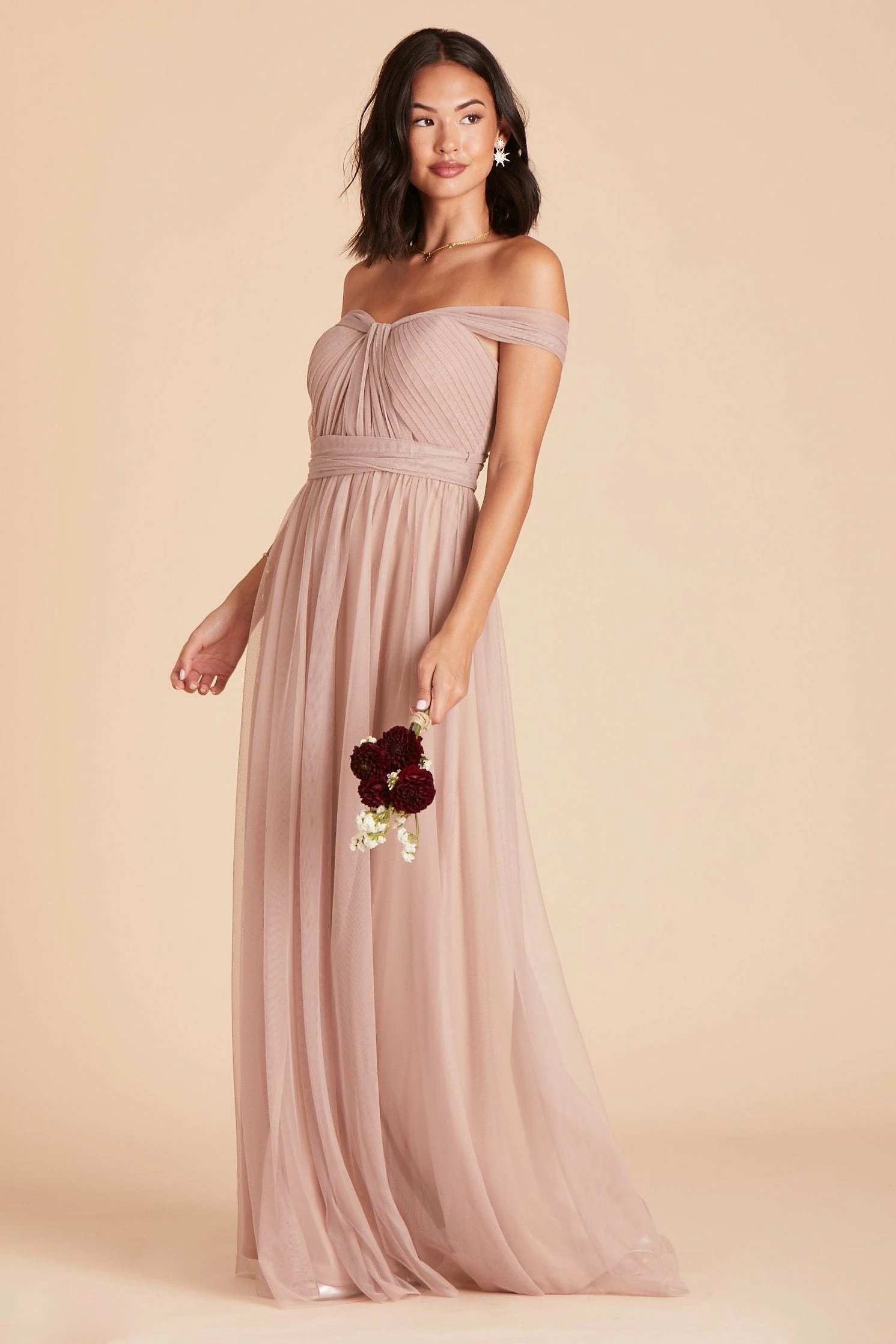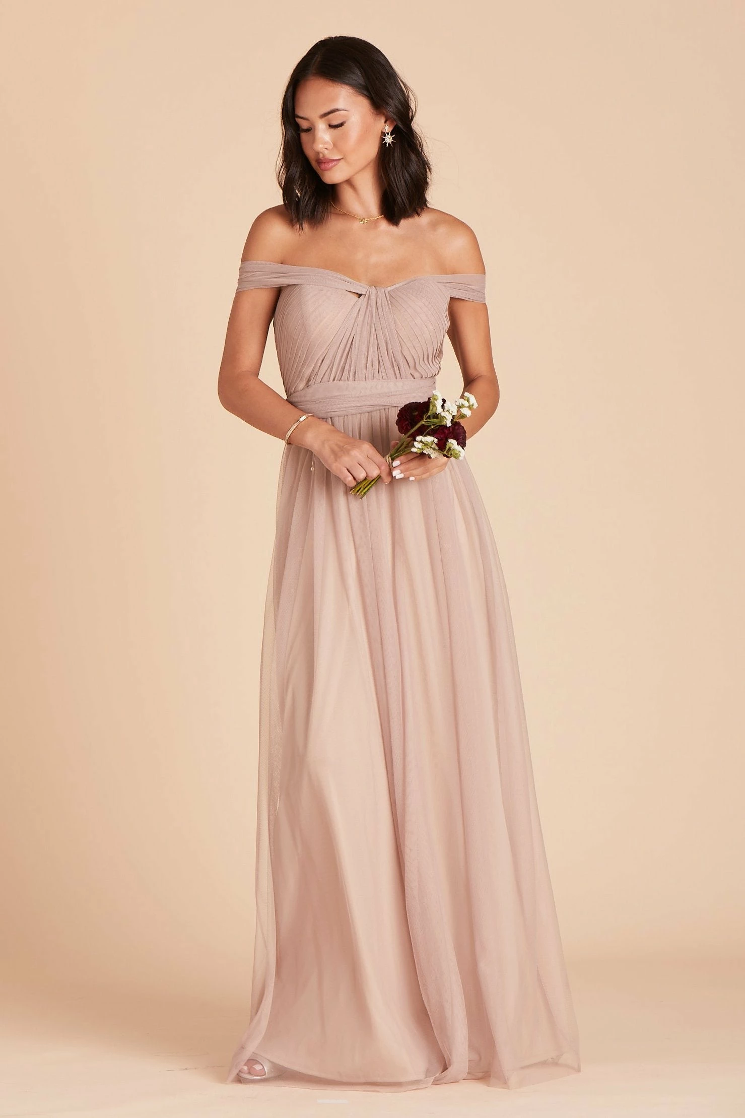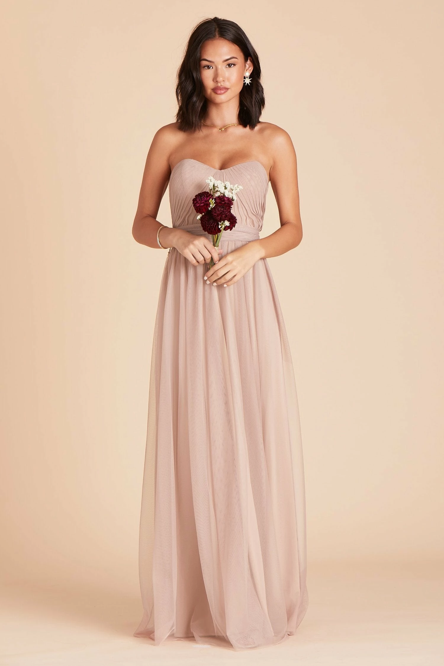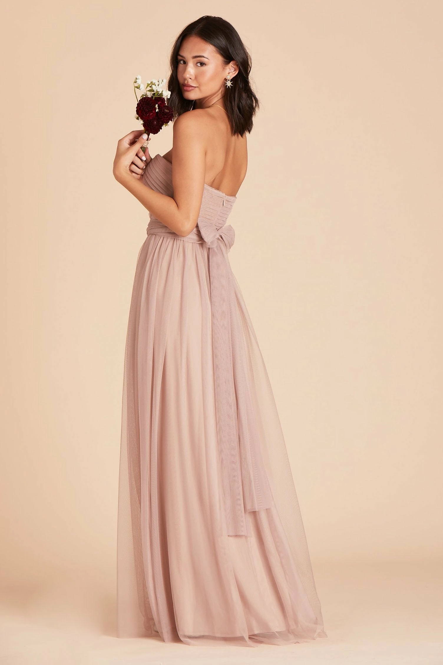 She’s pretty and versatile. This convertible dress is spun of airy tulle and flaunts a gorgeous pleated bodice with a sweetheart neckline that flatters your body and a soft, sweeping column skirt that trails your every move. The two extra-long front streamers at the waist can be tied in a multitude of ways (too many to count, tbh!) to create everything from cap sleeves to one shoulder, or simply tied in a bow in the back for a romantic strapless look. This convertible bridesmaid dress is your one-and-done solution to dressing your entire #girlgang while giving them exactly what they want.
