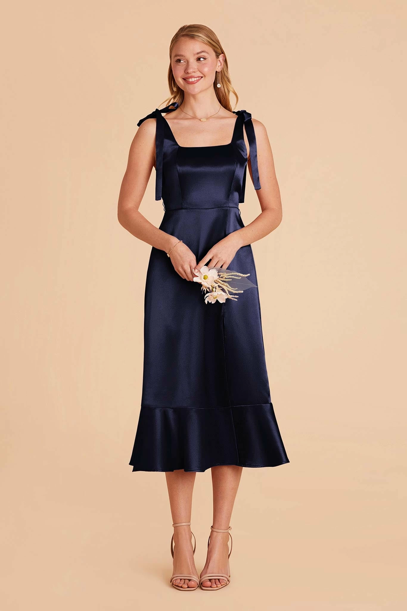 Eugenia Shiny Satin Convertible Midi Dress – Navy