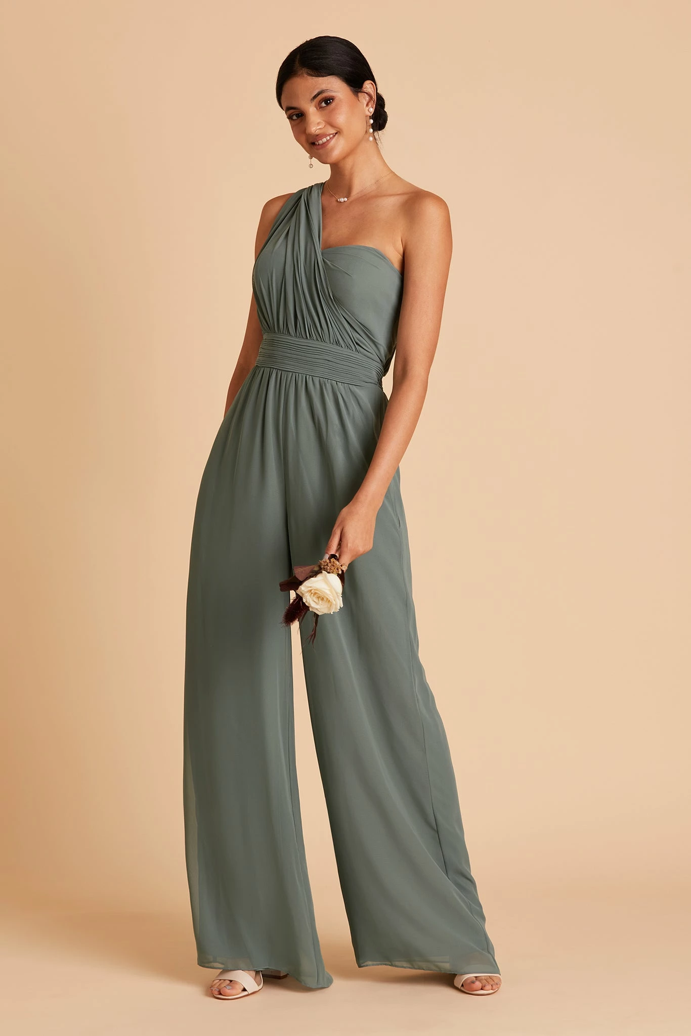 On top, Gigi is reminiscent of our Grace Convertible Dress. She has a pleated sweetheart bodice and two extra-long streamers that allow you to create a near-endless number of necklines. Gigi has bra cups for extra support and hidden pockets, so you’re never too far from your lip gloss. Just a note, the spaghetti straps are super long, so you might want to alter them, depending on which way you decide to arrange the top. On the bottom, she’s got PANTS! Gigi is our very first bridesmaid jumpsuit and needless to say, we’re so in love.