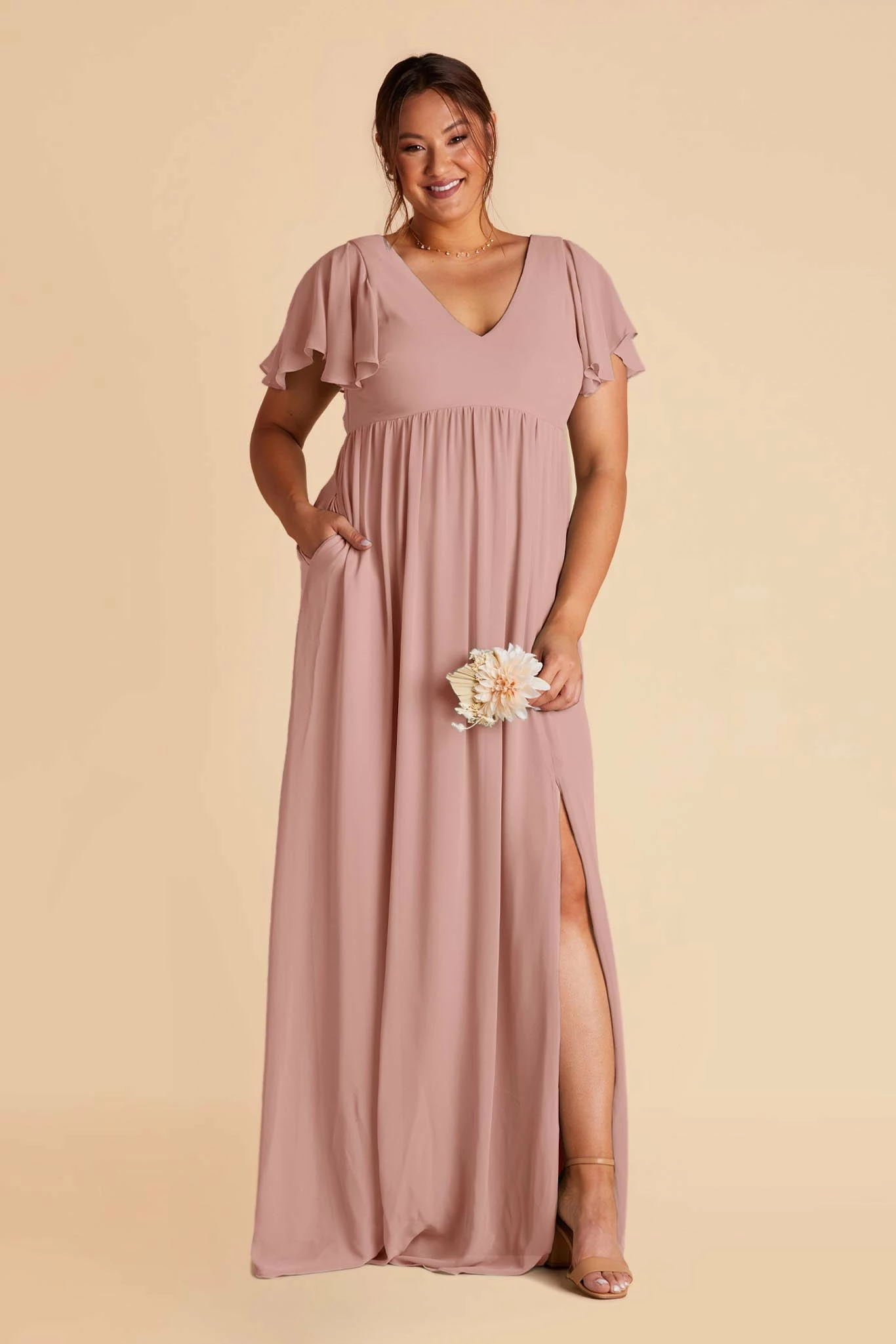 Whatever you need that extra wiggle room for—a baby bump, a second helping, extra cake, or if you simply prefer more breathing room, Hannah is the girl for you. Spun of lightweight chiffon, this dress won’t ever weigh you down while floating down the aisle or getting down on the dancefloor (no one said a bump should keep you from having fun!). The key here is the raised empire waist fitted with a stretchy elastic that’s especially great news for expecting moms. The flutter sleeves add a sweet touch while also offering comfy arm coverage.