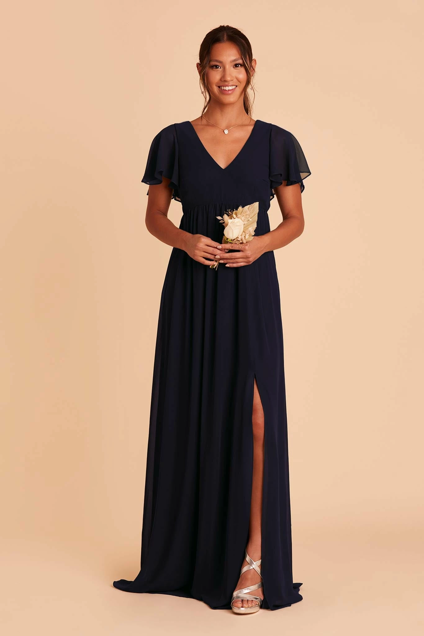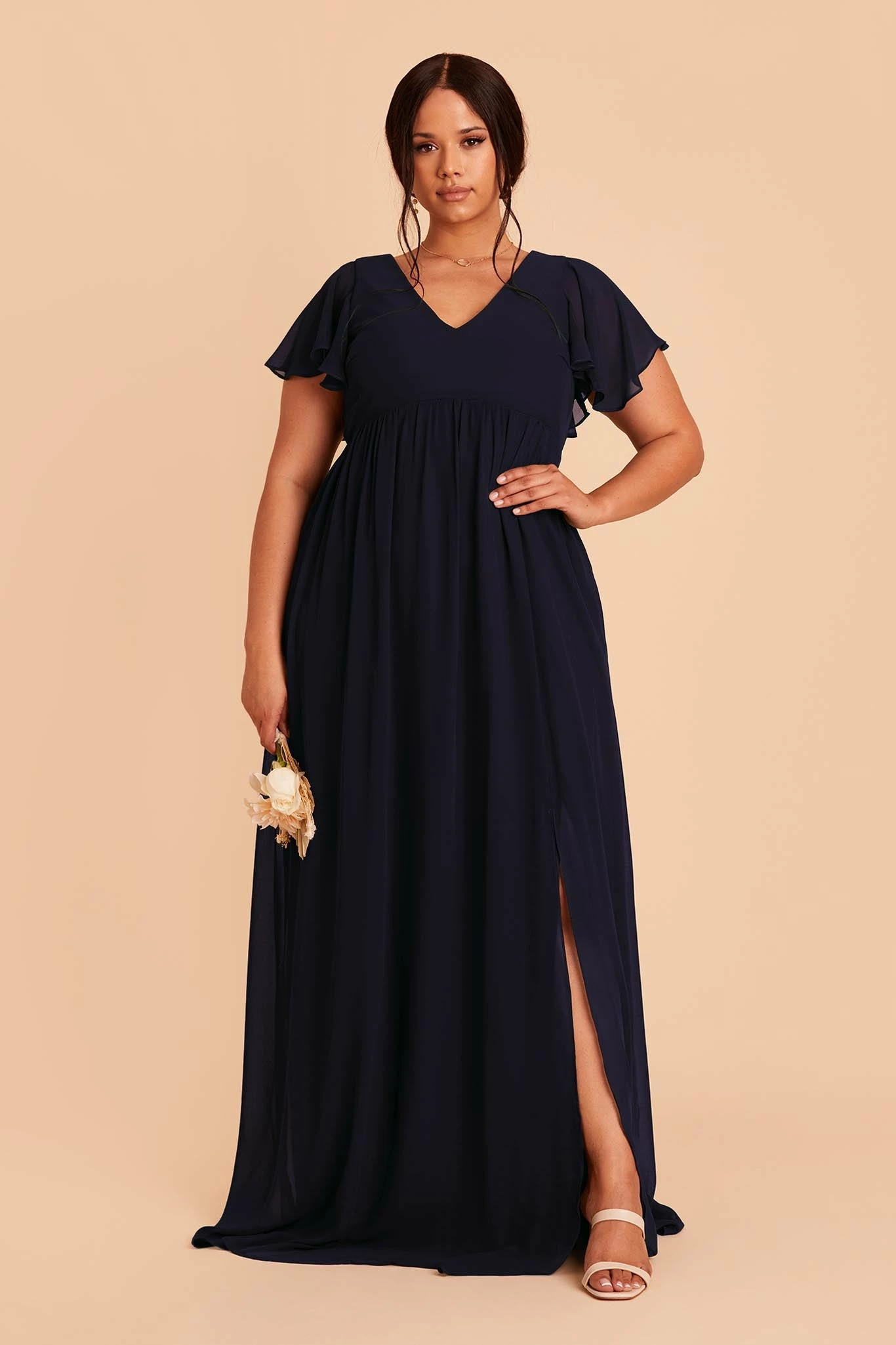 Whatever you need that extra wiggle room for—a baby bump, a second helping, extra cake, or if you simply prefer more breathing room, Hannah is the girl for you. Spun of lightweight chiffon, this dress won’t ever weigh you down while floating down the aisle or getting down on the dancefloor (no one said a bump should keep you from having fun!). The key here is the raised empire waist fitted with a stretchy elastic that’s especially great news for expecting moms. The flutter sleeves add a sweet touch while also offering comfy arm coverage.