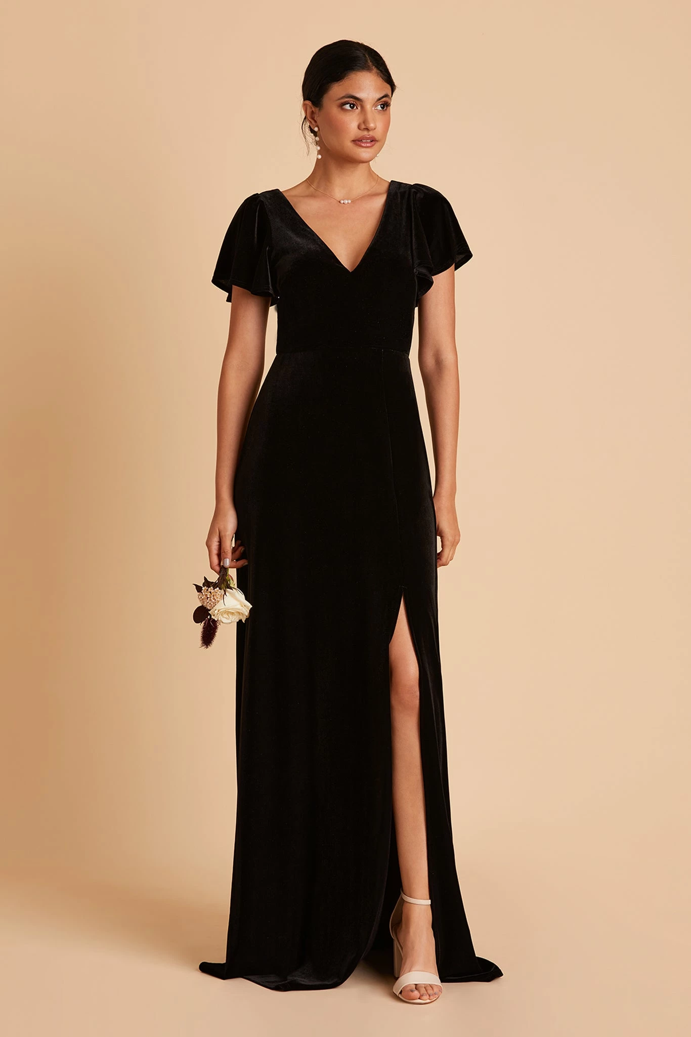 For the girl who loves a little ruffle, we present our Hannah Dress, with an empire waistline and romantic, ruffly sleeves. She features a plunging V front & back, a sexy slit, and a body-skimming silhouette that hugs in all the right places.