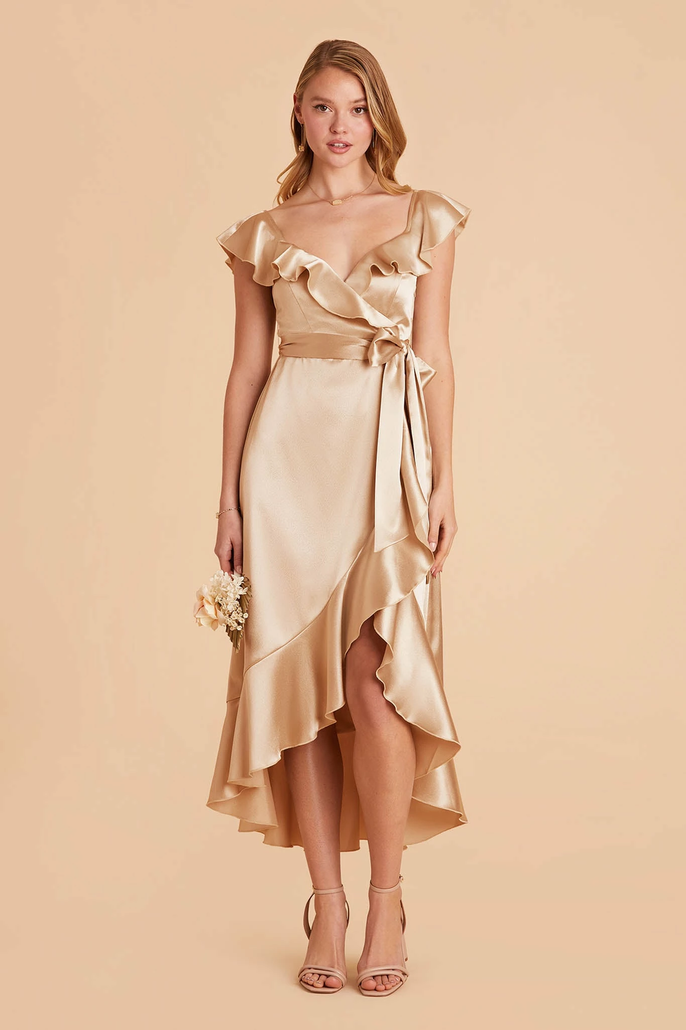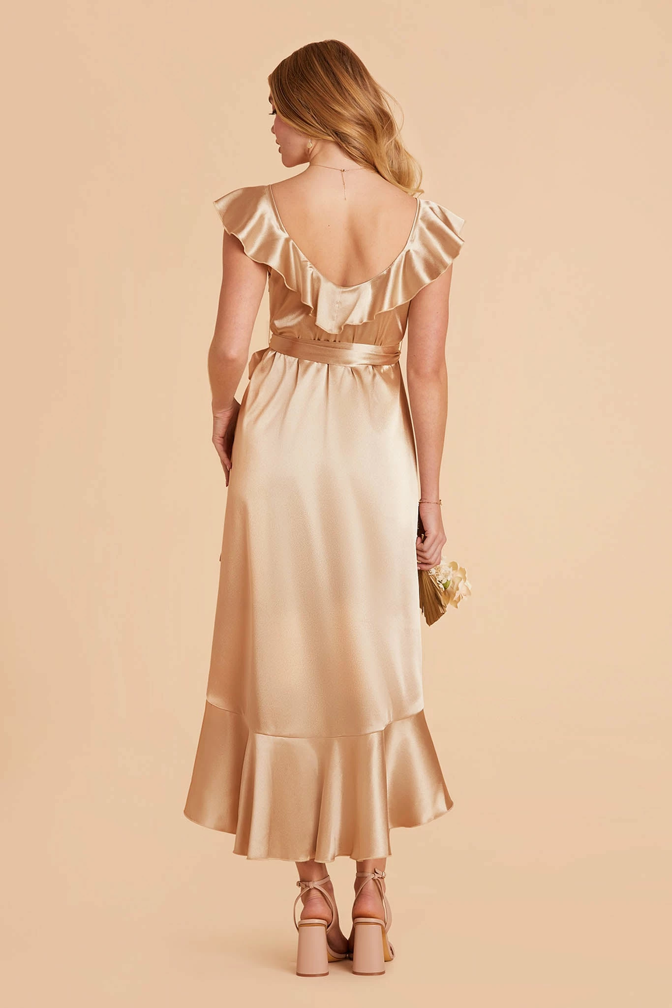 This satin midi bridesmaid dress, with its asymmetrical skirt and cascading ruffles is as romantic as it gets.