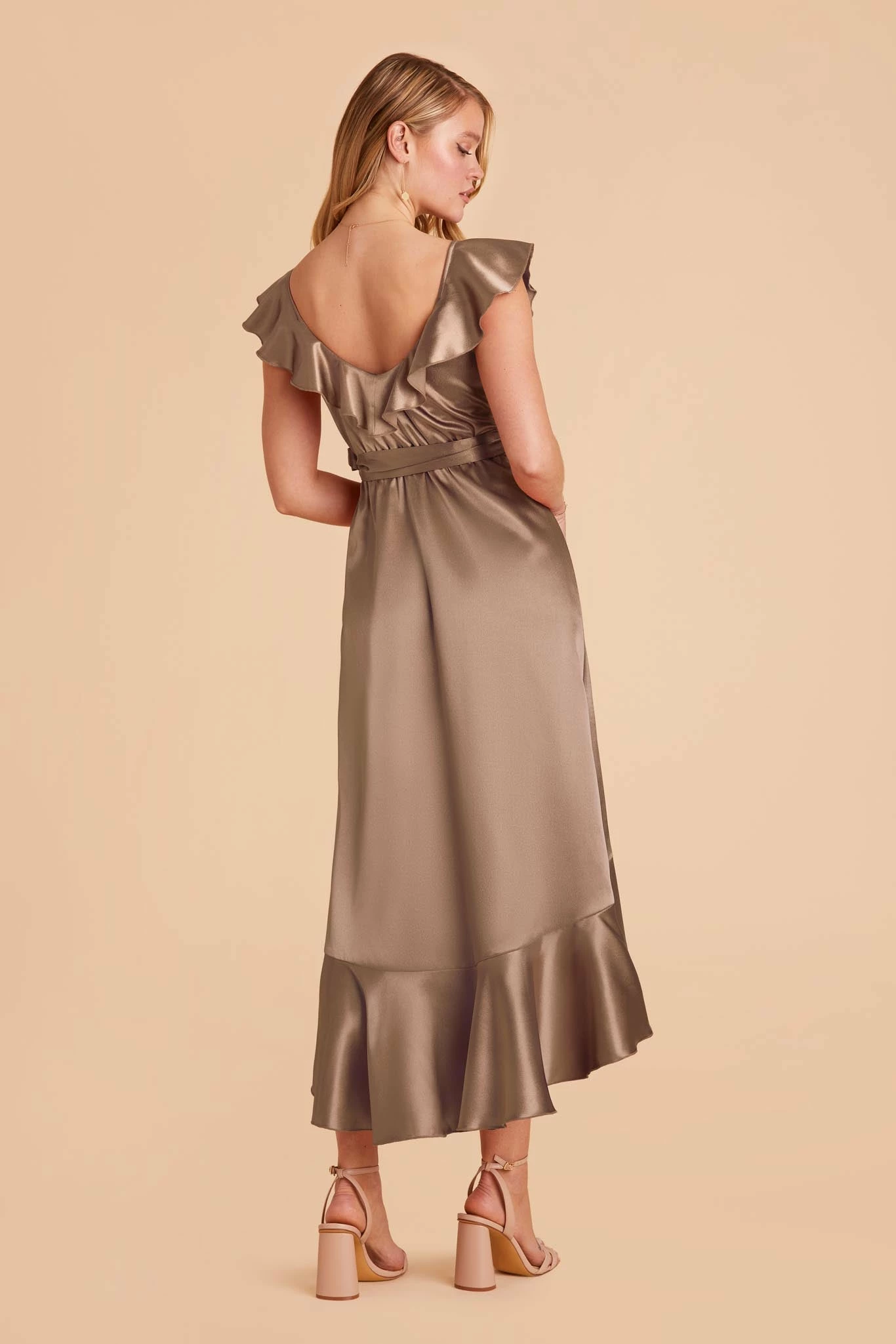 This satin midi bridesmaid dress, with its asymmetrical skirt and cascading ruffles is as romantic as it gets.