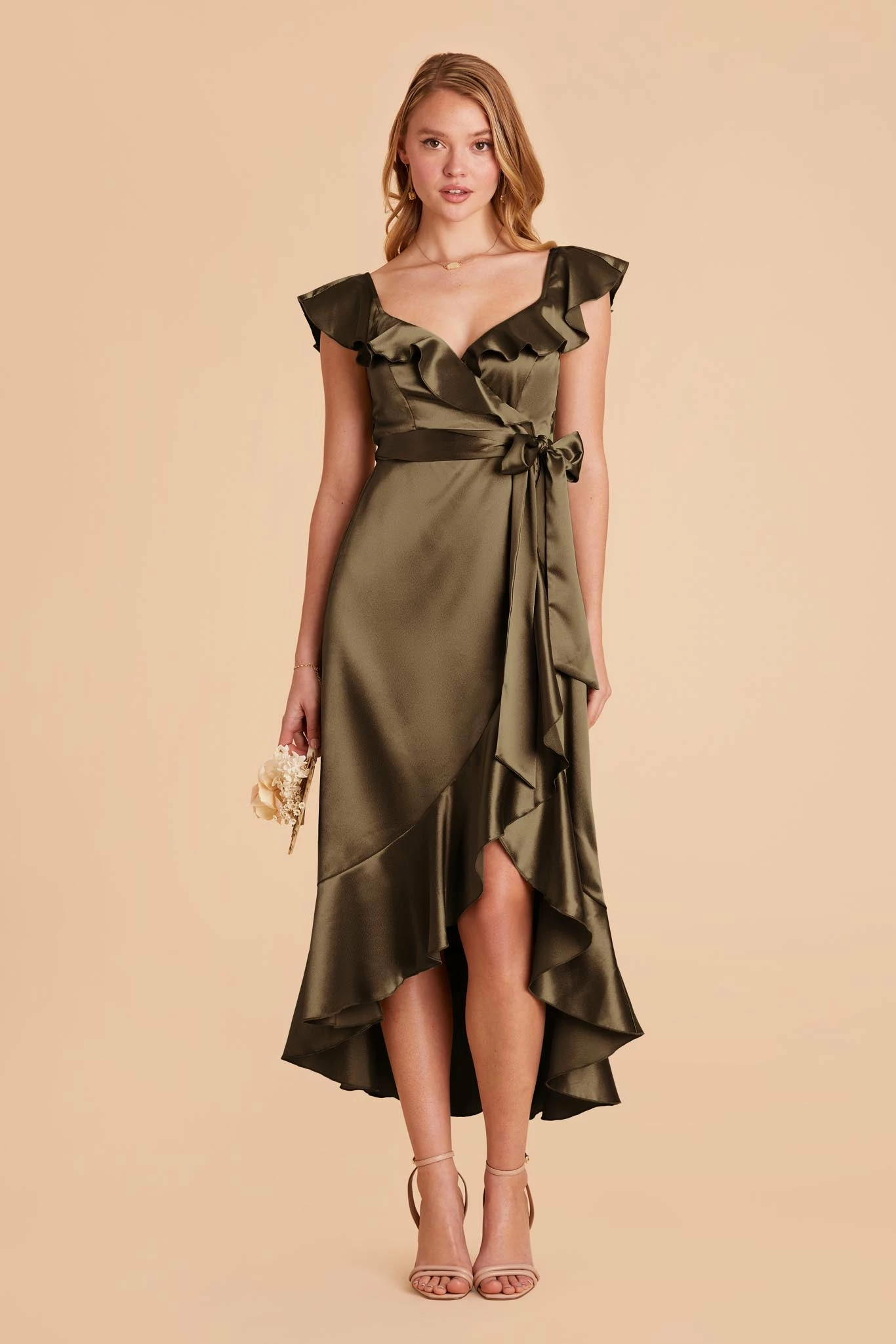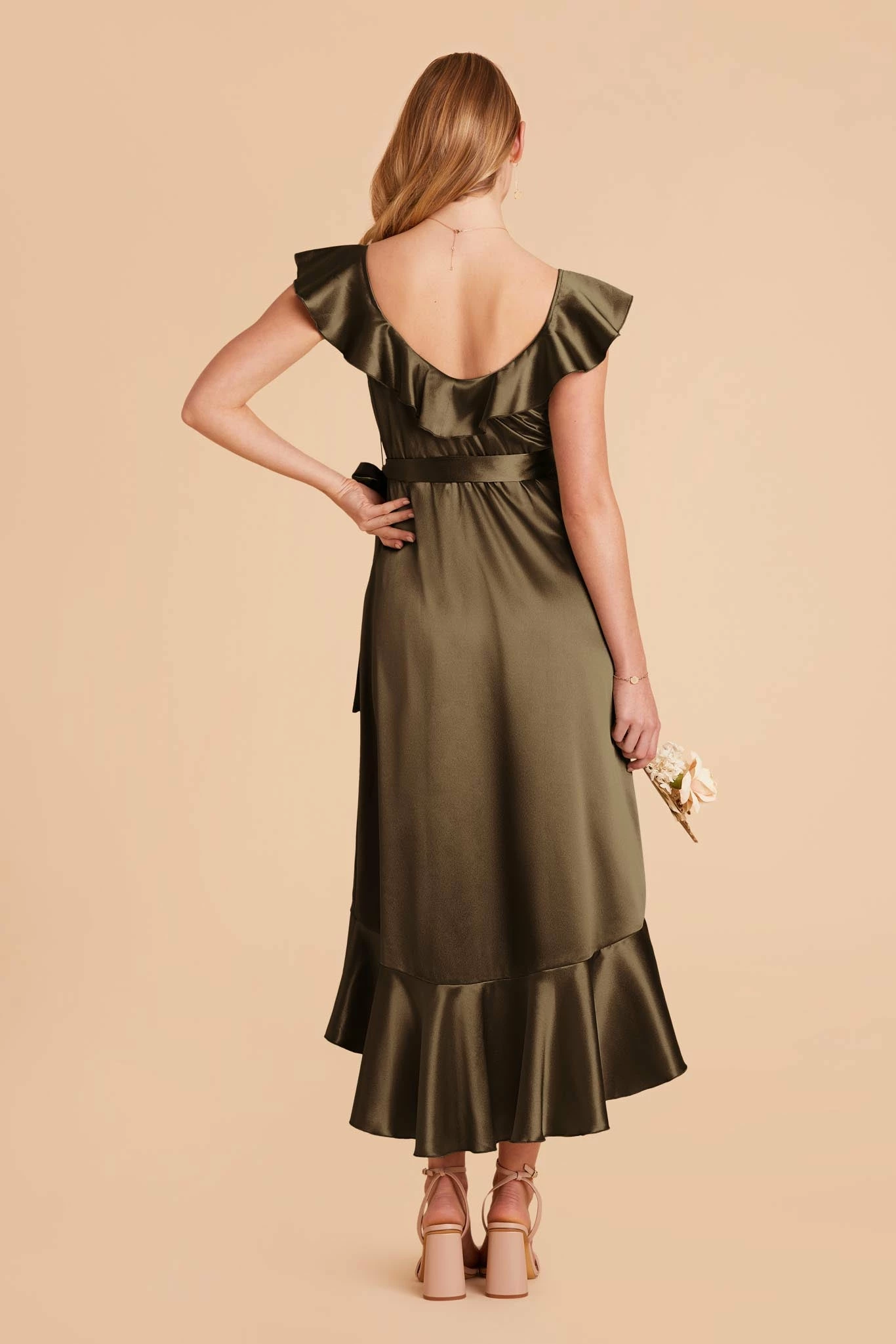 This satin midi bridesmaid dress, with its asymmetrical skirt and cascading ruffles is as romantic as it gets.