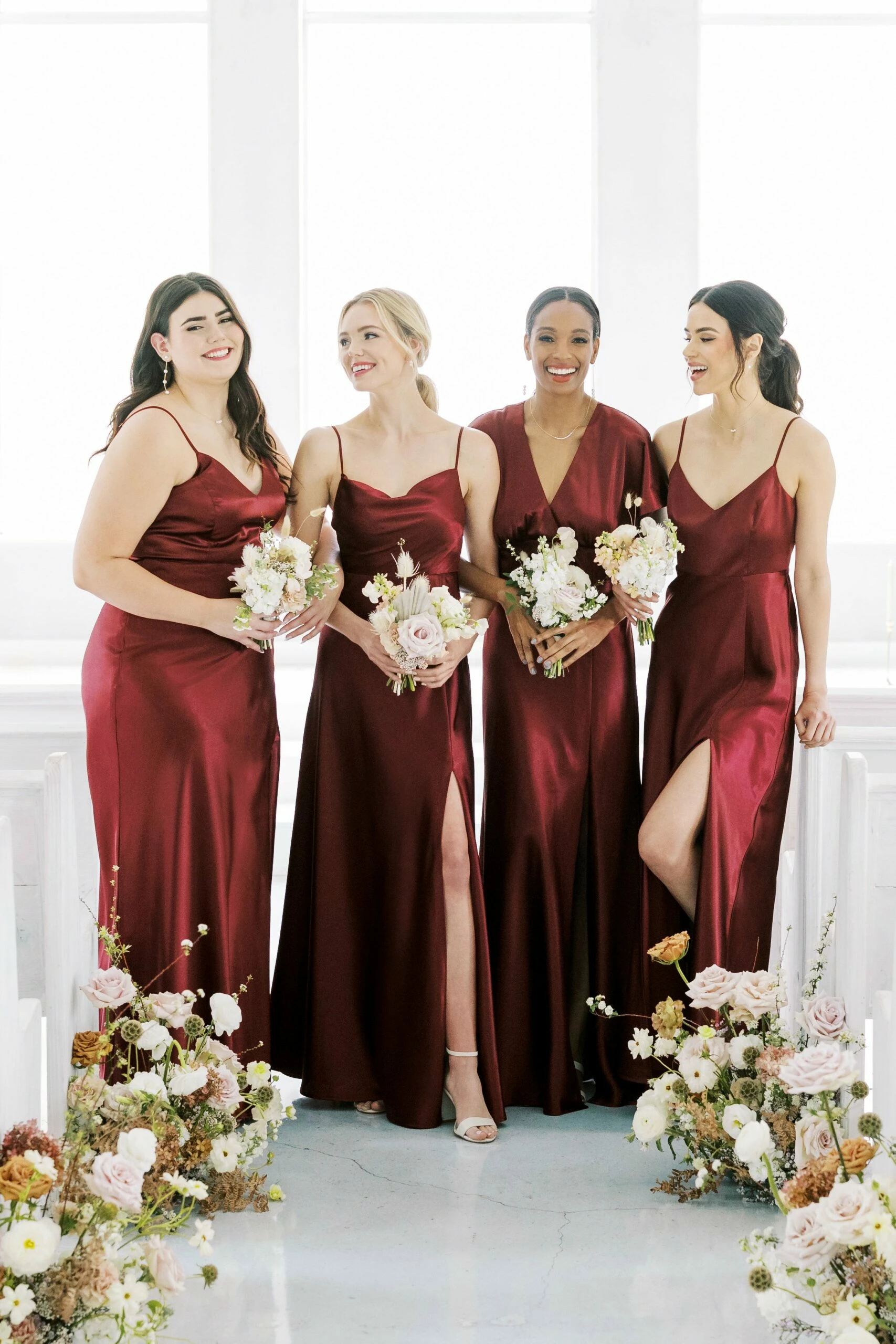 This kimono sleeve satin bridesmaid dress is so elegant, but you have to see it in action to understand its jaw-dropping effect. And don’t underestimate its demure coverage either—though the sleeves and floor-length skirt keep you looking modest, the slit and deep V-neck show the perfect peek of skin. Just get ready for the oohs and aahs.