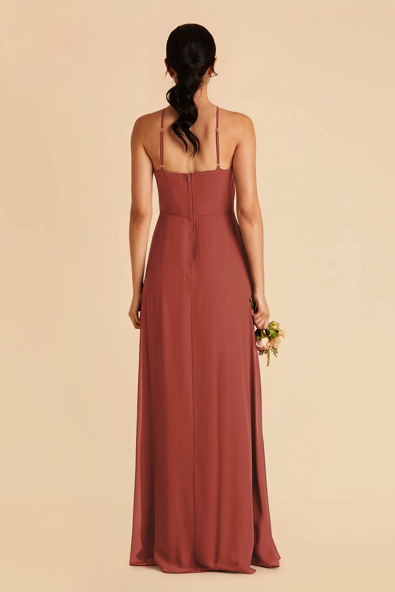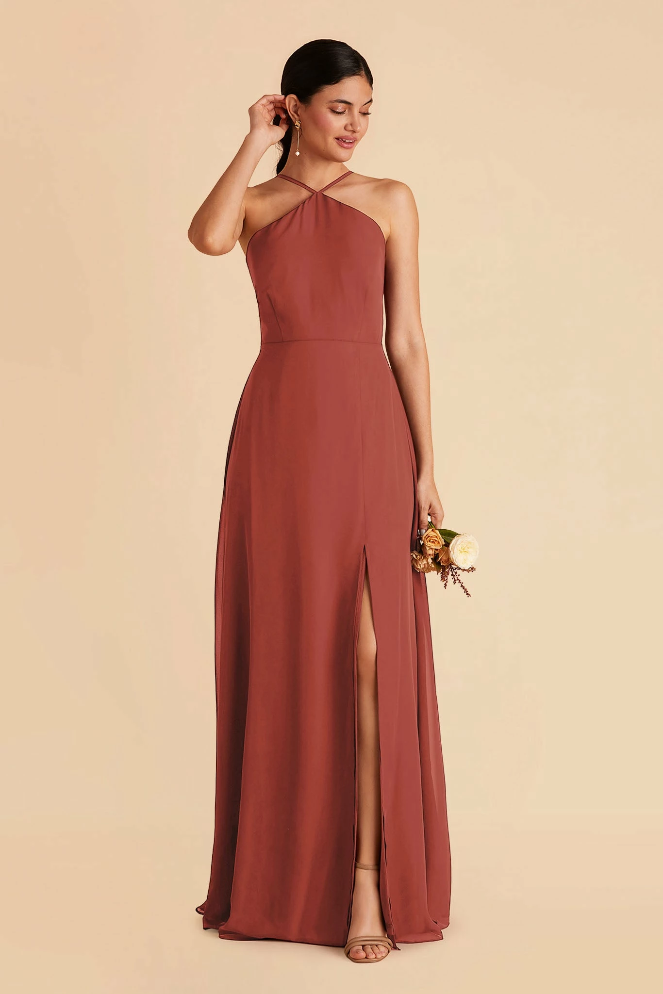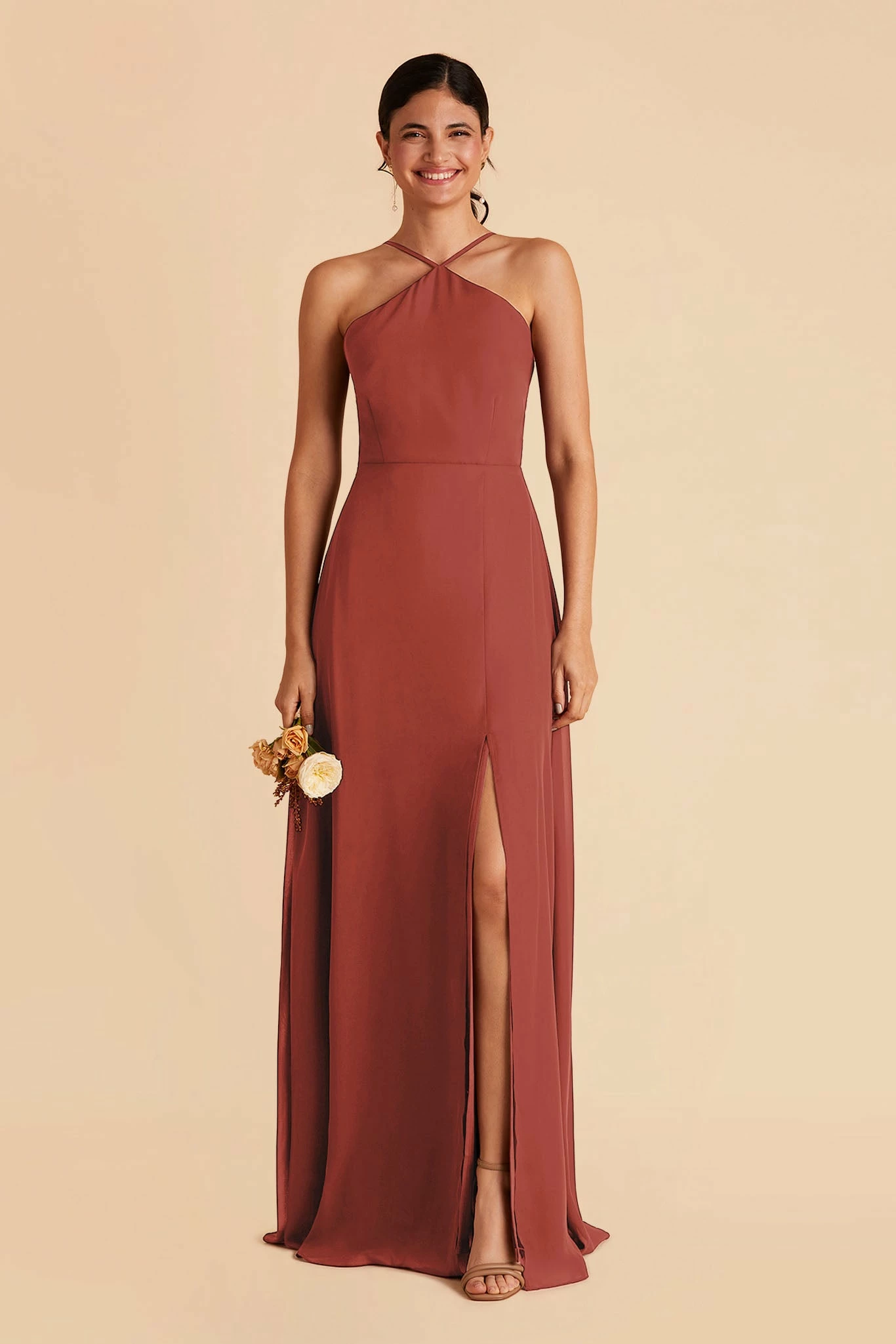 Less is more with this thin-strapped halter bridesmaid dress. Juliet also features a slimmer, more minimal skirt design, that dials up the sleek factor in a big way. She’s perfect for the bridesmaid who’s looking for a simpler design but still wants the elegance of chiffon.