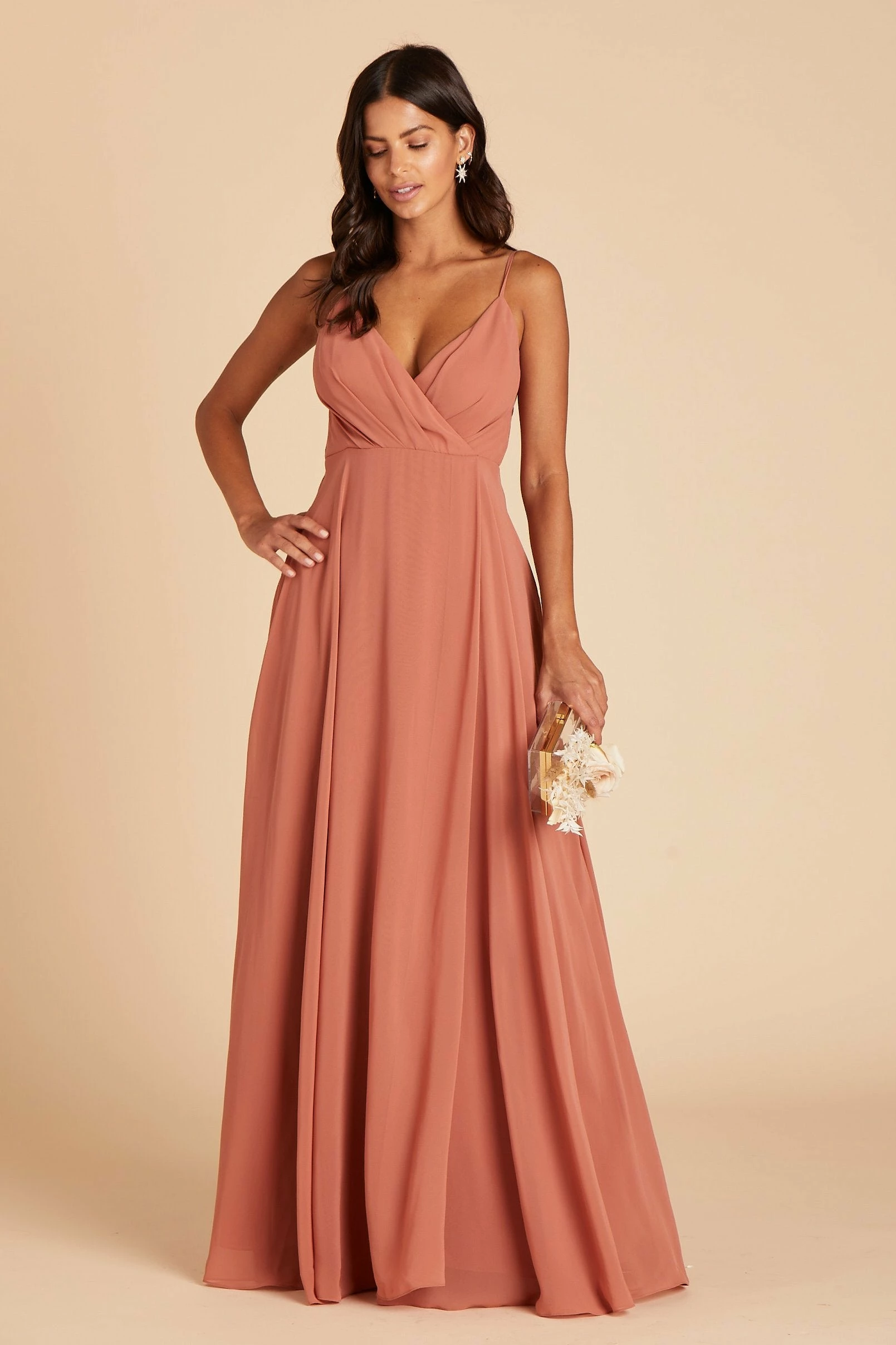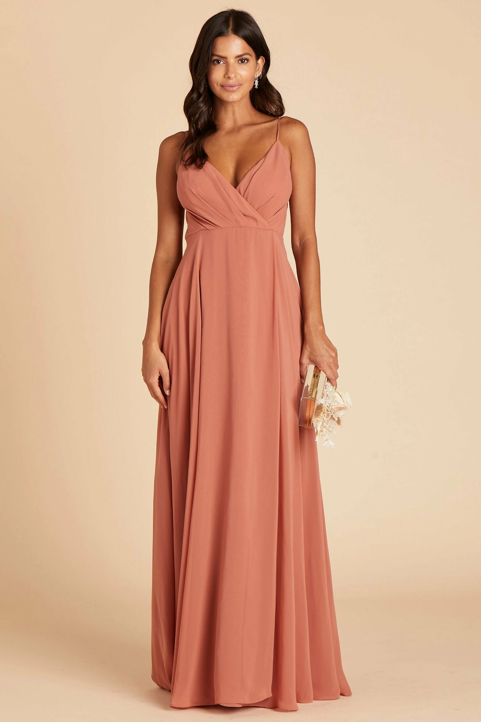 A dress so elegant that it could even make Grace Kelly blush. You’ll get swept away in your bridesmaid’s duties in this chiffon dress that flows like a soft river wrapped around your body. Its V-shaped neckline subtly accentuates your collarbone for an elevated and sophisticated look. The best part? Wearing our Kaia bridesmaid dress is like sleeping in a cloud of comfort and style with its strategically placed and slightly raised elastic-backed empire waist that leaves the perfect amount of space for effortlessly walking down the aisle and dancing the night away.