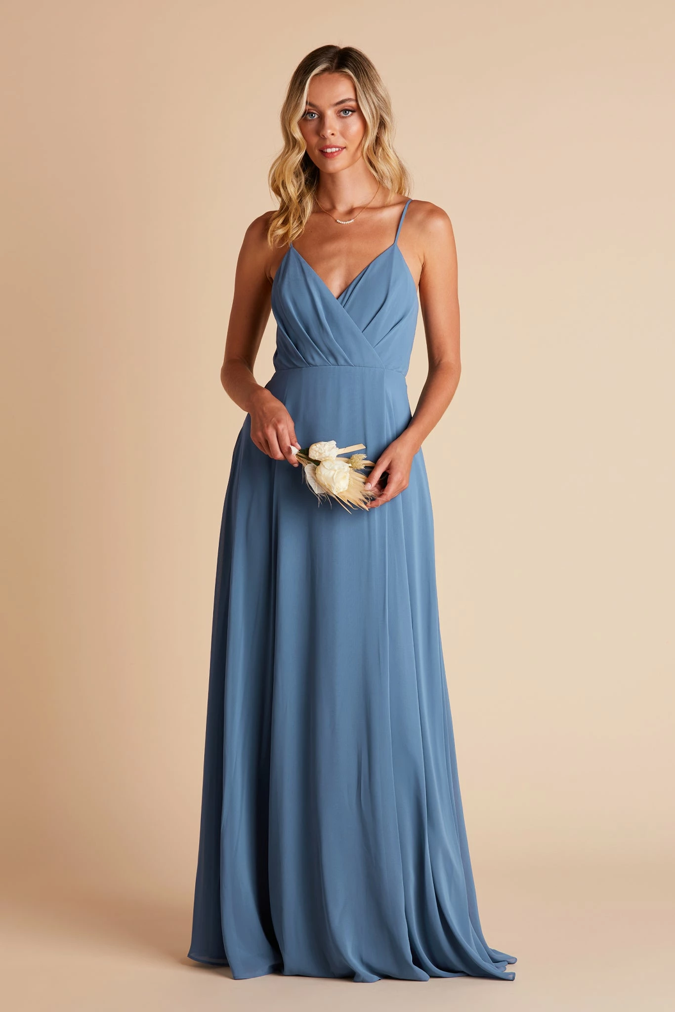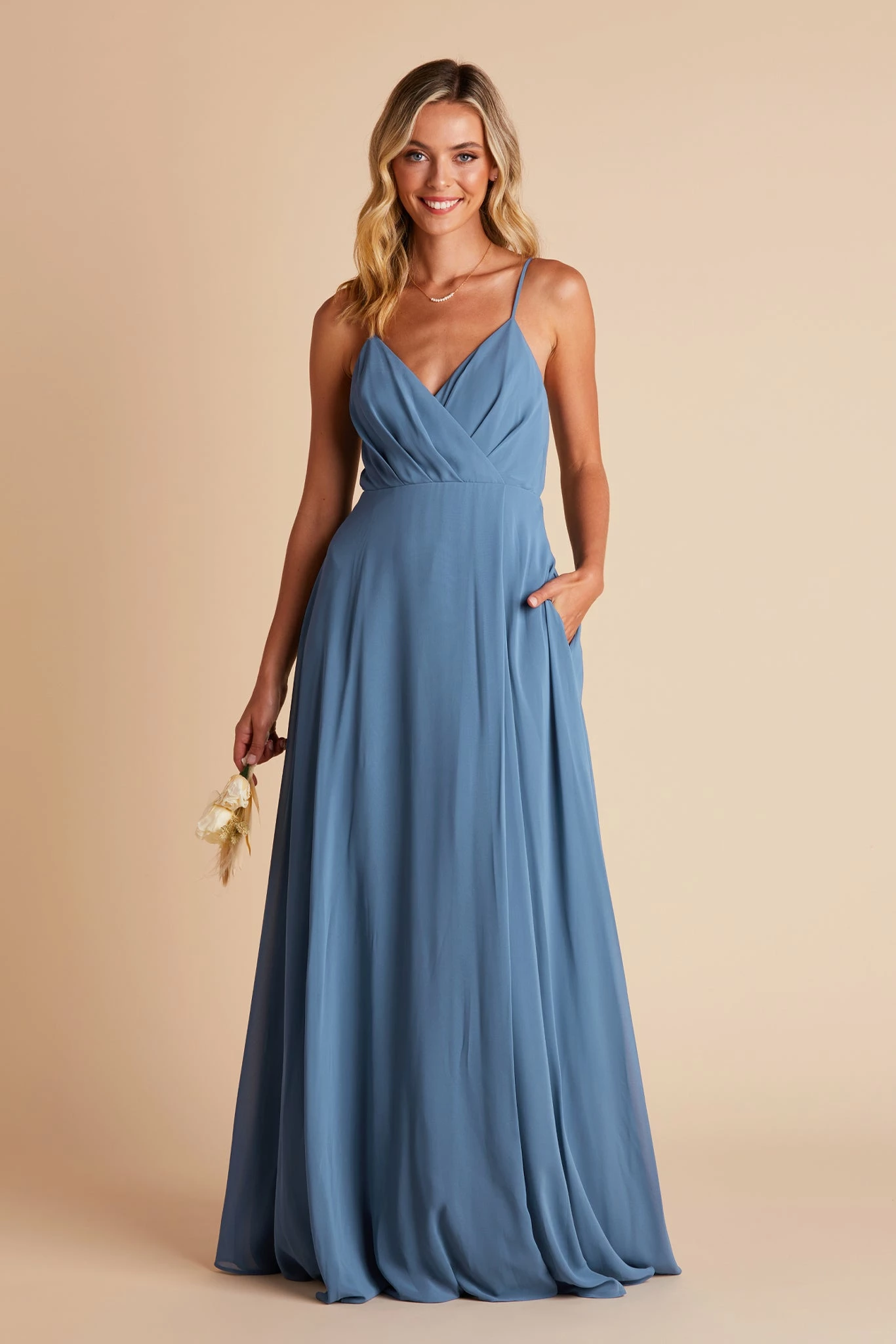 A dress so elegant that it could even make Grace Kelly blush. You’ll get swept away in your bridesmaid’s duties in this chiffon dress that flows like a soft river wrapped around your body. Its V-shaped neckline subtly accentuates your collarbone for an elevated and sophisticated look. The best part? Wearing our Kaia bridesmaid dress is like sleeping in a cloud of comfort and style with its strategically placed and slightly raised elastic-backed empire waist that leaves the perfect amount of space for effortlessly walking down the aisle and dancing the night away.