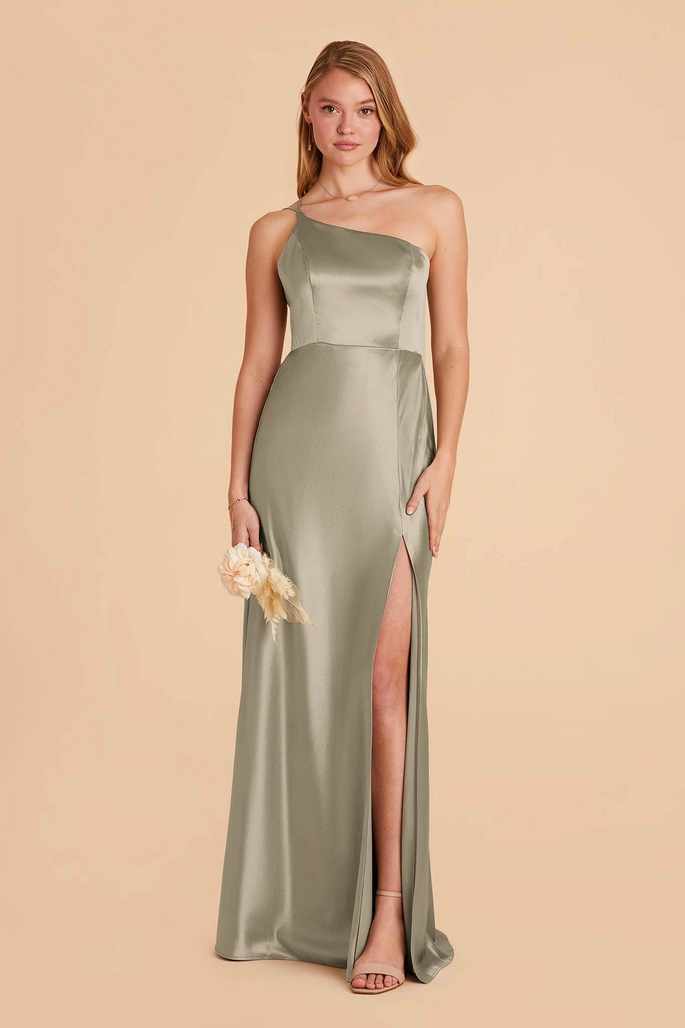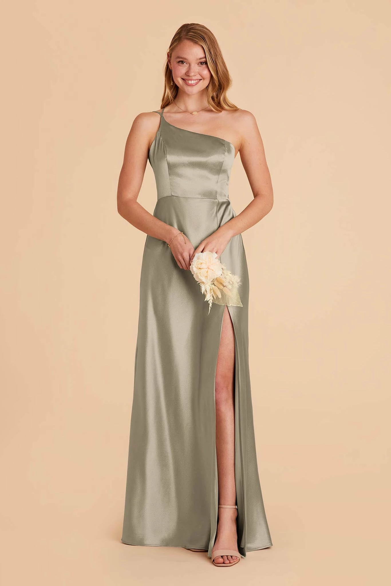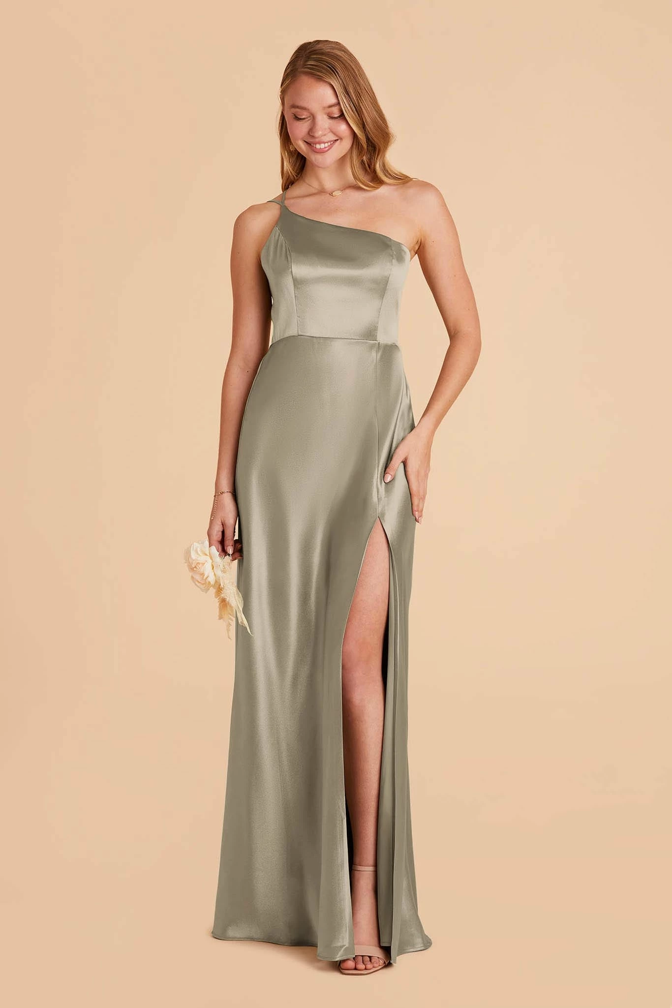 This ultra modern one-shoulder satin bridesmaid dress is the picture of 21st century elegance.