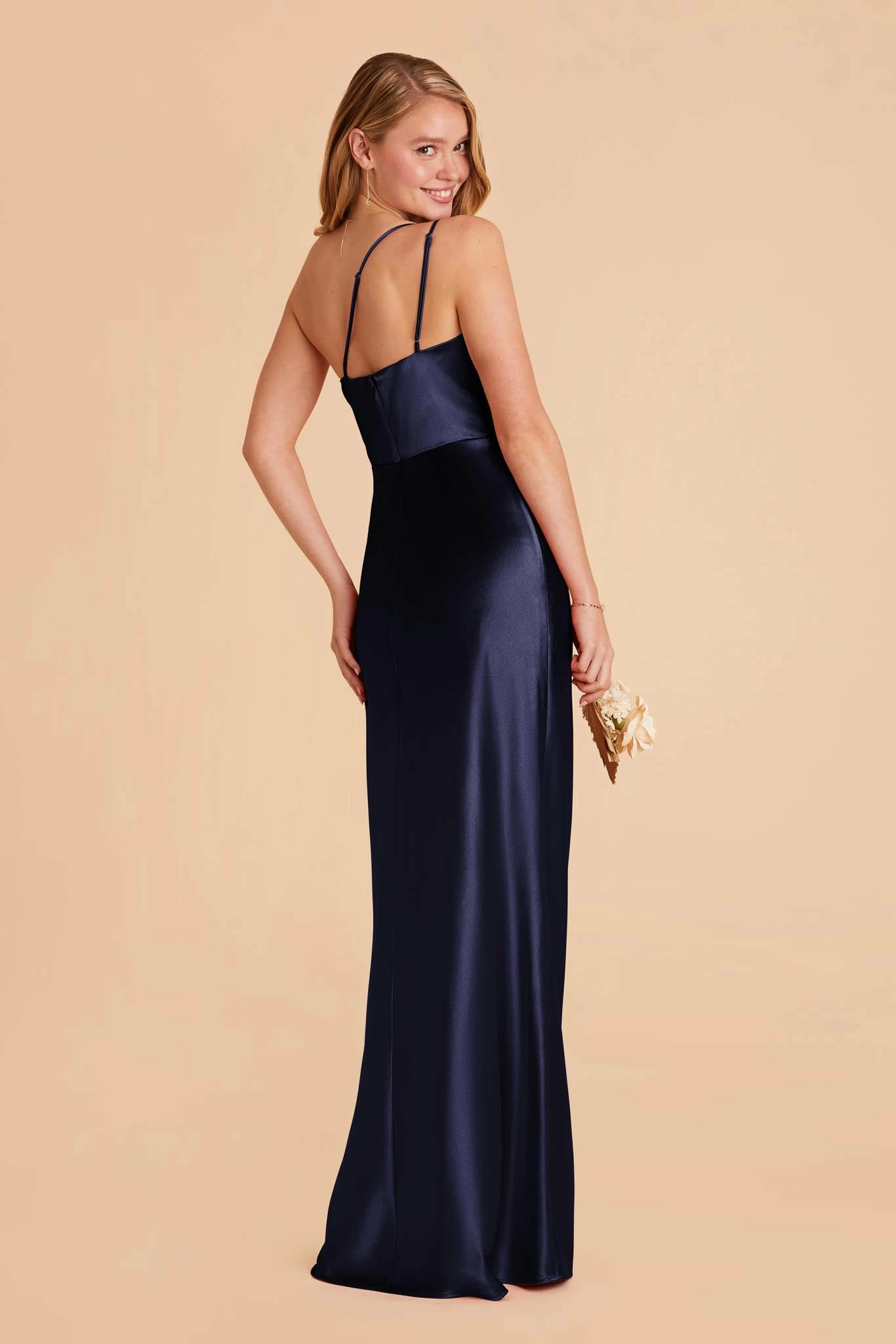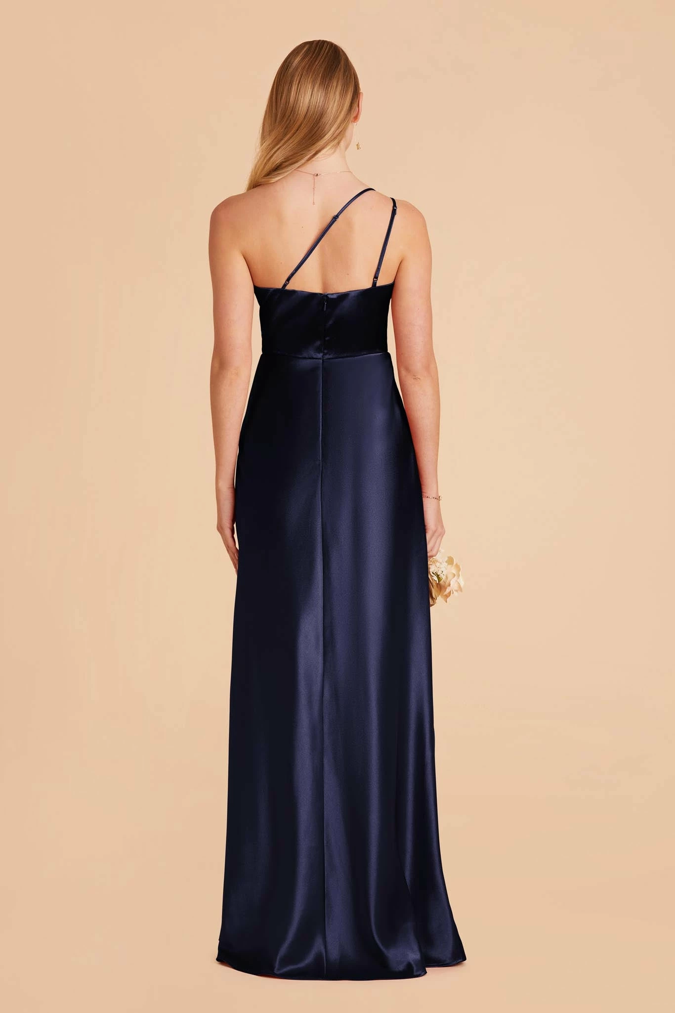 This ultra modern one-shoulder satin bridesmaid dress is the picture of 21st century elegance.