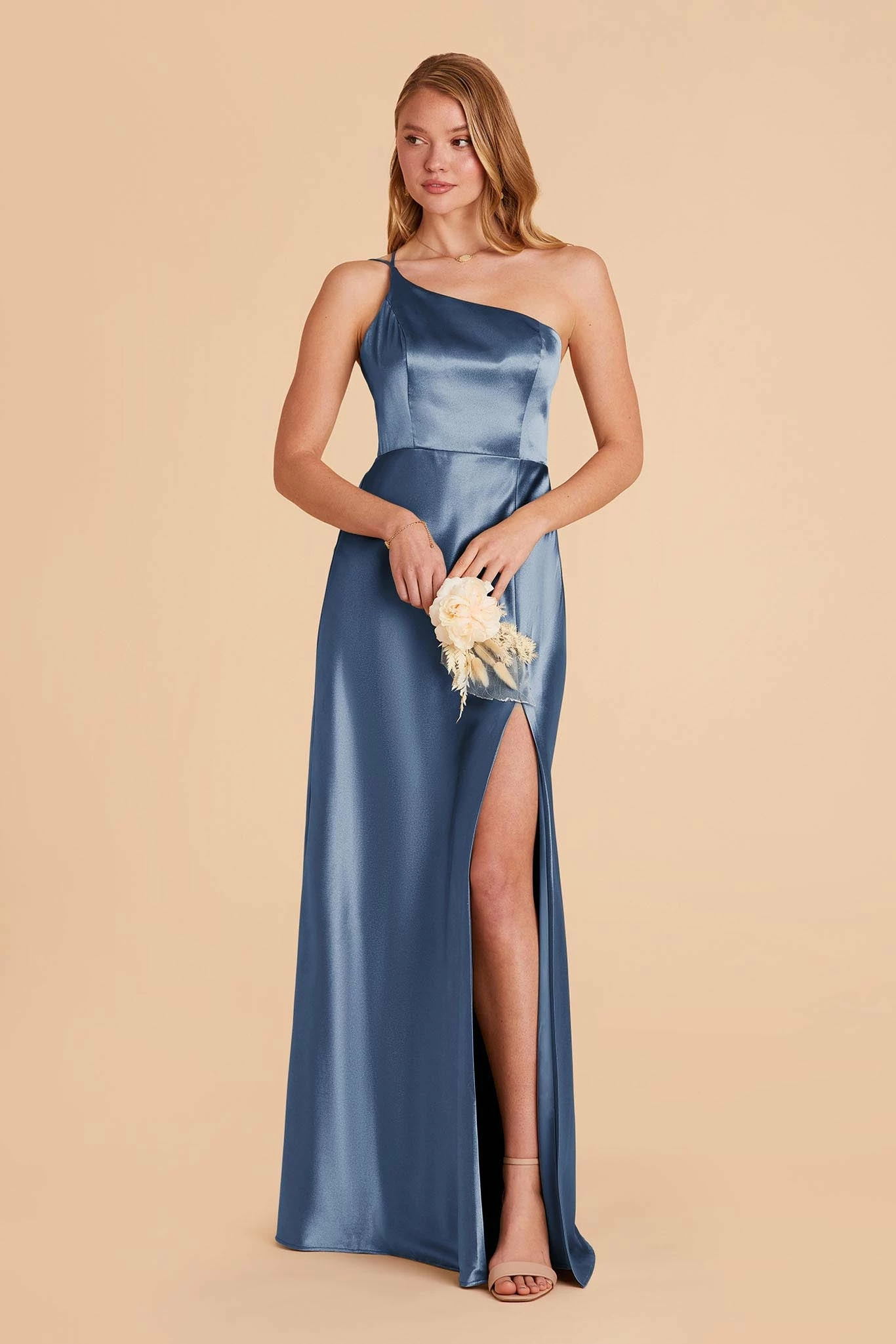 This ultra modern one-shoulder satin bridesmaid dress is the picture of 21st century elegance.
