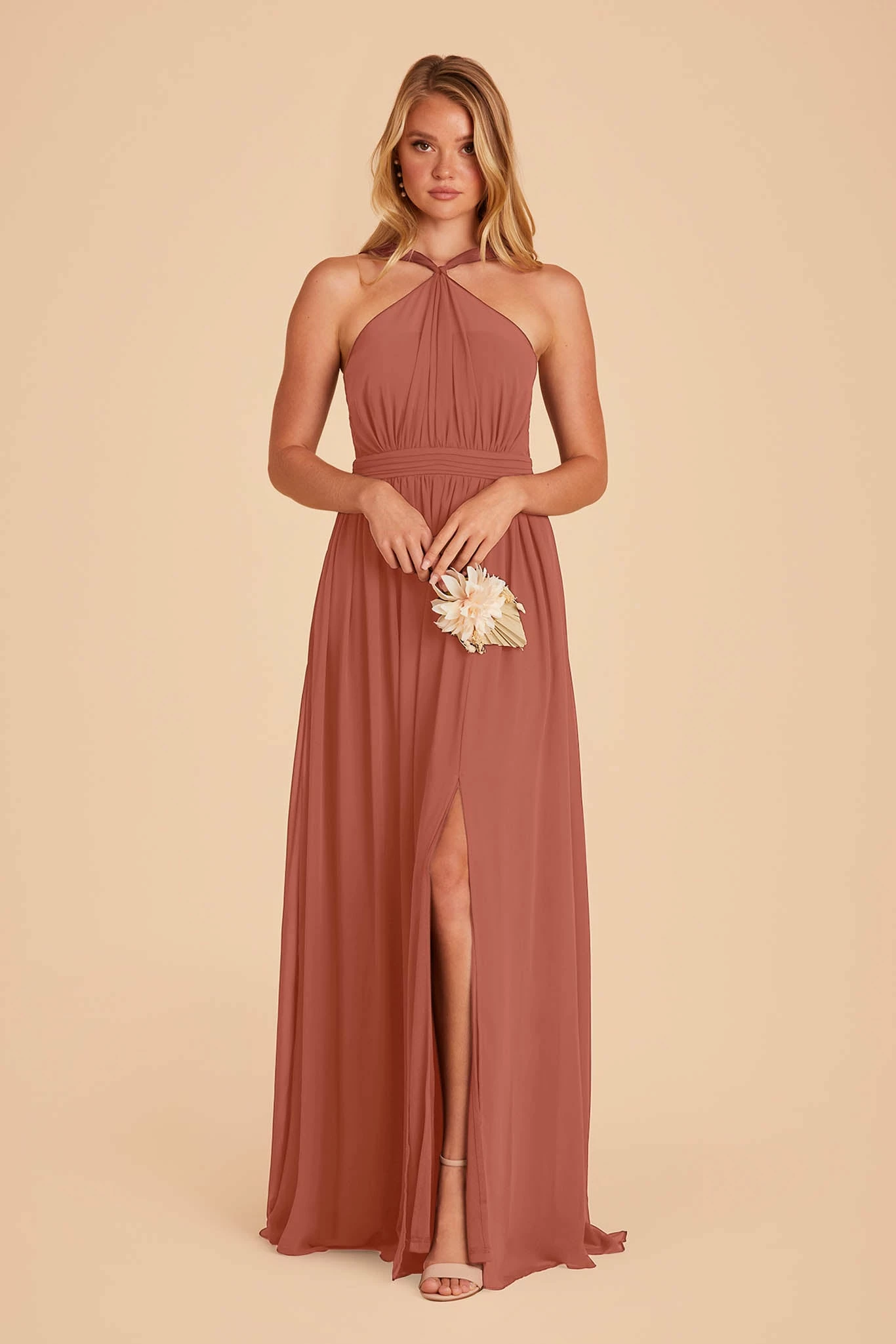 What does every goddess need in order to complete her sleek bridesmaid look? Secret side pockets for stashing her iPhone! This design features a gently ruched high-neck halter silhouette and a sexy slit in the skirt. Kiko in airy chiffon also has built-in bra cups and fits true-to-size.