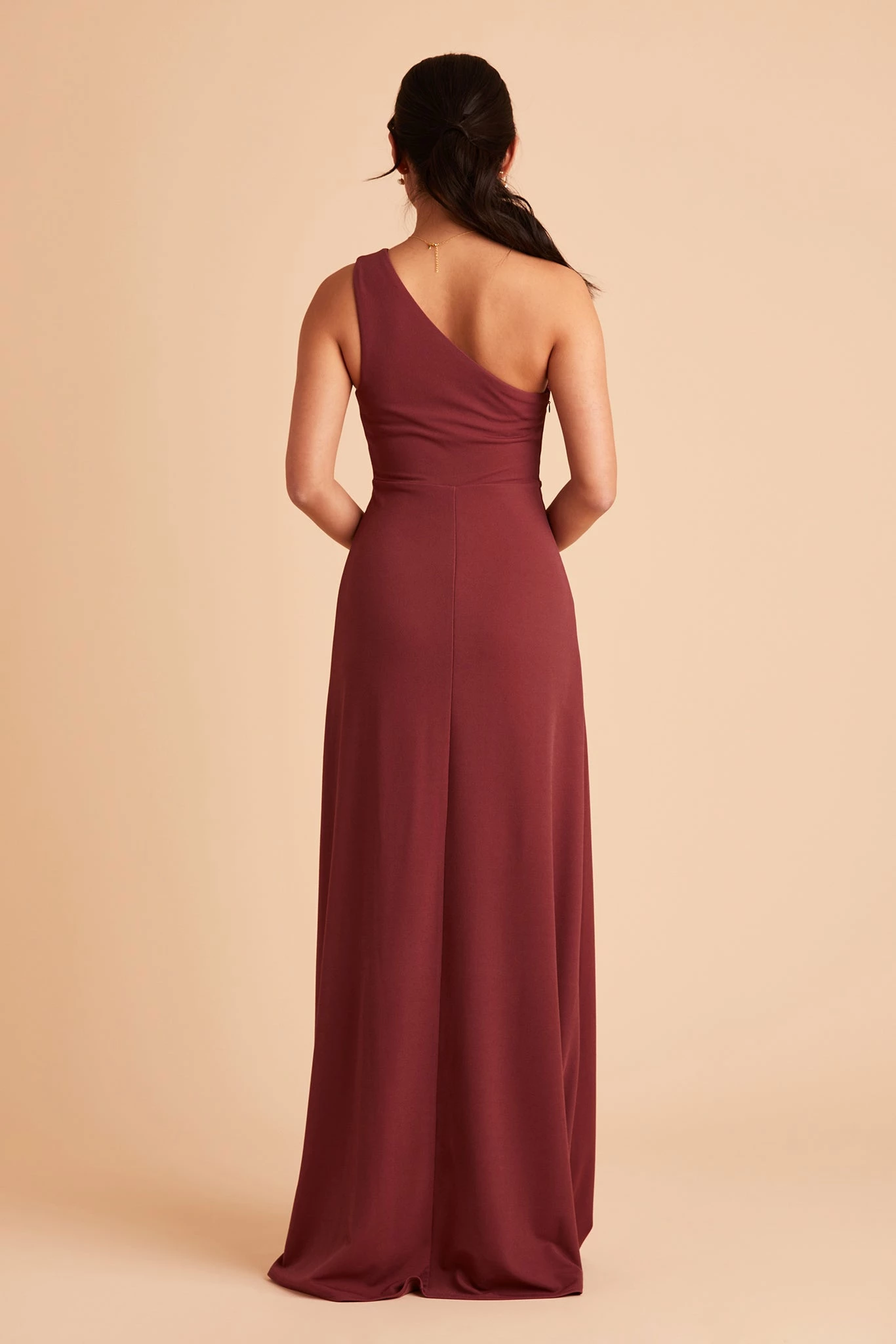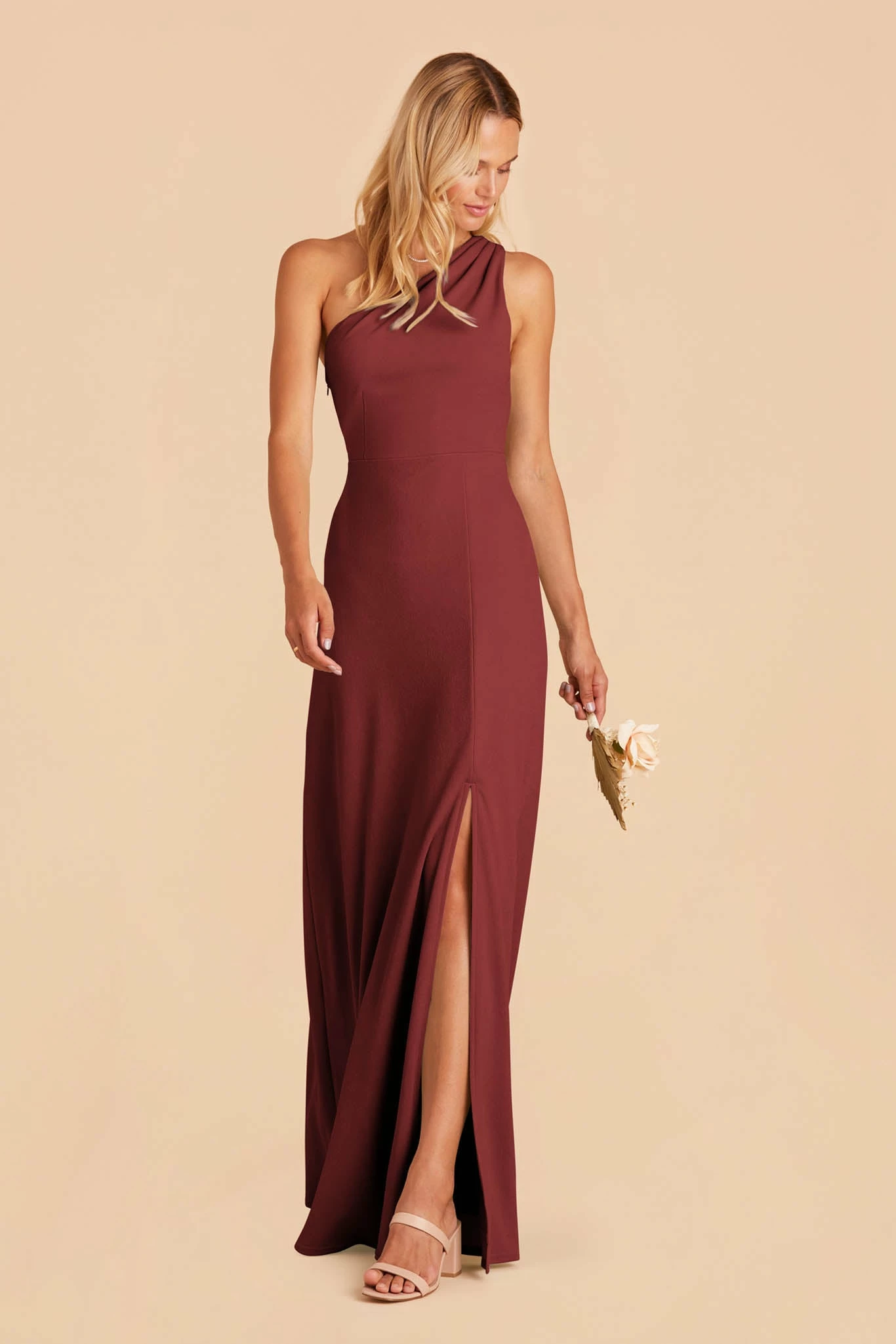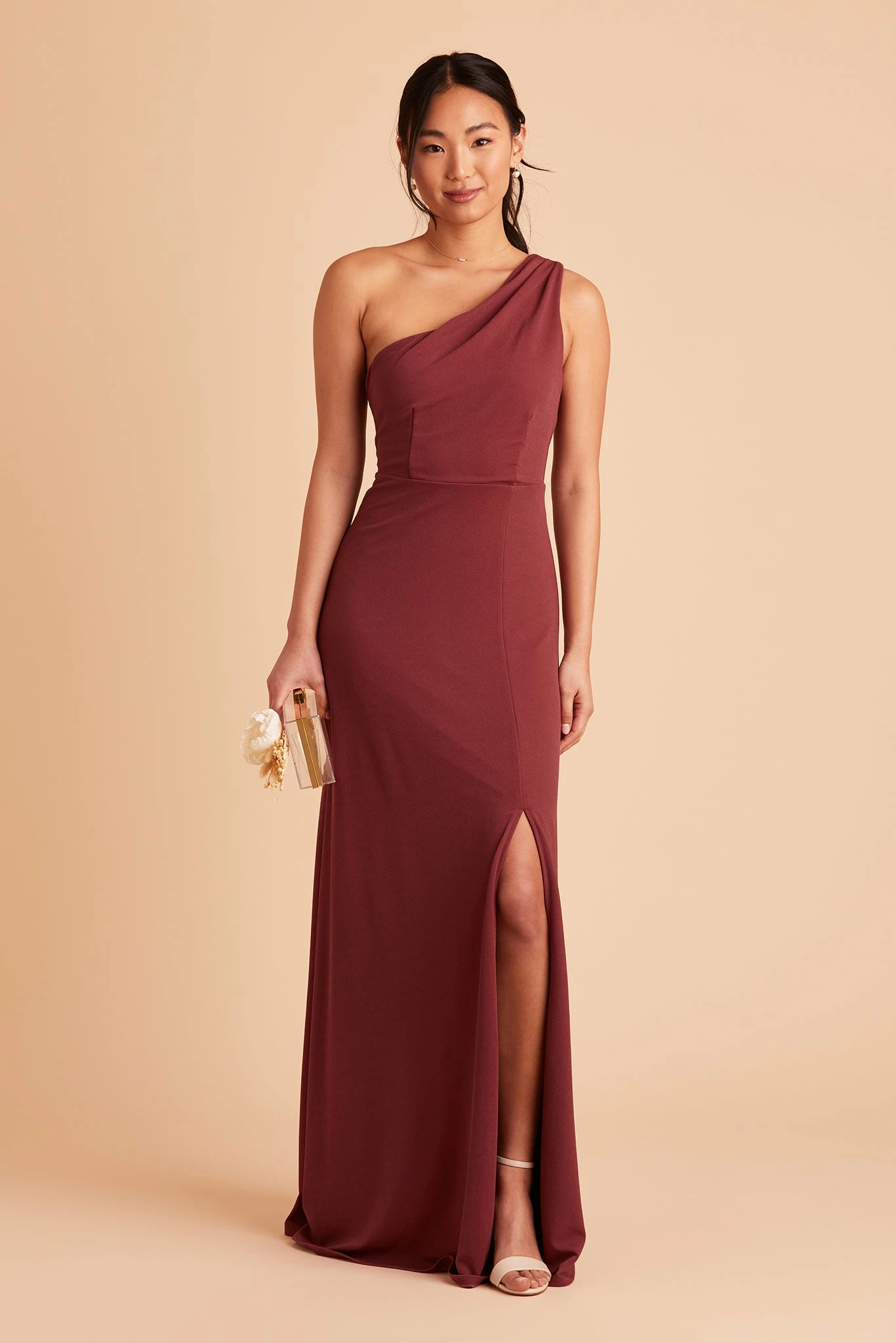 We love a good goddess vibe and this crepe bridesmaid dress does it a newfangled way thanks to our stretchy performance fabric. This one-shoulder bridesmaid dress features soft pleating that fades out at the top of the chest, giving off a proper ladylike vibe and makes for a stellar choice for bridesmaids who tend toward a modest look.