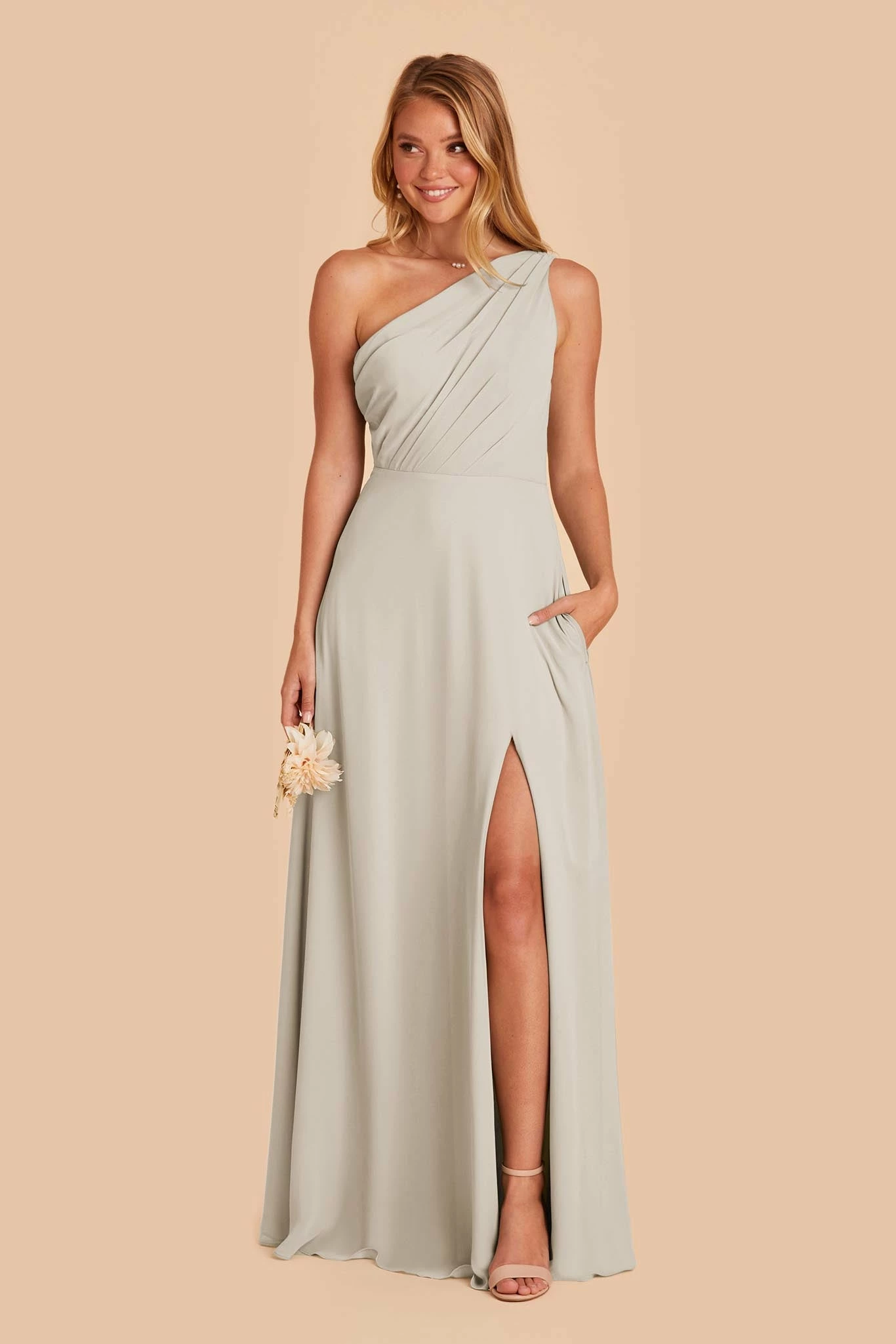 Like you, our Kira bridesmaid dress embodies classic beauty (*kiss*). This flowing chiffon bridesmaid dress is a style staple and no-brainer, if you’re looking to feel like a statuesque Greek goddess. The lightly pulled one shoulder and softly draped back are at once simple and regal, so you can float down the aisle in all your Aphrodite vibes. This dress features built-in bra cups, a flowing skirt, and a hidden side pocket, so you can be prepared with a detergent pen or a safety pin or a disposable camera to capture a precious moment.