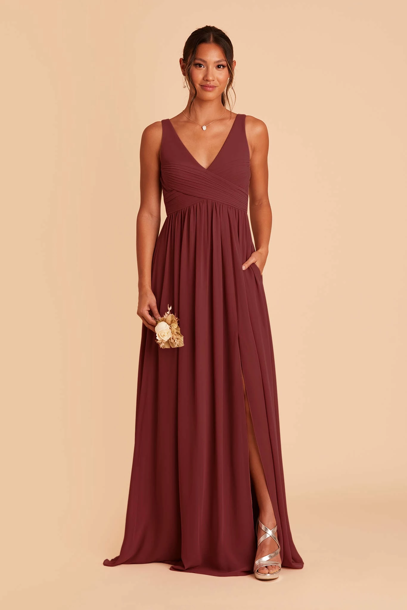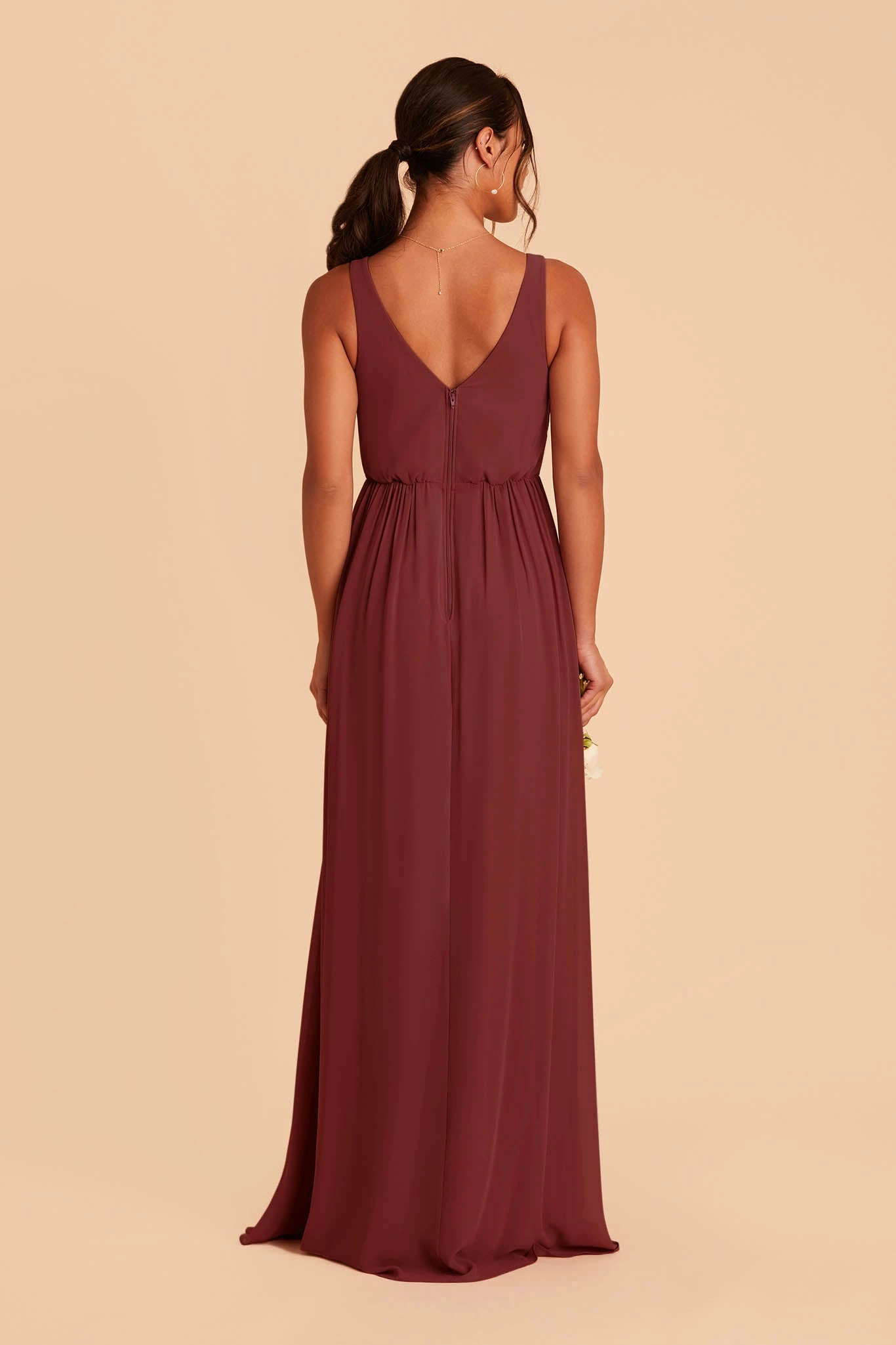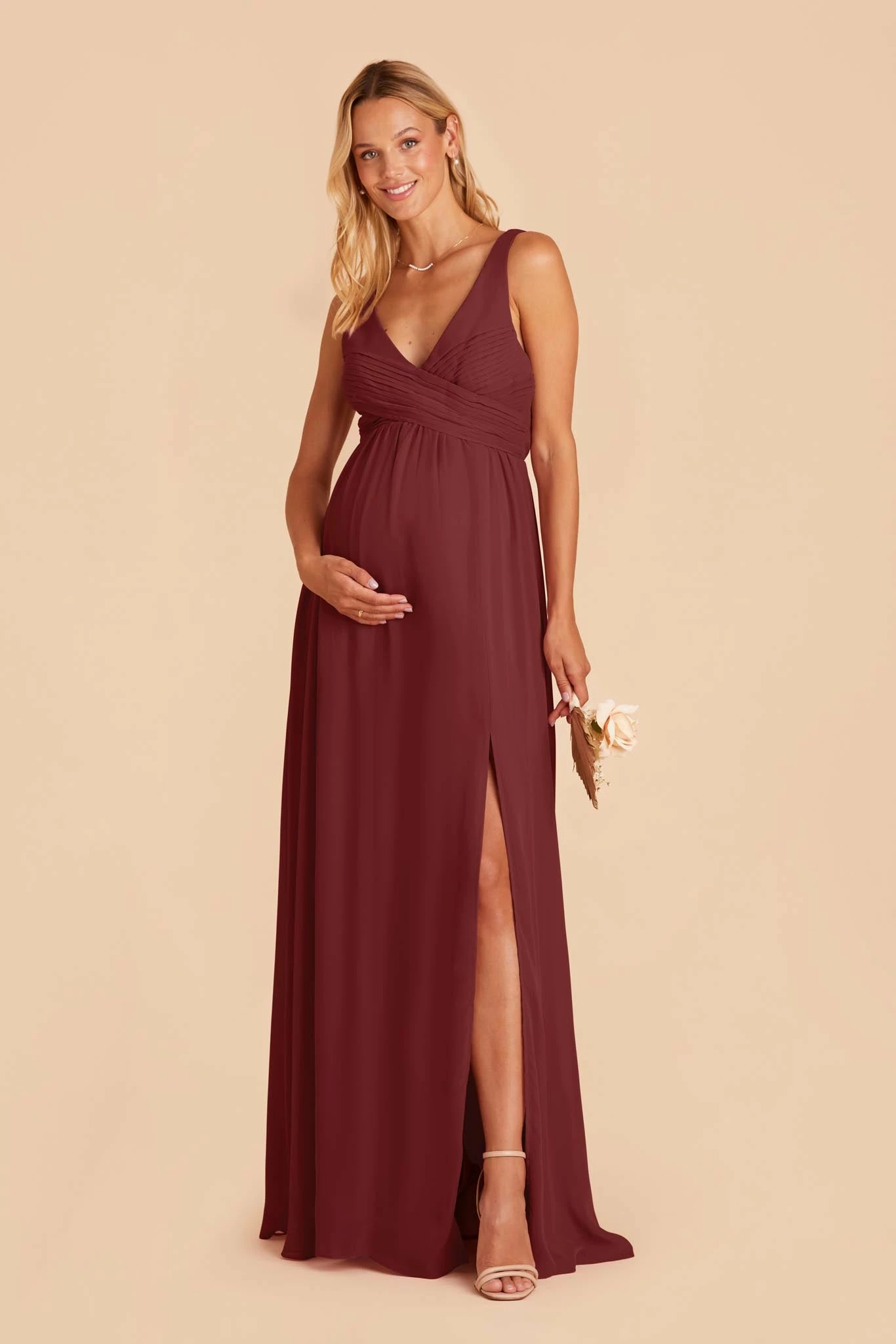 Pretty ✔ Classy ✔ Comfy ✔ This floor-length sleeveless chiffon bridesmaid dress has a raised empire waist which means it’s not only perfect for someone who wants some extra breathing room (while looking long & lean), it also doubles as a maternity bridesmaid dress for expecting moms with a growing baby bump. The bodice features beautiful pleating and because everyone can use a little bit of sex appeal while keeping things classy, we also added a slit for a flash of leg.