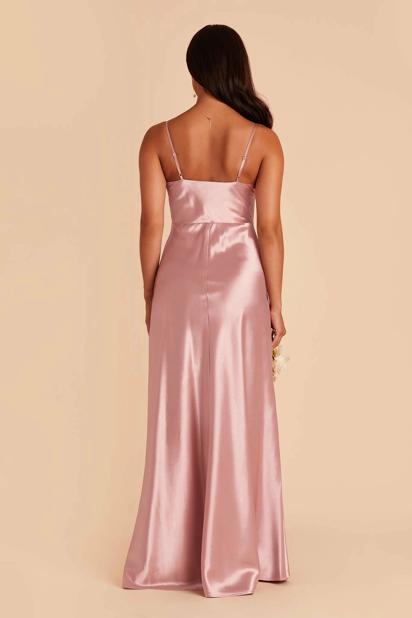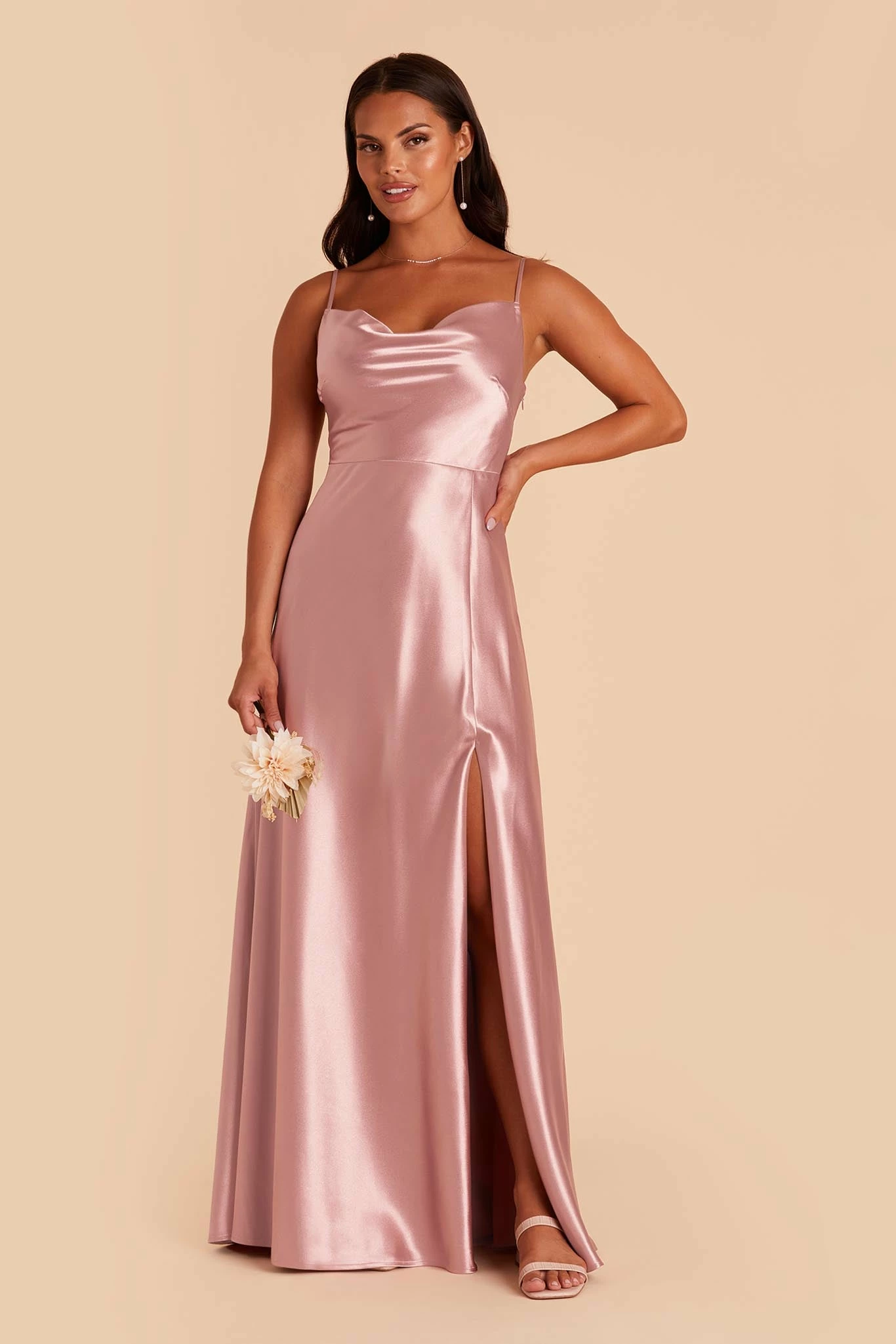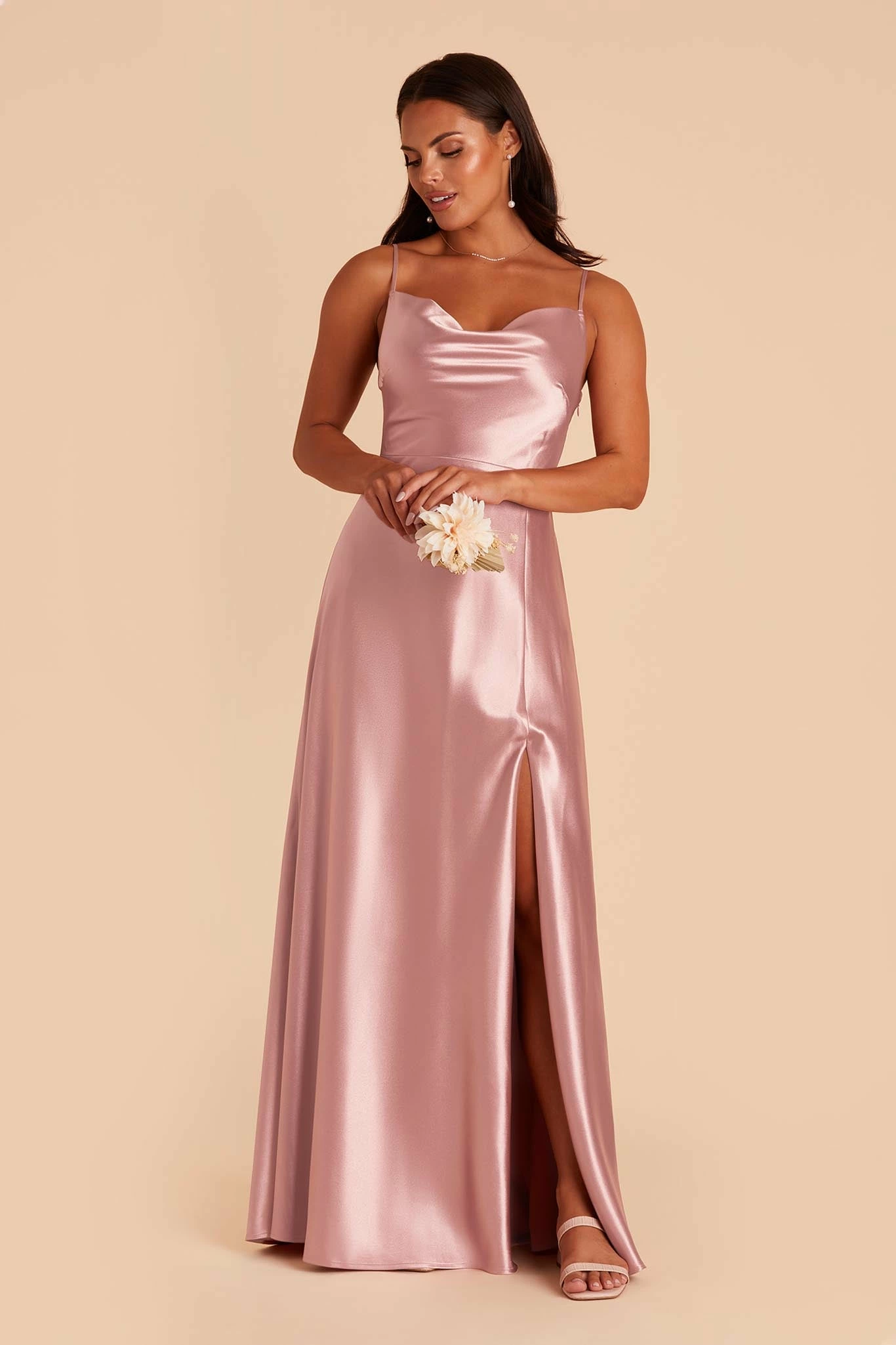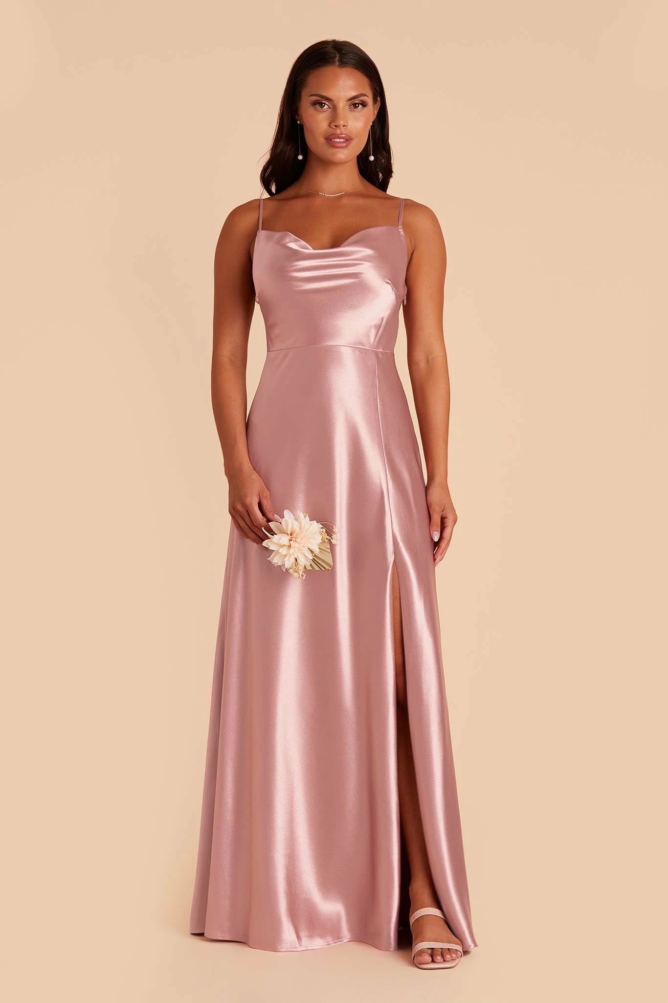 If our Lisa Satin Midi is the young, fun-loving sister, this floor-length one is the elegant, grown-up sis. She still flaunts the same signature ’90s cowl neck, but this Lisa is a head-turning statuesque beauty. We see this satin bridesmaid dress paired with a chic little clutch, and a dainty pearl necklace to accentuate your collarbone.