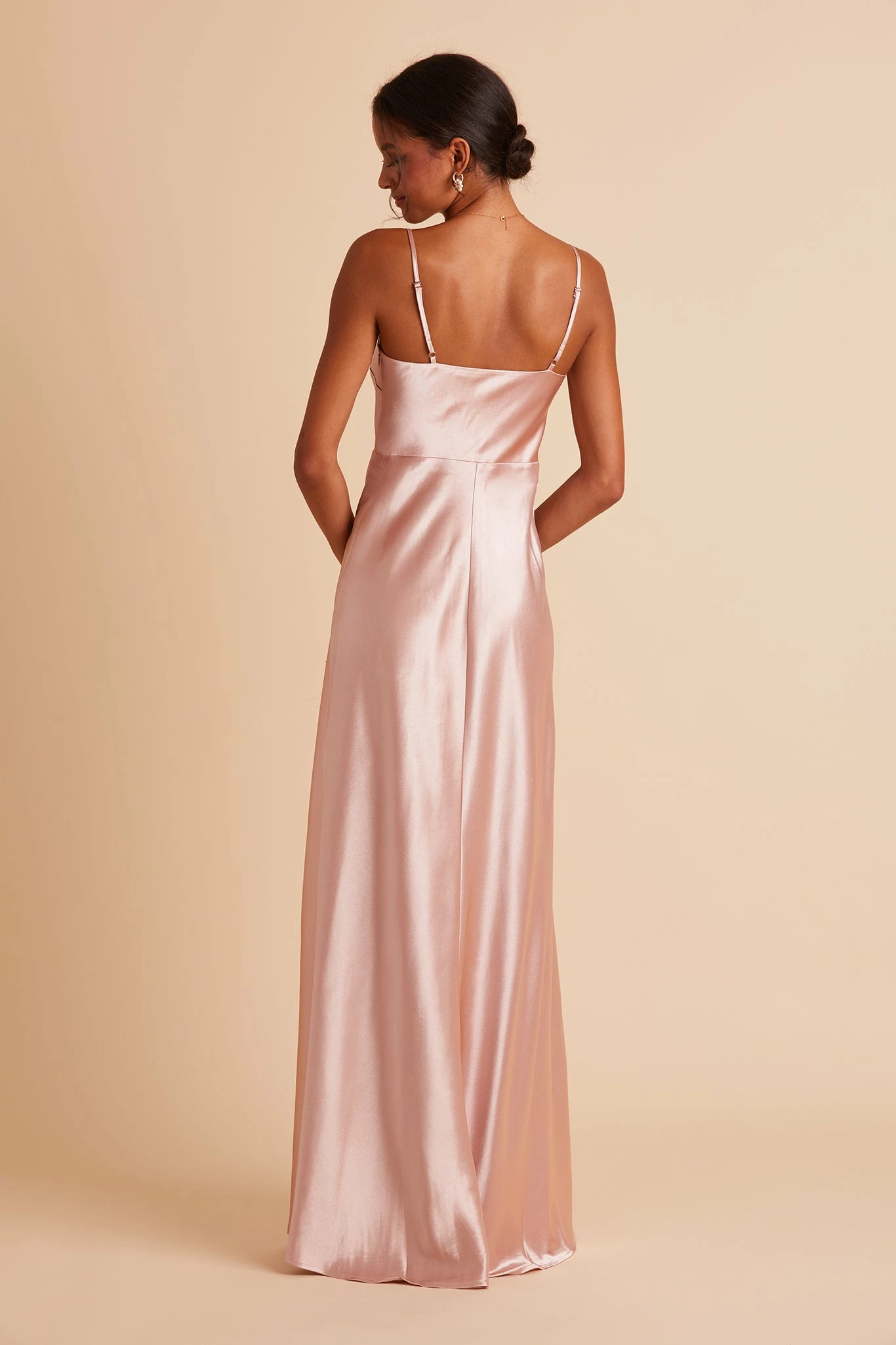 If our Lisa Satin Midi is the young, fun-loving sister, this floor-length one is the elegant, grown-up sis. She still flaunts the same signature ’90s cowl neck, but this Lisa is a head-turning statuesque beauty. We see this satin bridesmaid dress paired with a chic little clutch, and a dainty pearl necklace to accentuate your collarbone.