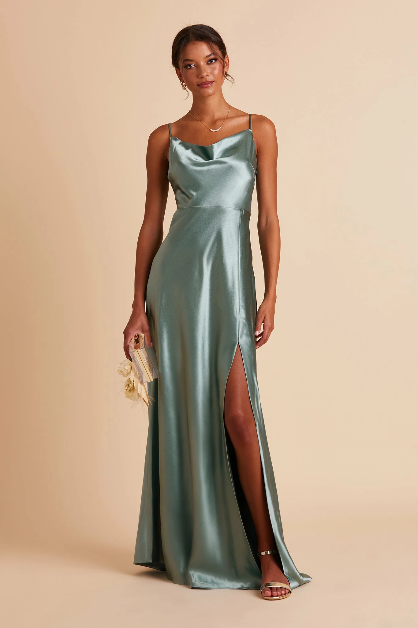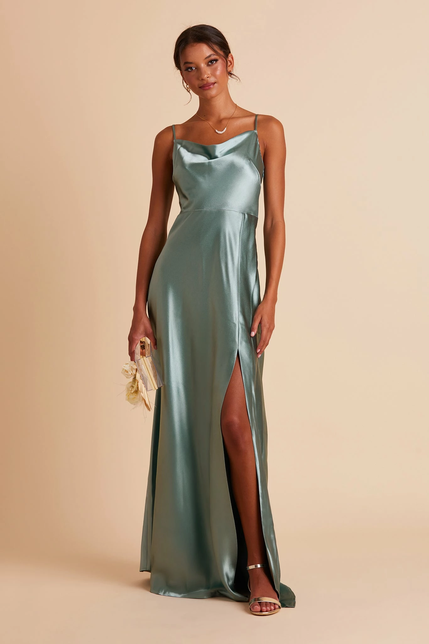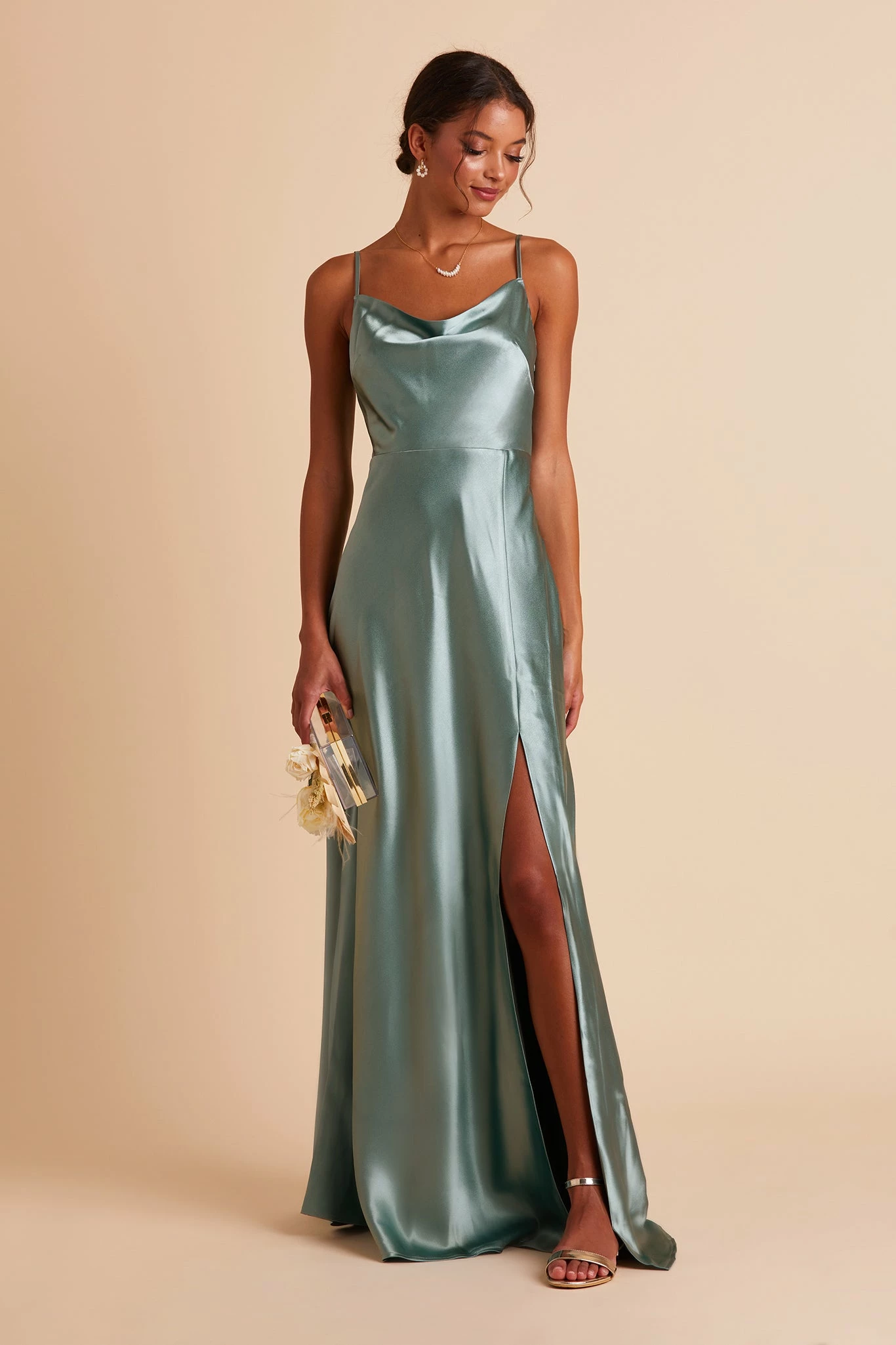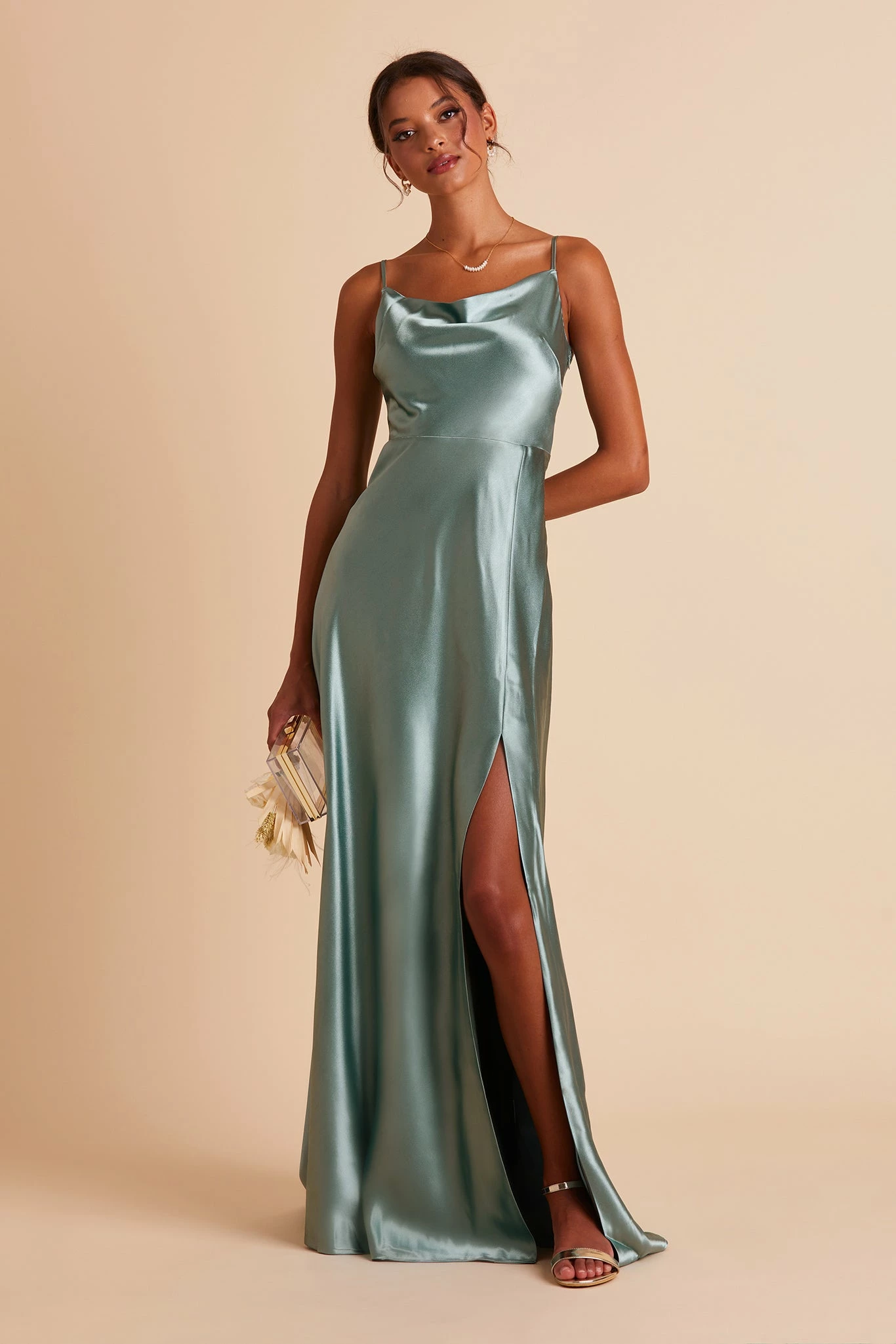 If our Lisa Satin Midi is the young, fun-loving sister, this floor-length one is the elegant, grown-up sis. She still flaunts the same signature ’90s cowl neck, but this Lisa is a head-turning statuesque beauty. We see this satin bridesmaid dress paired with a chic little clutch, and a dainty pearl necklace to accentuate your collarbone.
