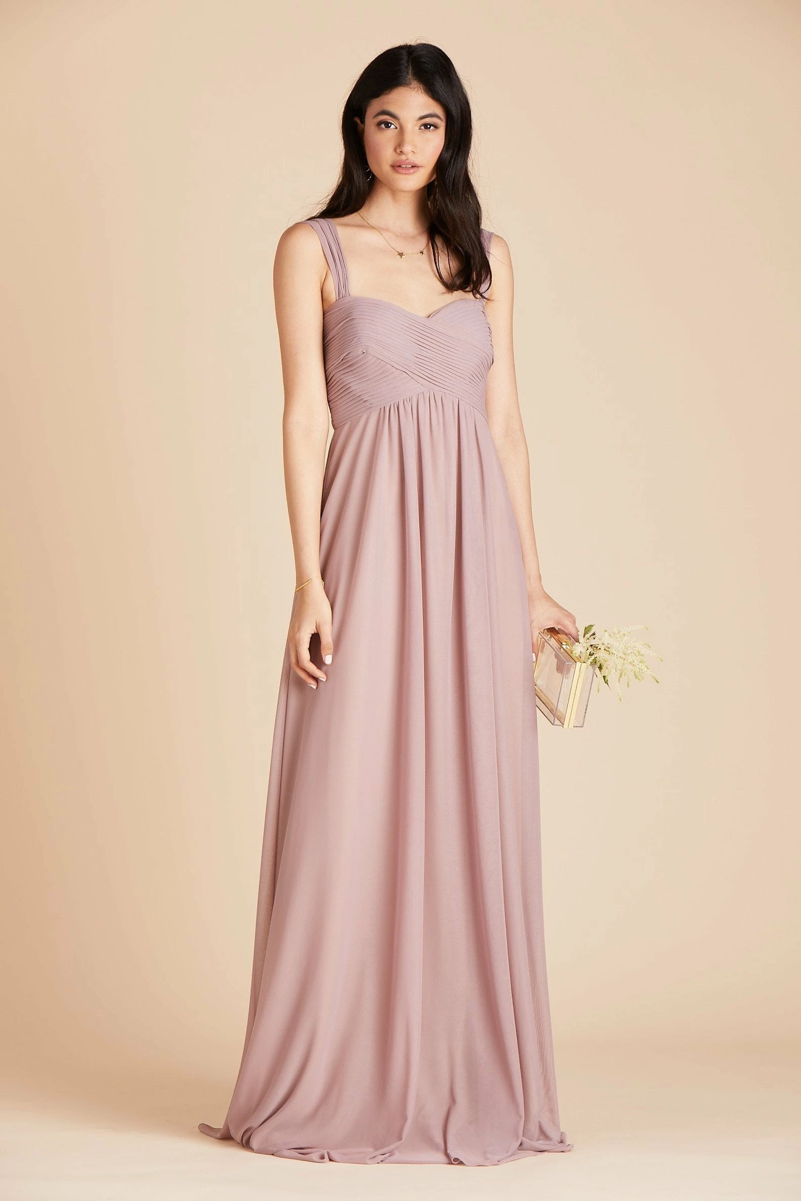 It’s all about the convertible straps here! This empire waist bridesmaid dress is spun of breathable mesh and comes with genius straps that you can wear in 3 different ways. Wear it with thick straps, which is our go-to, for a gorgeous portrait neckline, or bring the straps in together for a thinner look. Lastly, if you want more coverage for your arms, you can bring the sleeves down for flouncy flutter sleeves. It features a really special criss-cross pleating with built-in cups and thanks to its raised empire wasitline, it’s also baby bump-friendly (or you know, that extra slice of cake).