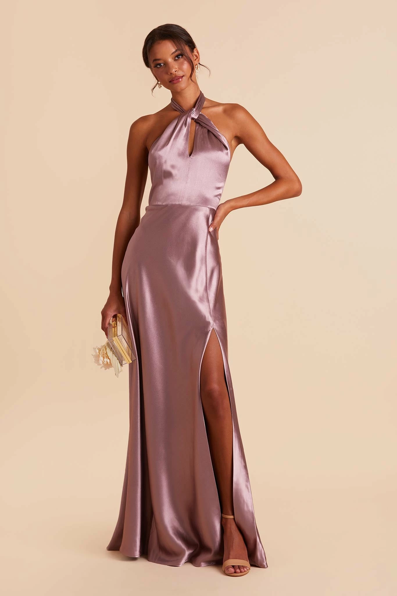 Your wedding will look like a star-studded event with your bridal party wearing this twist-front halter satin bridesmaid dress. The lustrous fabric of this floor-length gown makes each color look rich and regal while the halter style creates an alluring look that’s on par with an A-list Hollywood star. We love this bridesmaid dress paired with a low bun that softens the cool, modern style while showing off the neckline.