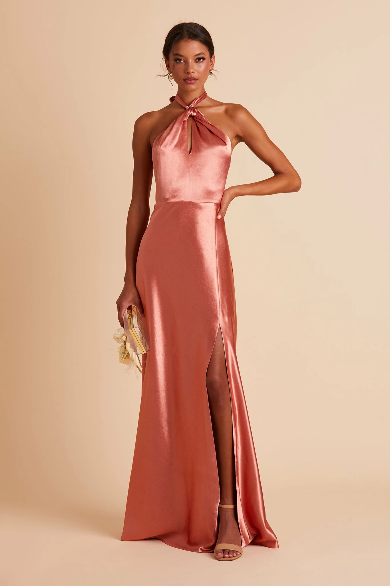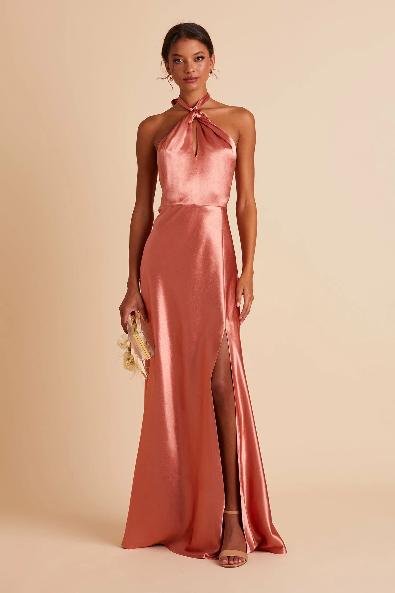 Your wedding will look like a star-studded event with your bridal party wearing this twist-front halter satin bridesmaid dress. The lustrous fabric of this floor-length gown makes each color look rich and regal while the halter style creates an alluring look that’s on par with an A-list Hollywood star. We love this bridesmaid dress paired with a low bun that softens the cool, modern style while showing off the neckline.