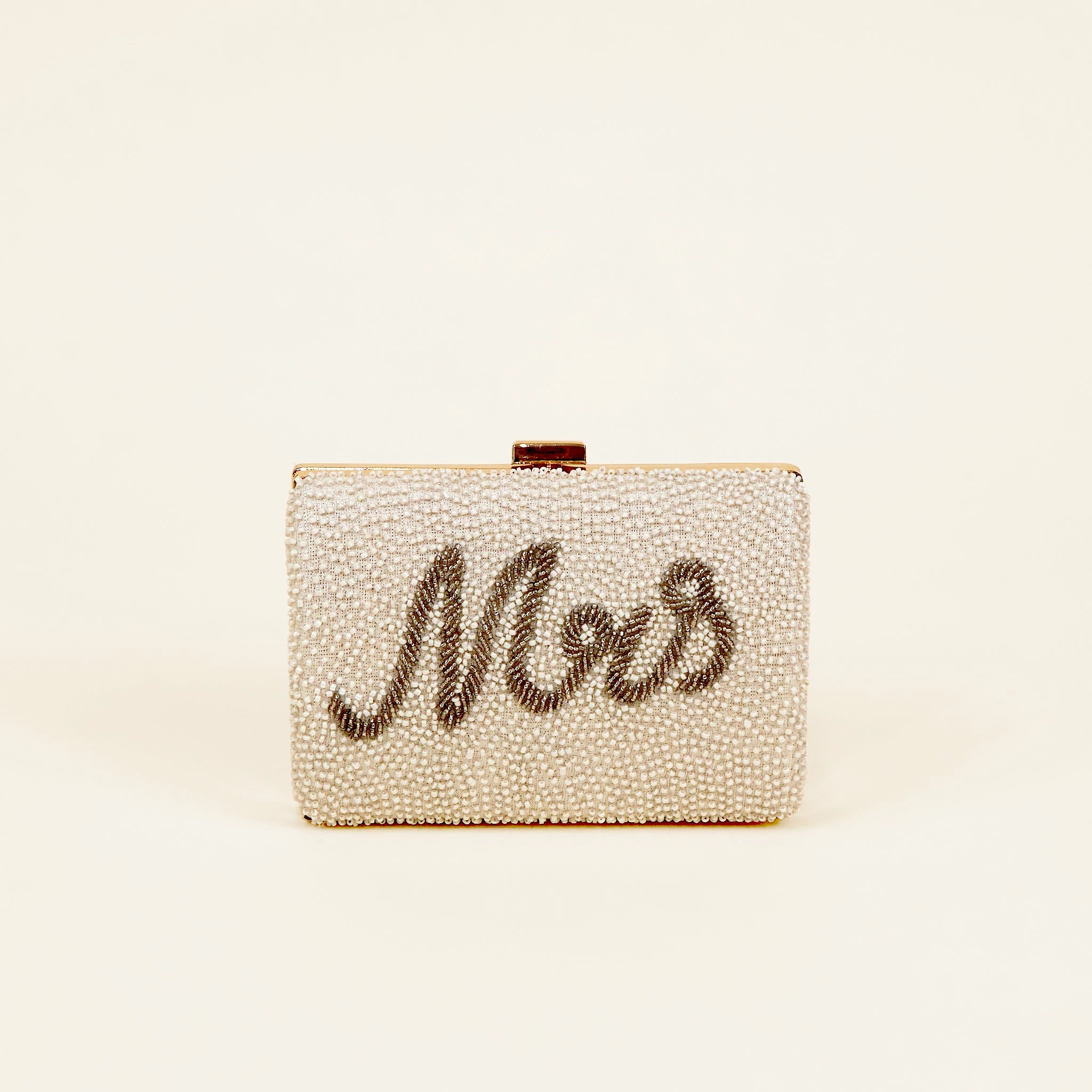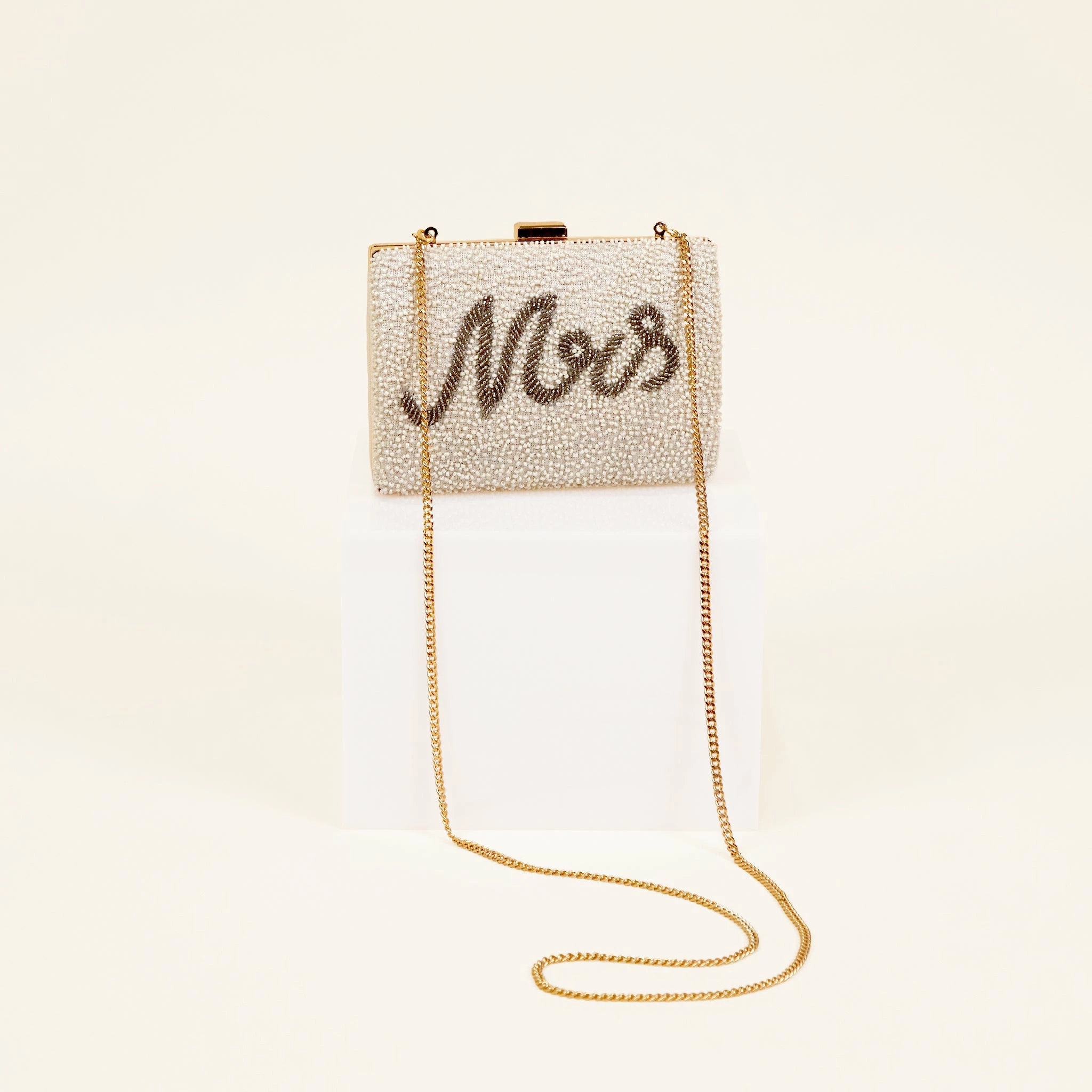 To have and to hold all of your wedding day essentials. We’re swooning over the intricate beading and timeless cursive lettering on this little purse perfect for the bride to carry on the big day.