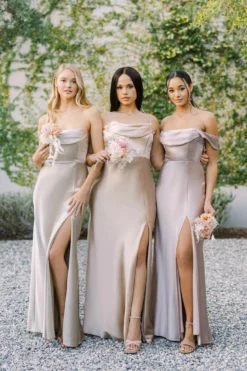 Eugenia Shiny Satin Convertible Midi Dress – Neutral Champagne