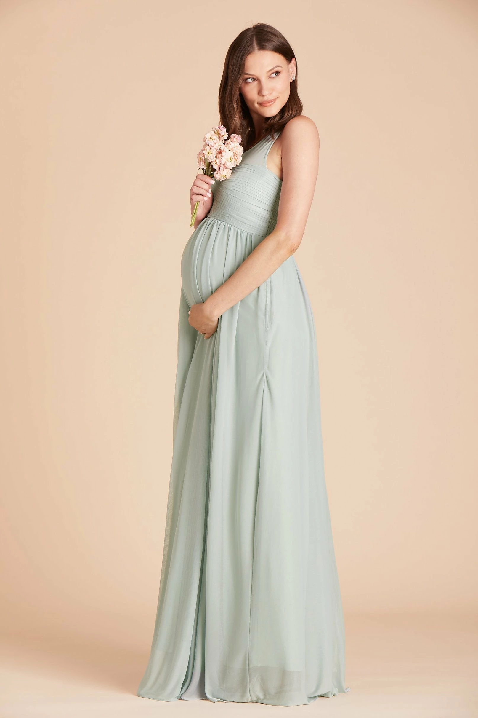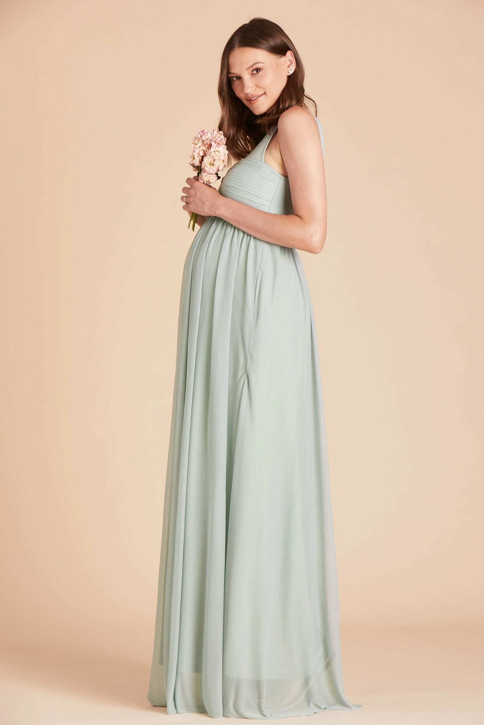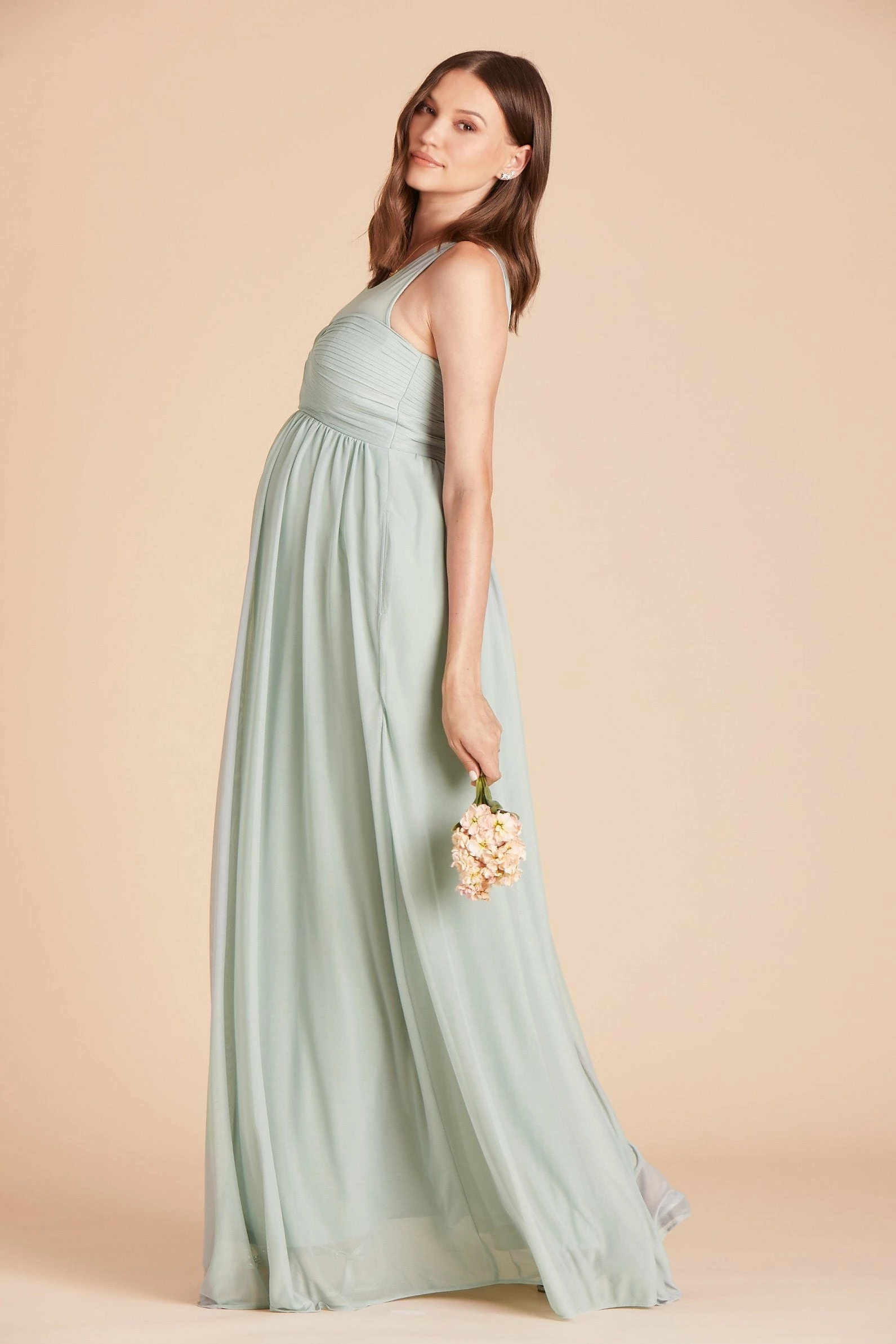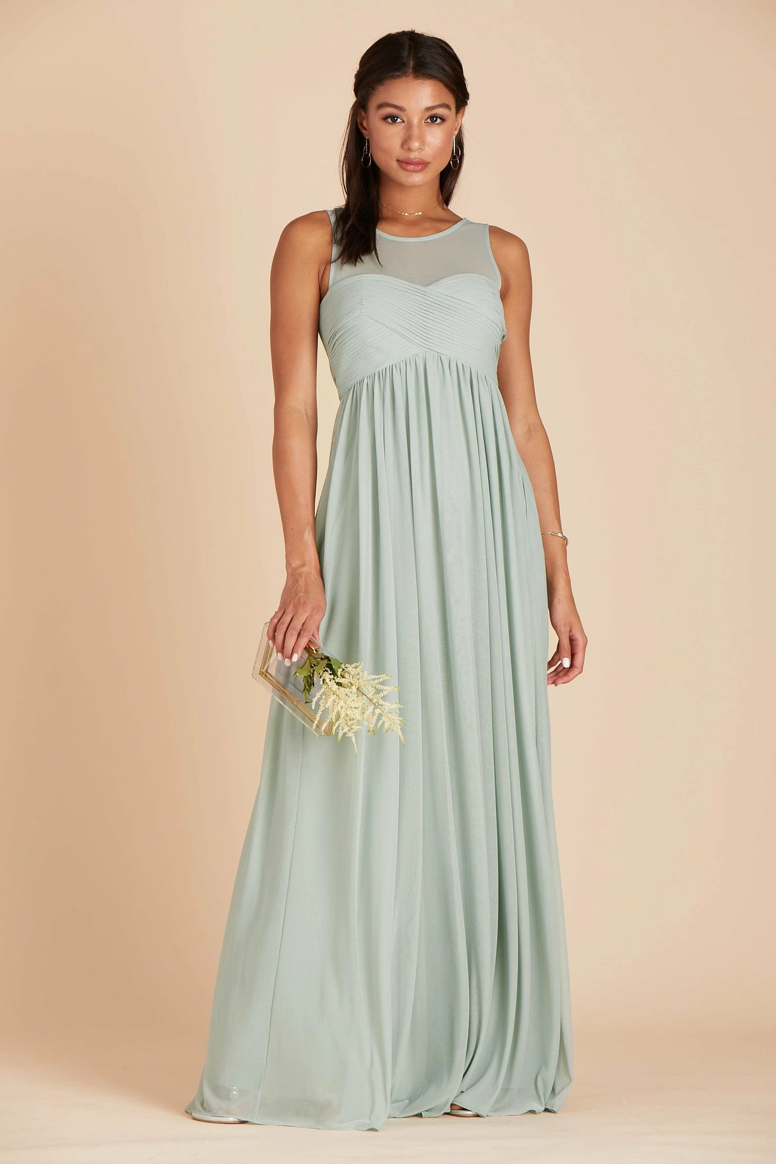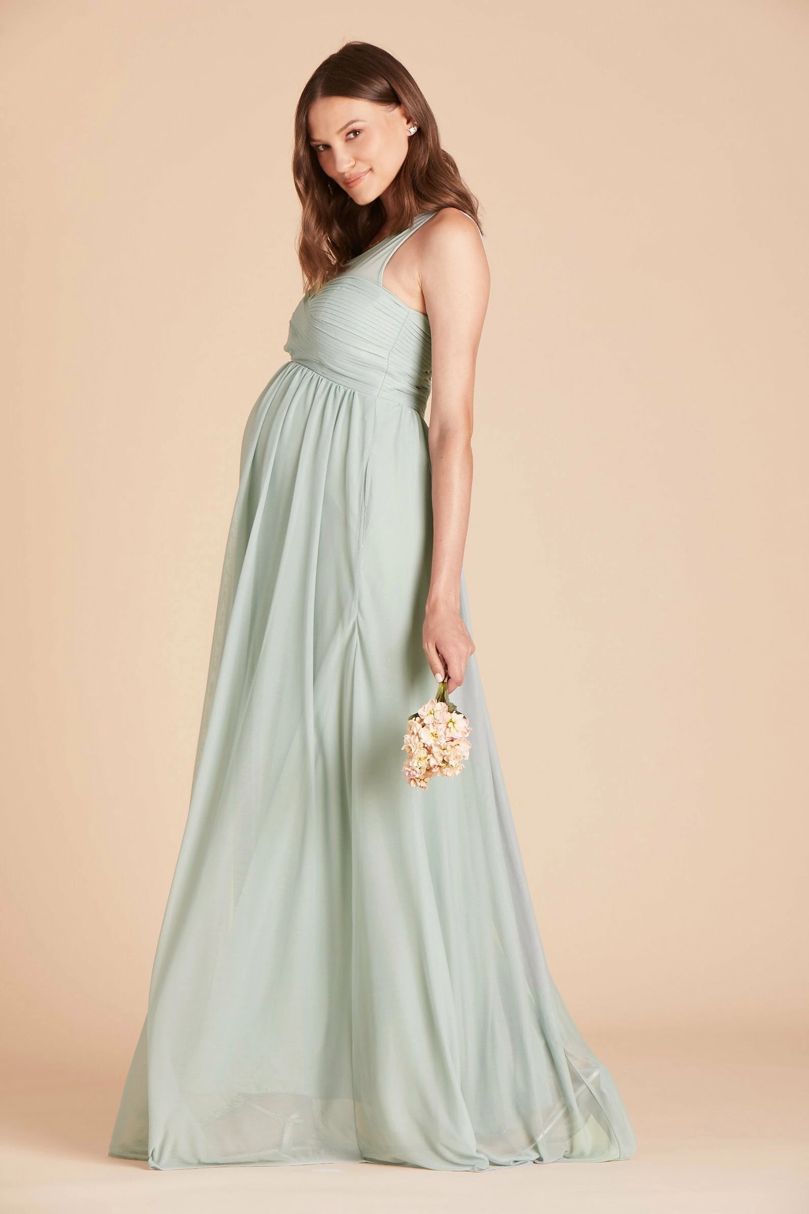 Kick back, relax and enjoy the wedding in our burgundy Ryan Dress, spun of super-comfy stretch mesh with a sheer illusion neckline. The column design creates a long & lean silhouette, while a raised empire waist allows for wiggle room, so that you can move/eat/dance with ease. *Doubles as a maternity bridesmaid dress to show off a cute baby bump.