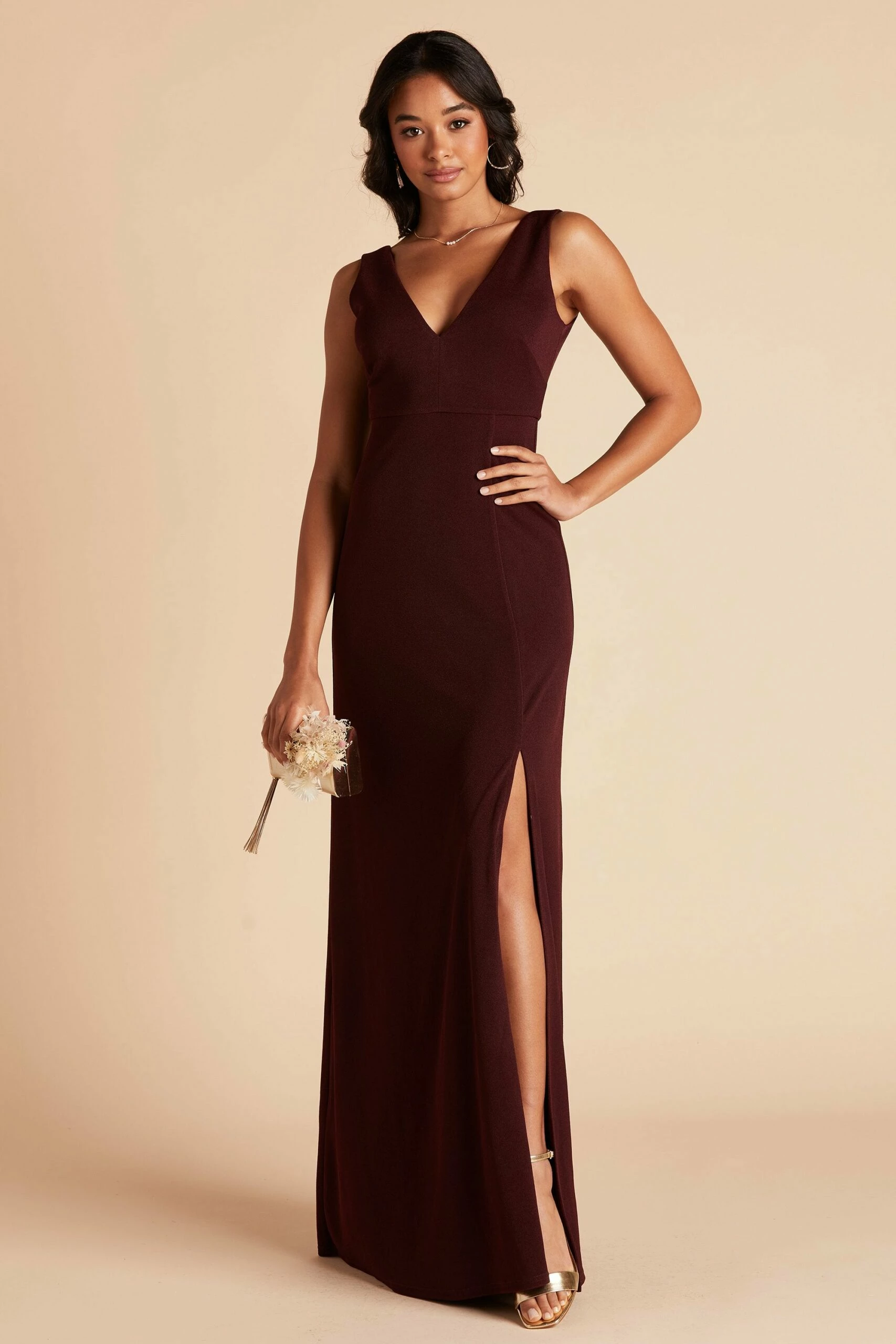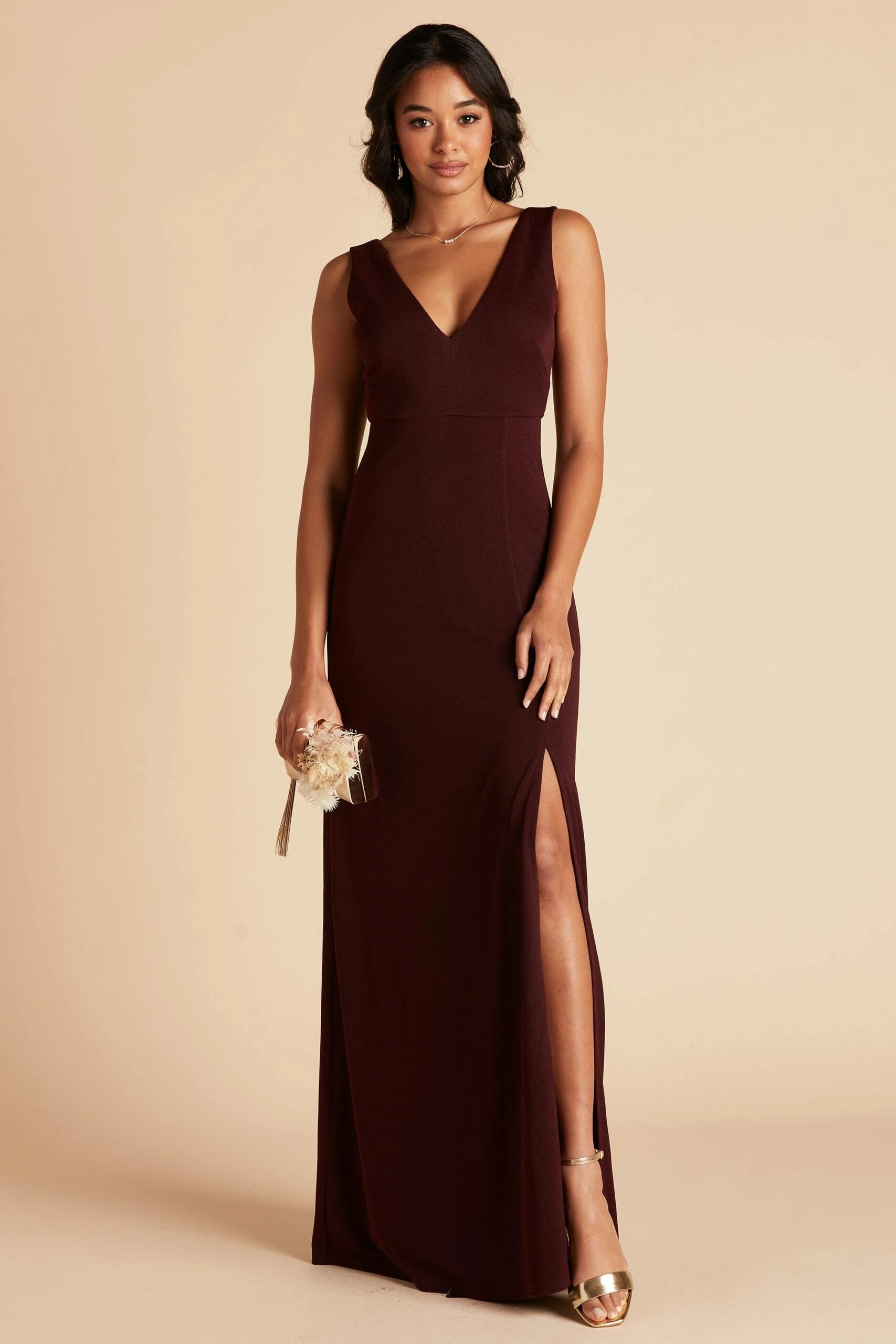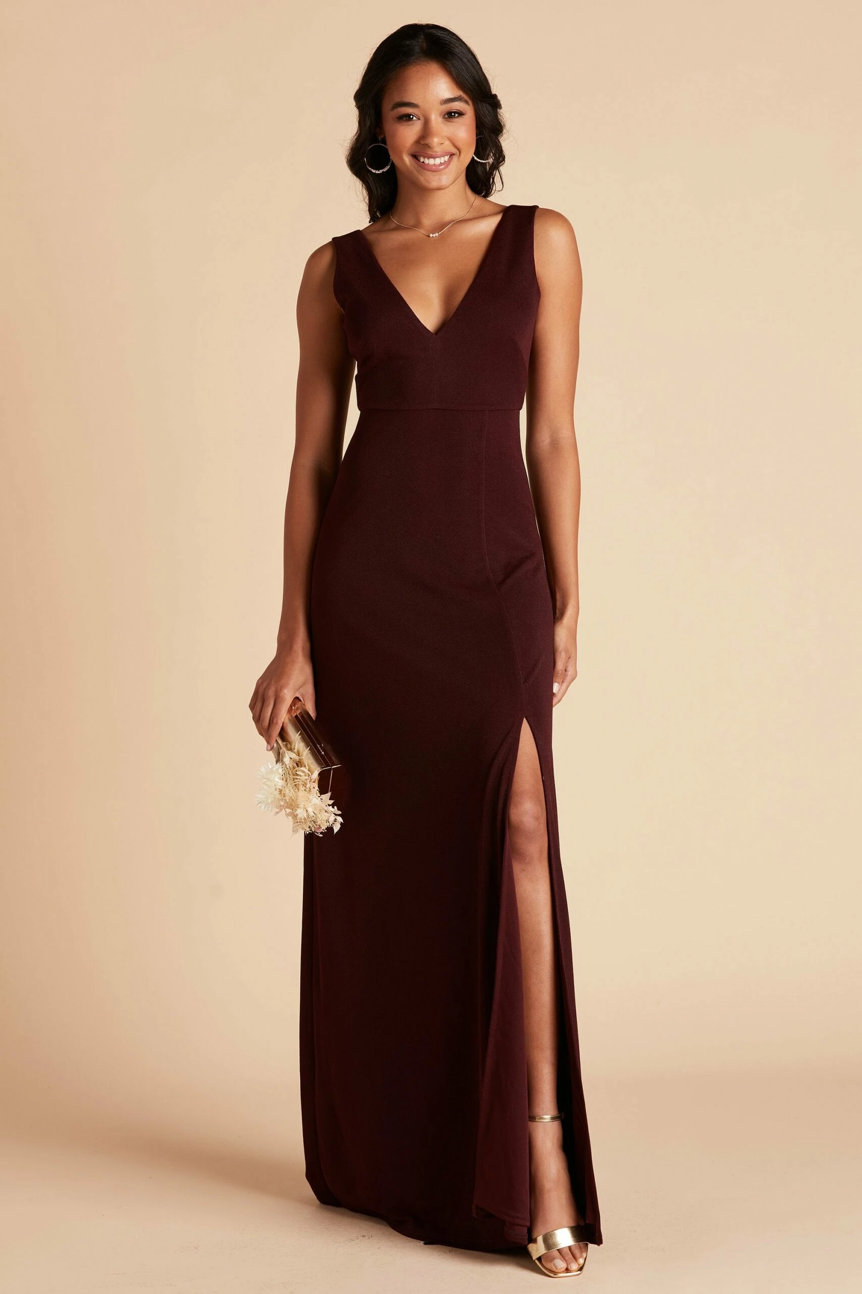 Sleek, modern and minimal is our Shamin bridesmaid dress, featuring a plunging V neckline and body-skimming fit. She’s designed in a comfy stretch knit crepe with a sexy front slit to show off a flash of skin. We can’t say this about all bridesmaid dresses, but she’s one you can definitely rock again long after the wedding.