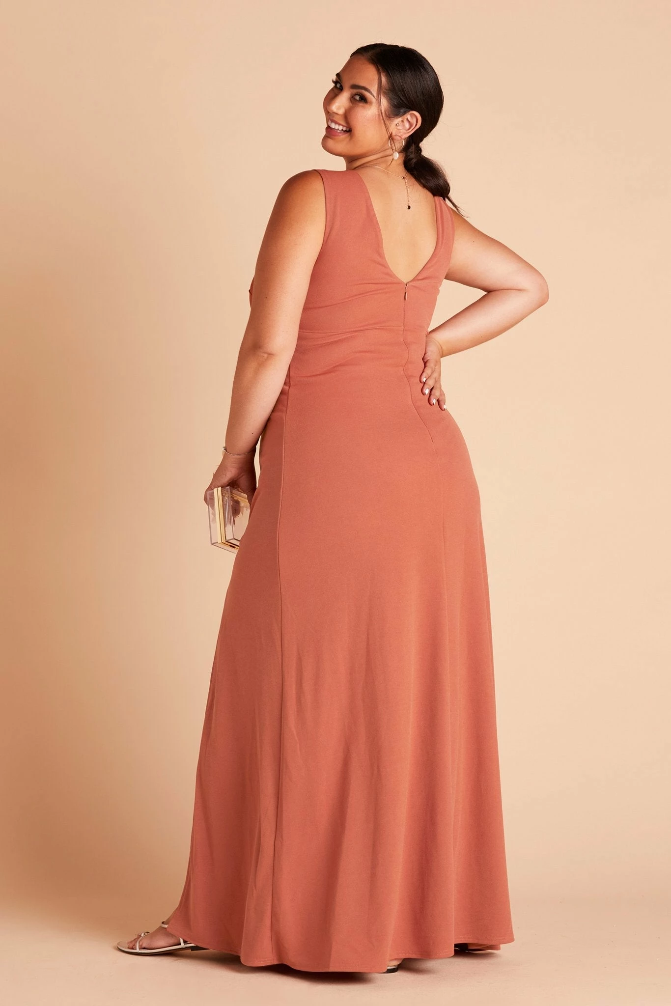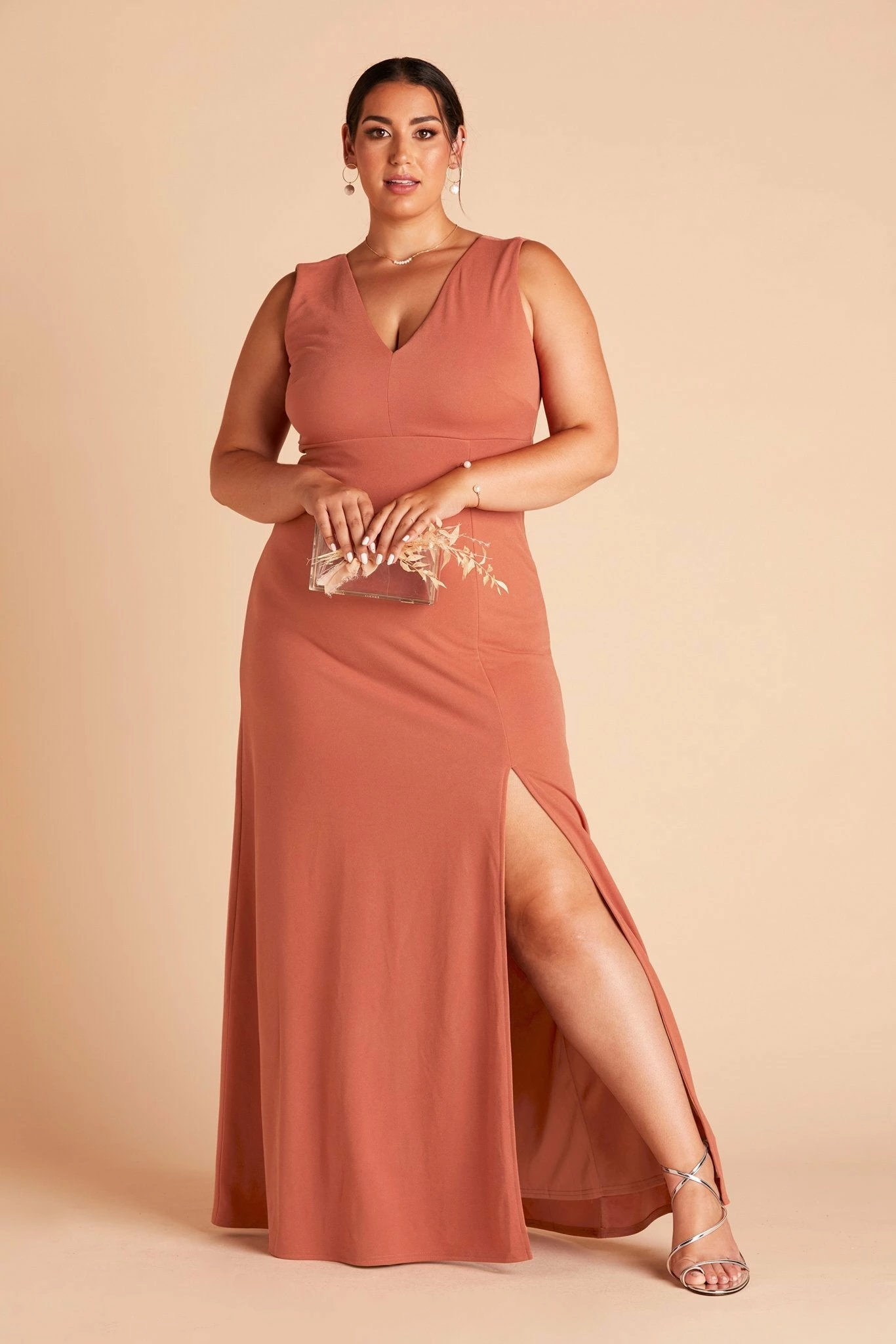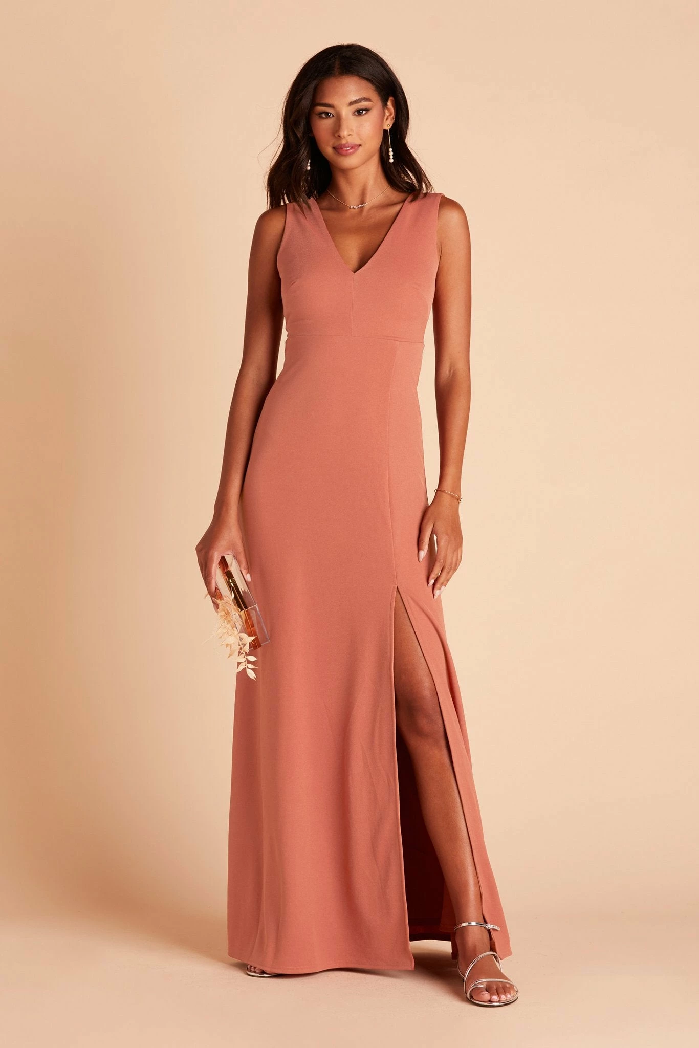 Sleek, modern and minimal is our Shamin bridesmaid dress, featuring a plunging V neckline and body-skimming fit. She’s designed in a comfy stretch knit crepe with a sexy front slit to show off a flash of skin. We can’t say this about all bridesmaid dresses, but she’s one you can definitely rock again long after the wedding.