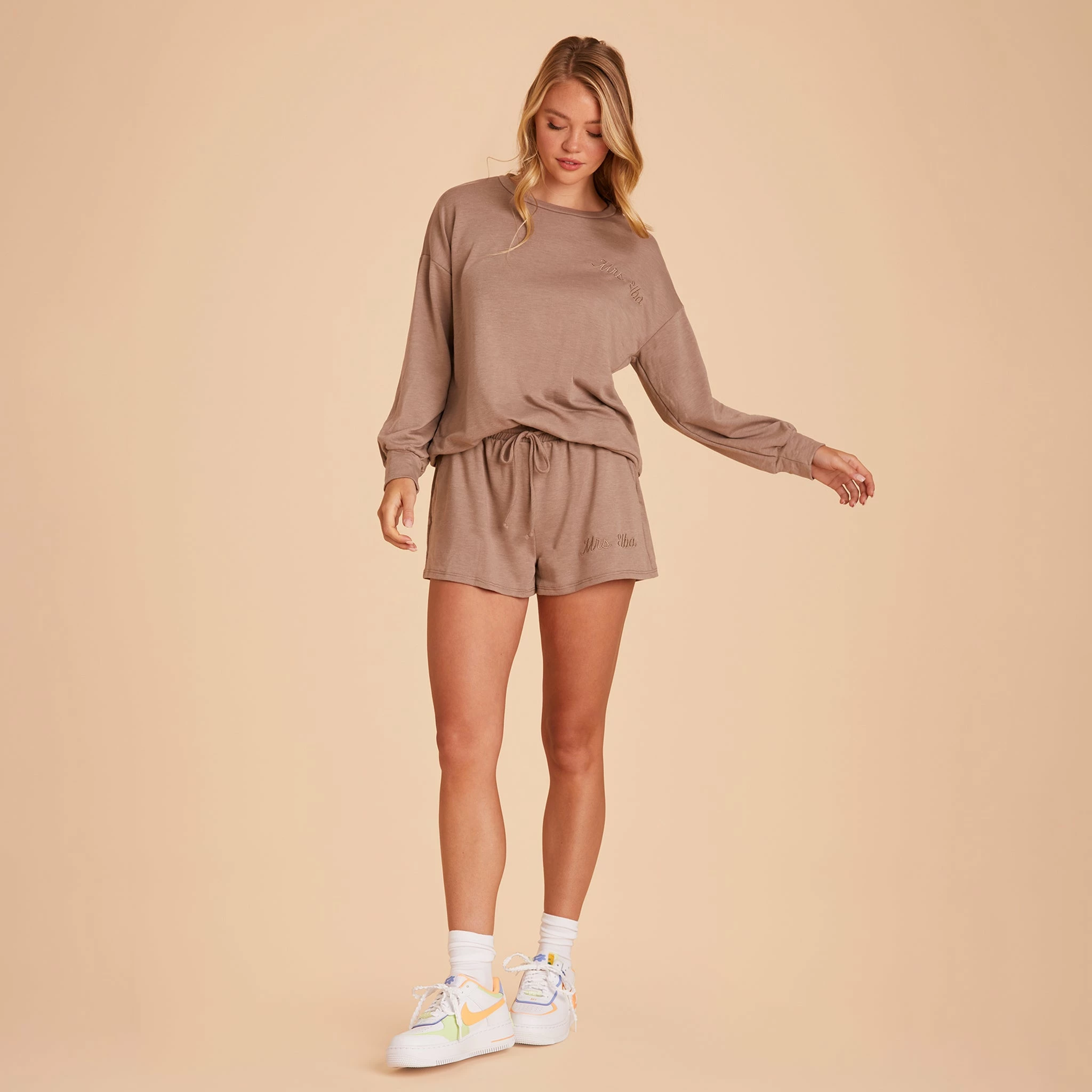 Chill brides, this one’s for you. Getting ready photos have never been more laid-back than with coordinated, personalized sweatsuits. These shorts pair beautifully with our crew neck sweatshirts and zip up hoodies.
