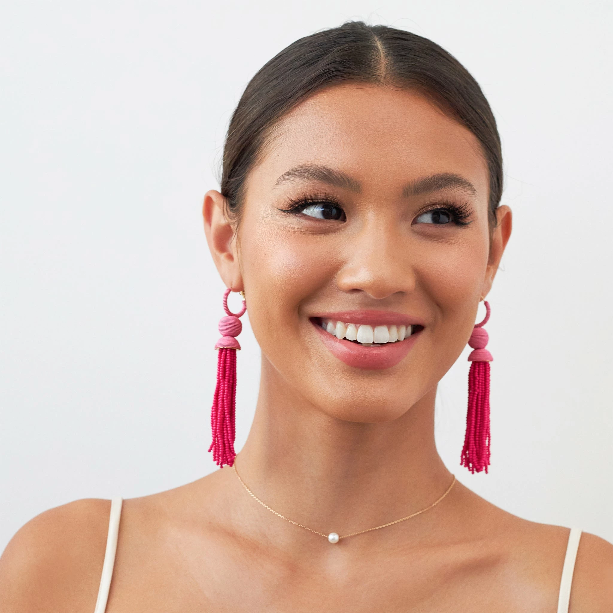 We love these flirty, beaded tassel earrings. They’re about as on-trend as you can get and are wearable year-round. Wear them in the summer with a playful vacation ensemble or rock them with cozy sweaters all winter long. We highly recommend an up-do to let them really sway and shine!