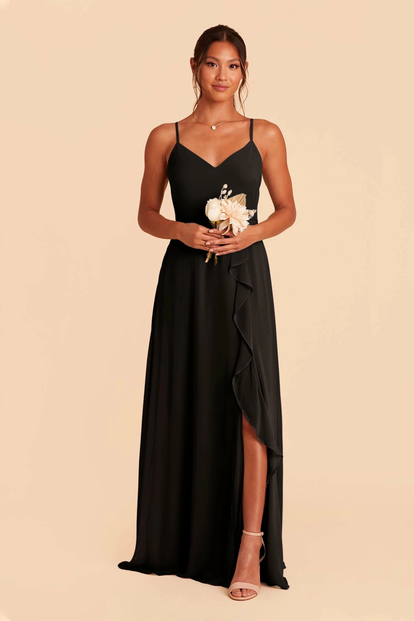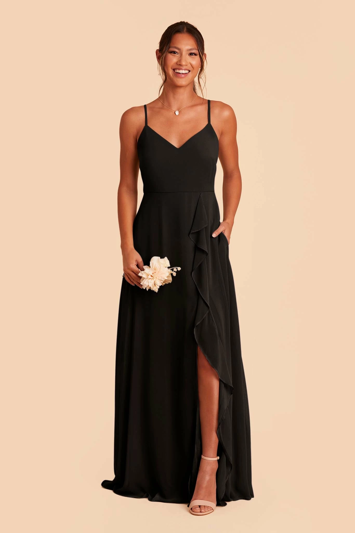 Timeless style, meet ultimate breathtaking details. We think you’ll be the perfect match. The downright class of this understated, super flattering bodice paired with a chiffon ruffle cascading down the leg slit gives a waterfall effect while you strut down that aisle. You still get all the side-slit sass, just elegantly softened with a feminine ruffle. Talk about the best of both worlds. Plus, the adjustable spaghetti straps with two ways to wear give you all the comfy options to make sure you’re dancefloor-ready all night long.