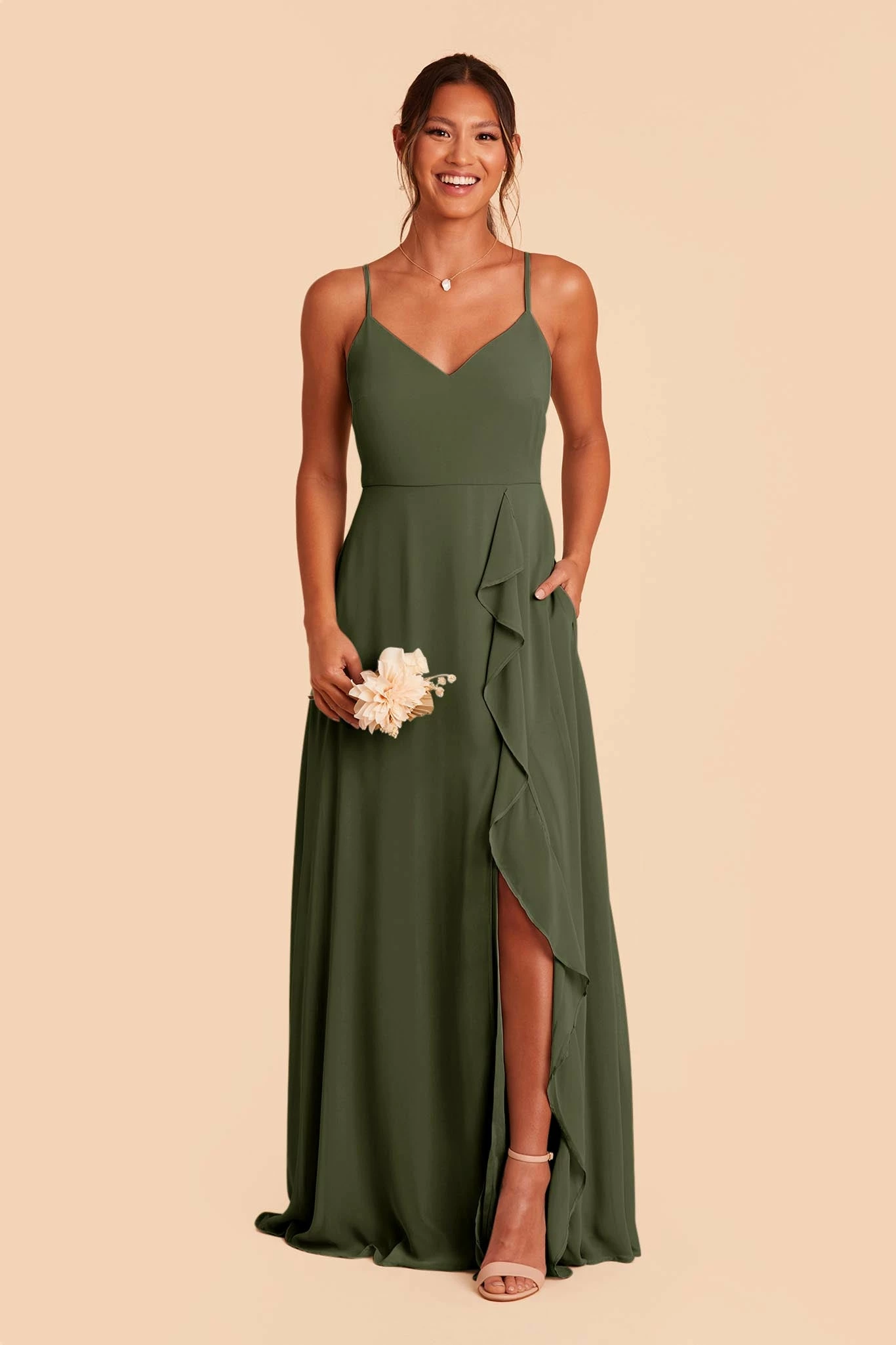 Timeless style, meet ultimate breathtaking details. We think you’ll be the perfect match. The downright class of this understated, super flattering bodice paired with a chiffon ruffle cascading down the leg slit gives a waterfall effect while you strut down that aisle. You still get all the side-slit sass, just elegantly softened with a feminine ruffle. Talk about the best of both worlds. Plus, the adjustable spaghetti straps with two ways to wear give you all the comfy options to make sure you’re dancefloor-ready all night long.